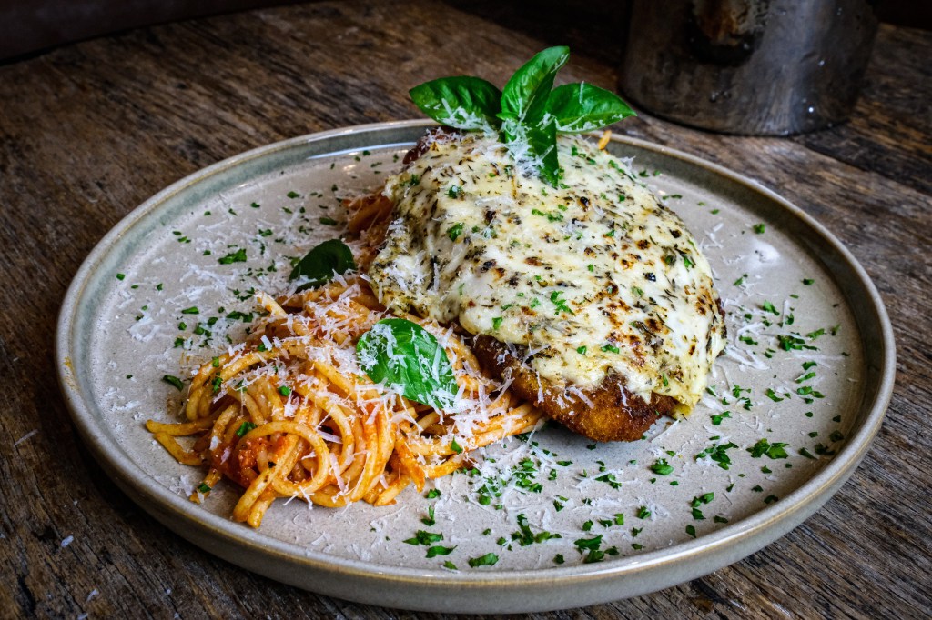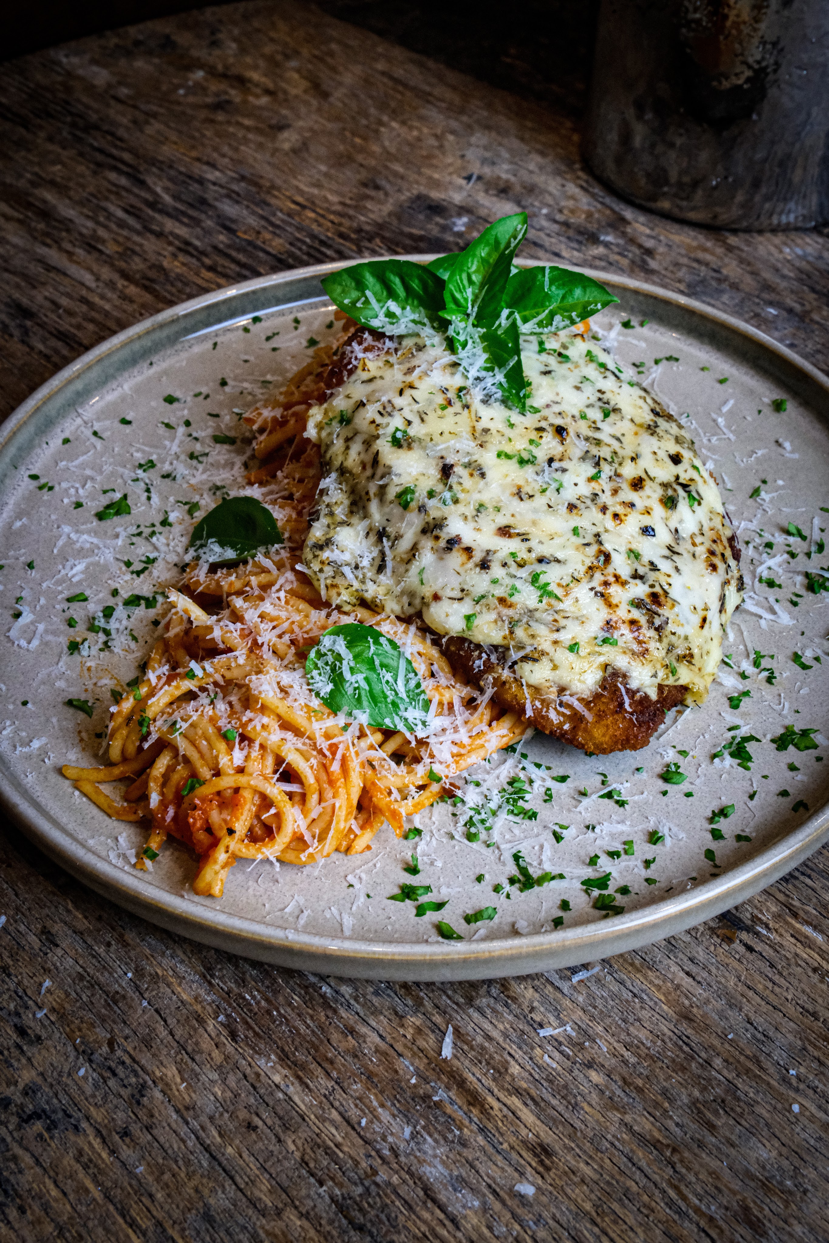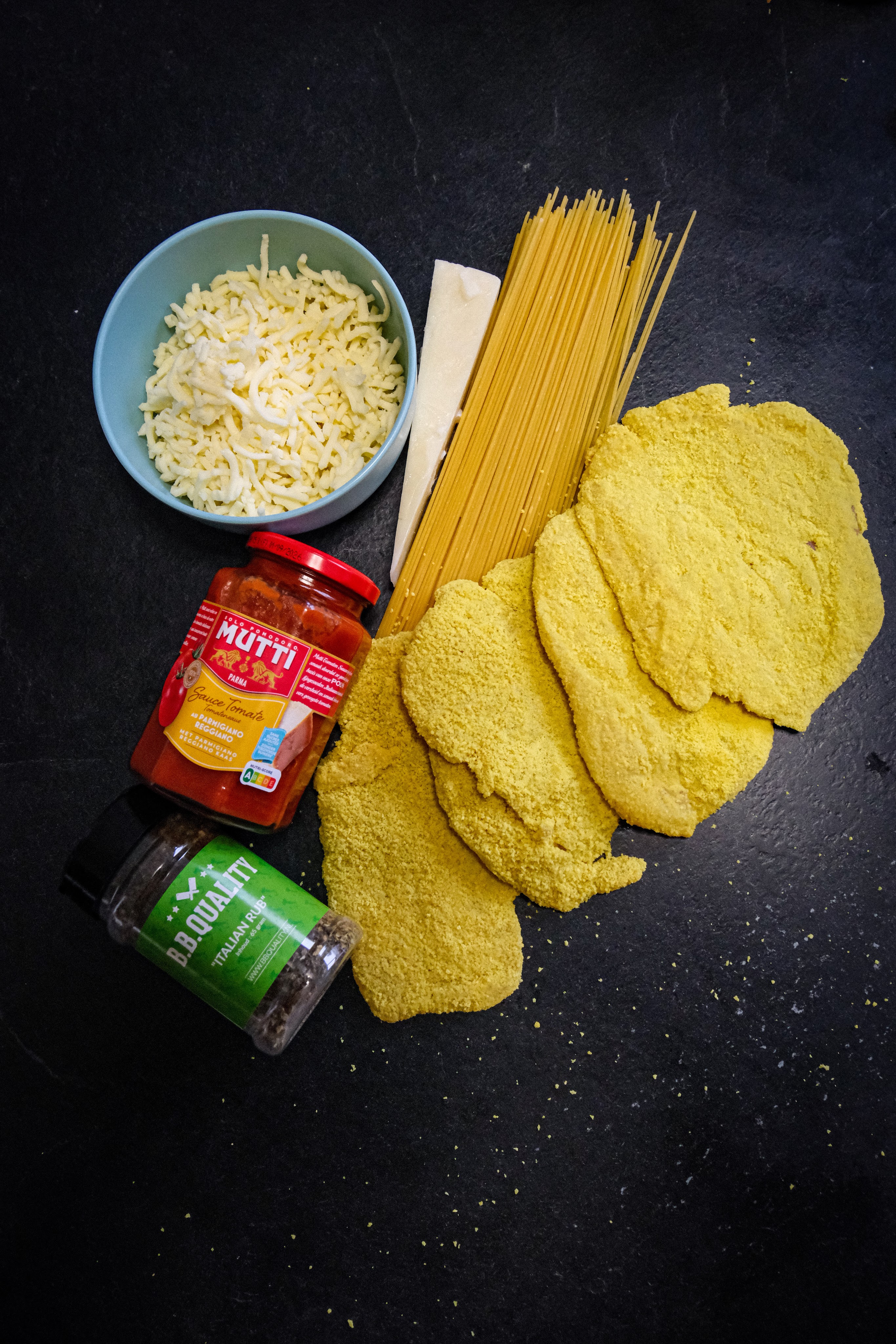 Een simpele versie van de amerikaans italiaans gerecht chicken parm. Of te wel chicken parmesan krokante kipschnitzels getopt met pasta saus en Parmezaanse kaas samen met spaghetti.