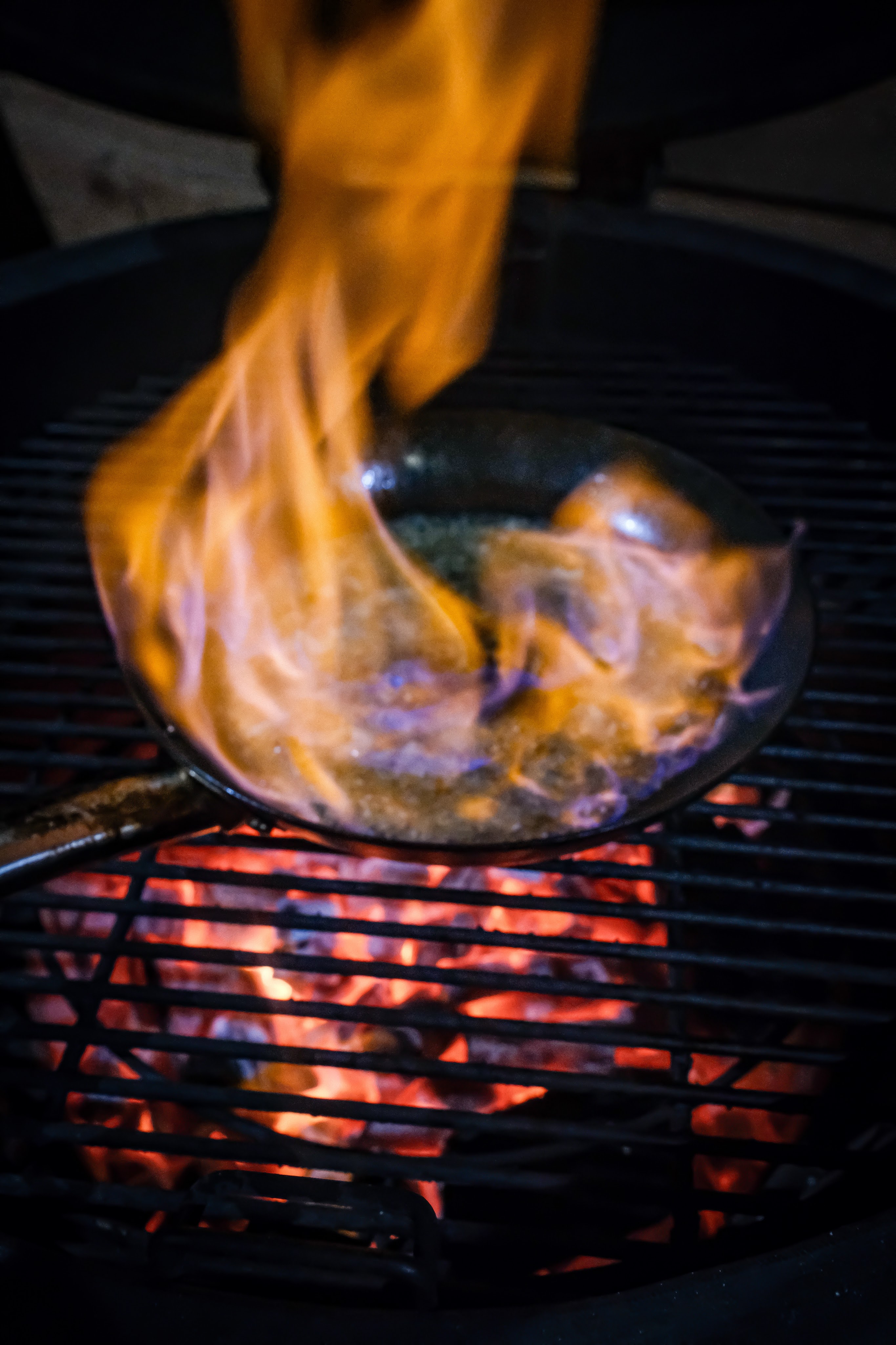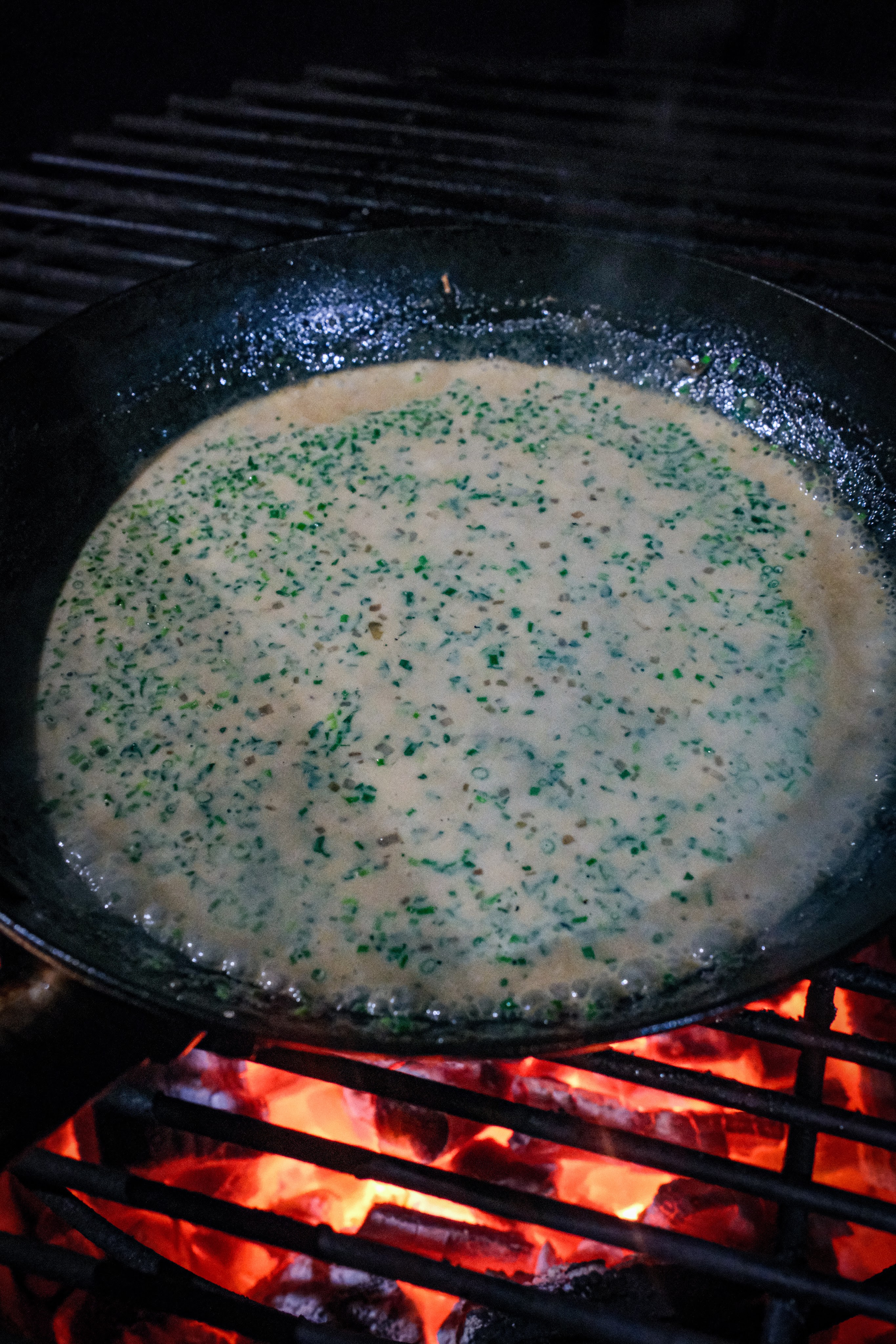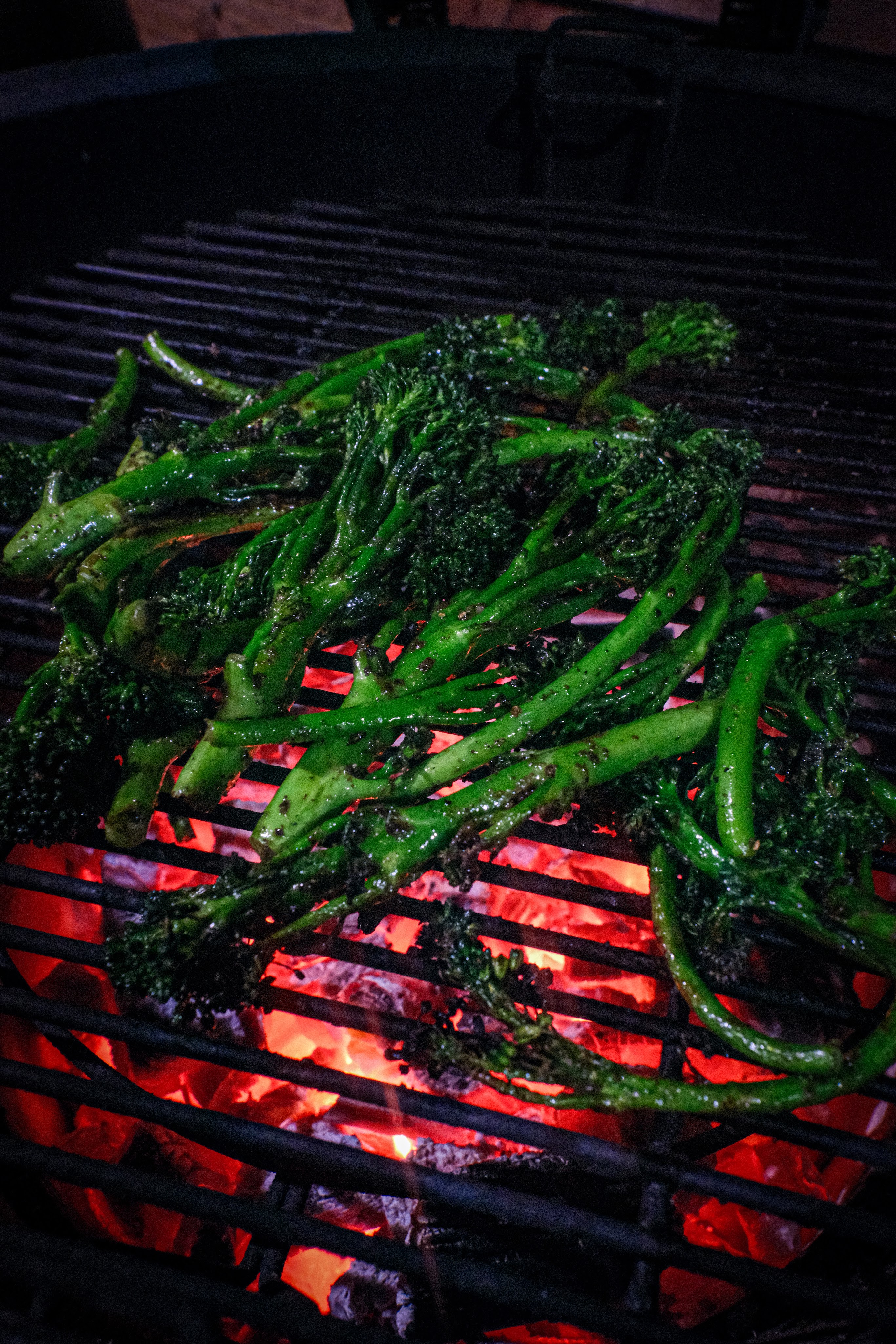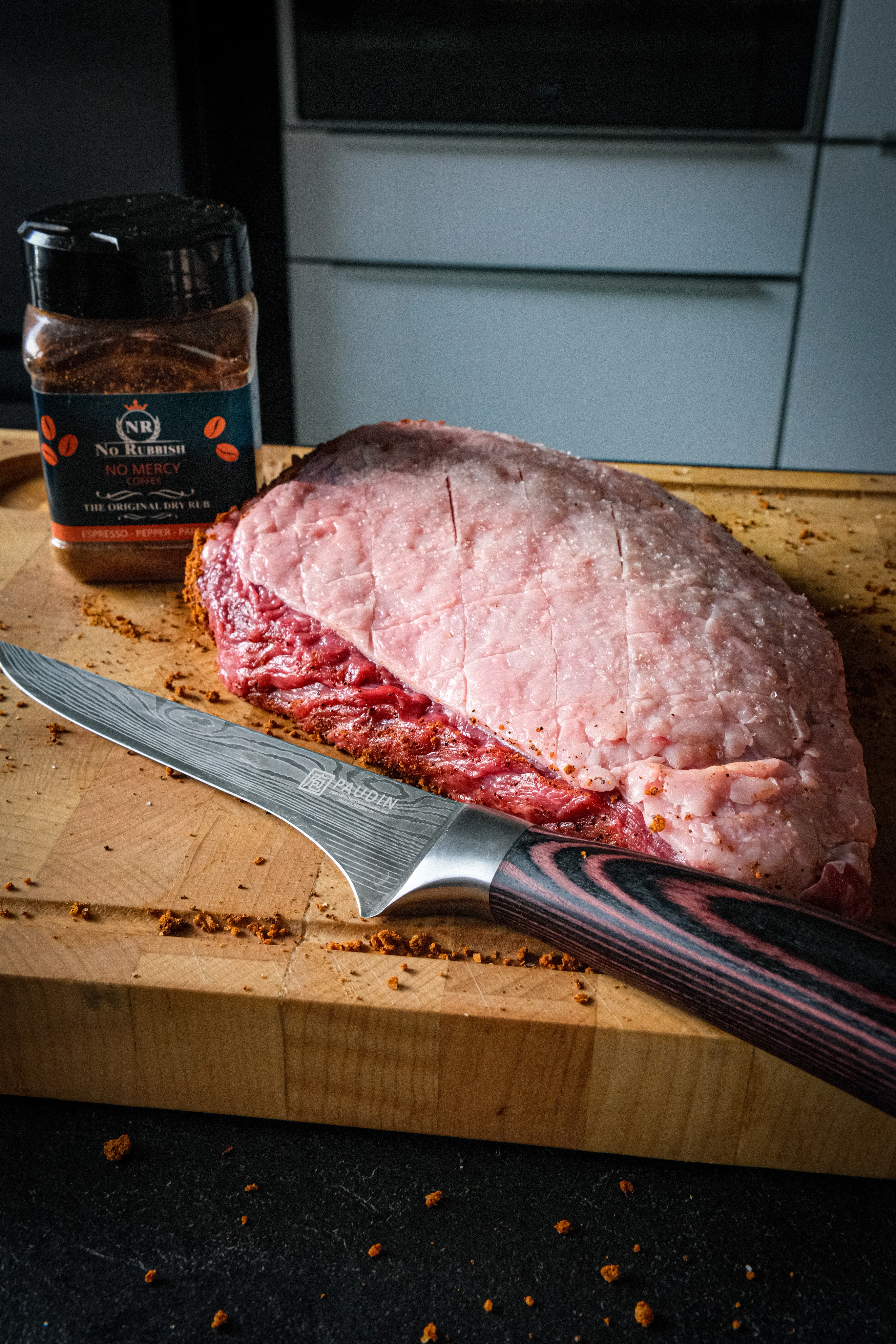 Snij wat overtollig vet van de picanha en bewaar dat dit gaan we later gebruiken bij de saus. Snij de rest van het vet kruislings in en smeer deze in met zout. Doe de no mercy rub op de vleeskant van de picanha en leg deze met vet kant naar boven op de indirecte zijden van de bbq. Gaar deze nu tot een kerntemperatuur van 48 graden. Als deze behaald is grill dan de picanha boven de directe zijden af tot een kern van 52 graden en haal deze dan van de bbq en laat deze rusten onder aluminiumfolie. Snipper onder tussen dat de picanha aan het garen is de sjalot en hak de knoflook fijn. Snij de bieslook en peterselie fijn. Zet als de picanha van de bbq is een skillet op de directe zijn en laat deze heet worden. Doe hier dan de afgesneden vet van de picanha in en laat deze smelten. Haal het overgebleven harde vet uit de pan en bak hier de gesnipperde sjalot in aan tot glazig. Giet de cognac erbij en laat deze bijna helemaal inkoken pas op de cognac kan vlam pakken laat deze dan gewoon uitbranden. Doe daarna de fond en knoflook erbij en laat deze inkoken tot deze dikker wordt dan mag de mosterd erbij en doorgeroerd worden. Daarna mag er een scheut slagroom bij en de helft van de peterselie en bieslook en breng op smaak met peper en zout. Zet nu de saus apart. Meng de bimi met the hulk rub en een beetje olie en grill deze nu op de directe zijden voor ongeveer 6 minuten en haal van de bbq.