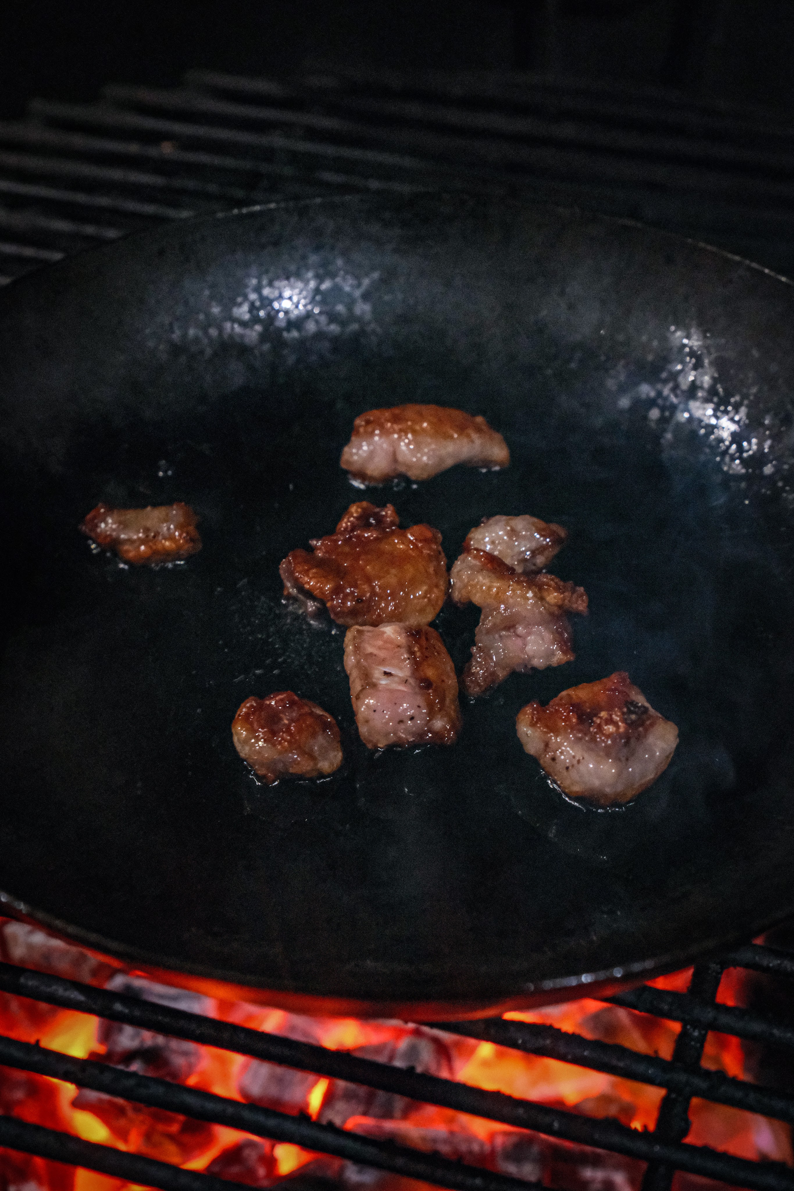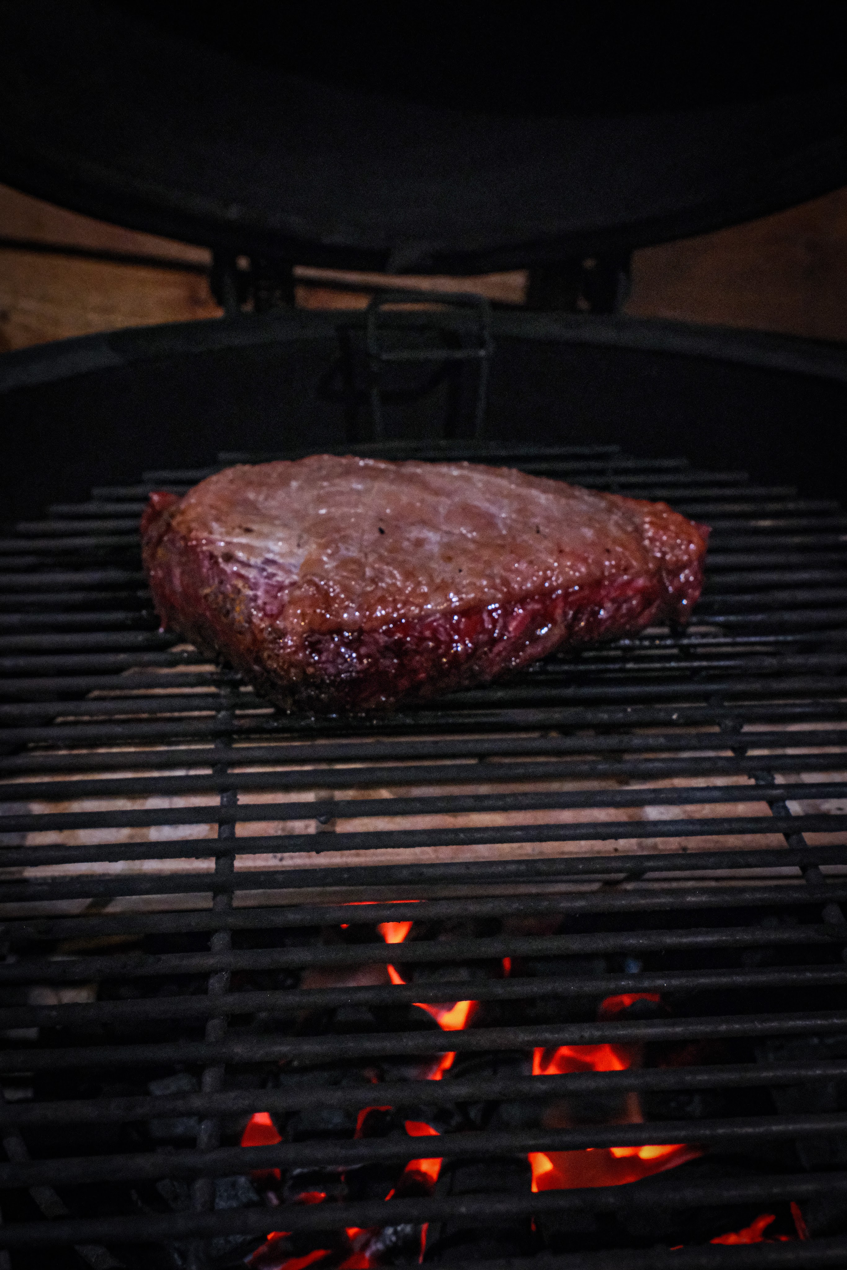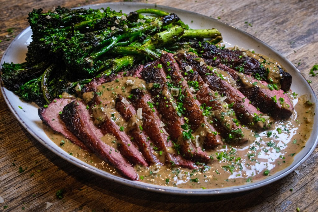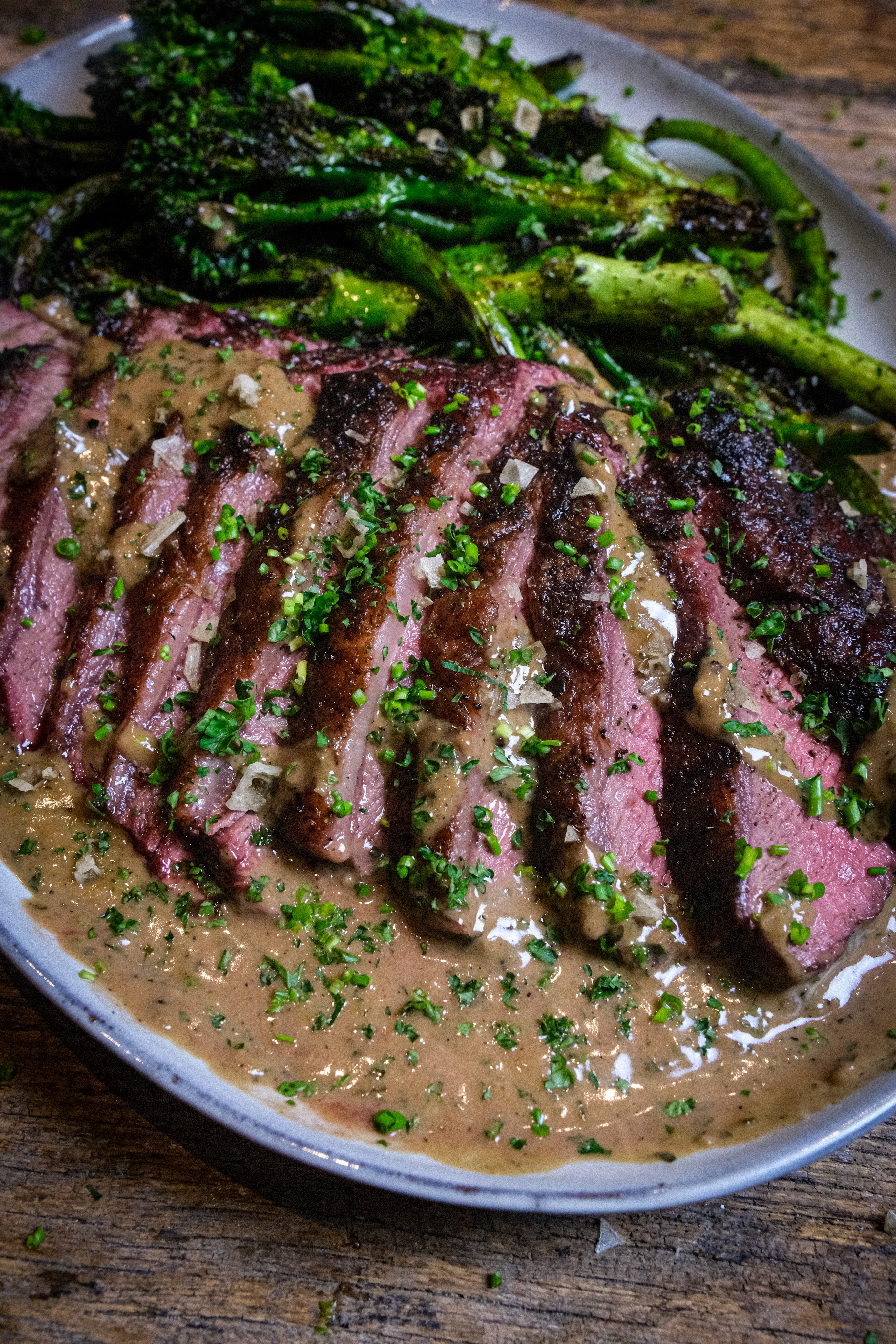 Heerlijke reverse sear picanha met een mooi saus van cognas en mosterd samen met gegerilde bimi.