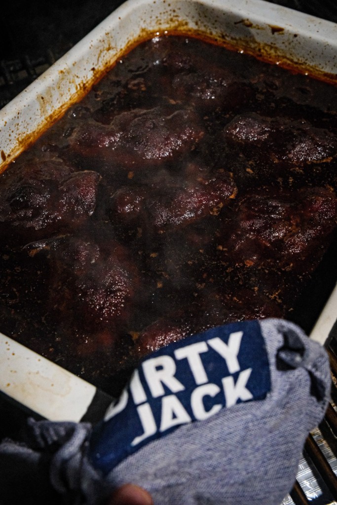 Verwijder eerst aan een kant van de wangen die zilvervlies als deze er nog opzit en doe de rub over de wangen. Rook nu de wangen met het rookhout voor 1 uur op het rooster van de bbq. Na dat uur mogen de wangen in de ovenschaal met de rest van de ingrediënten en mag je die afdekken met aluminiumfolie. Breng de bbq nu naar de 130 graden en laat deze nu 2 uurtjes stoven. Kijk na de 2 uur of de wangen al vrij zacht aanvoelen door erin te prikken voel je nog veel weerstand dek dan weer af en gaar verder tot je nog maar een beetje weerstand voelt. Als dat zo is mag de folie eraf en mogen ze nog 1 uur op de bbq in de schaal zodat de saus mooi kan indikken. Als de saus mooi is ingedikt en lekker plakkerig is en de wangen zijn mooi zacht dan mogen ze van de bbq.