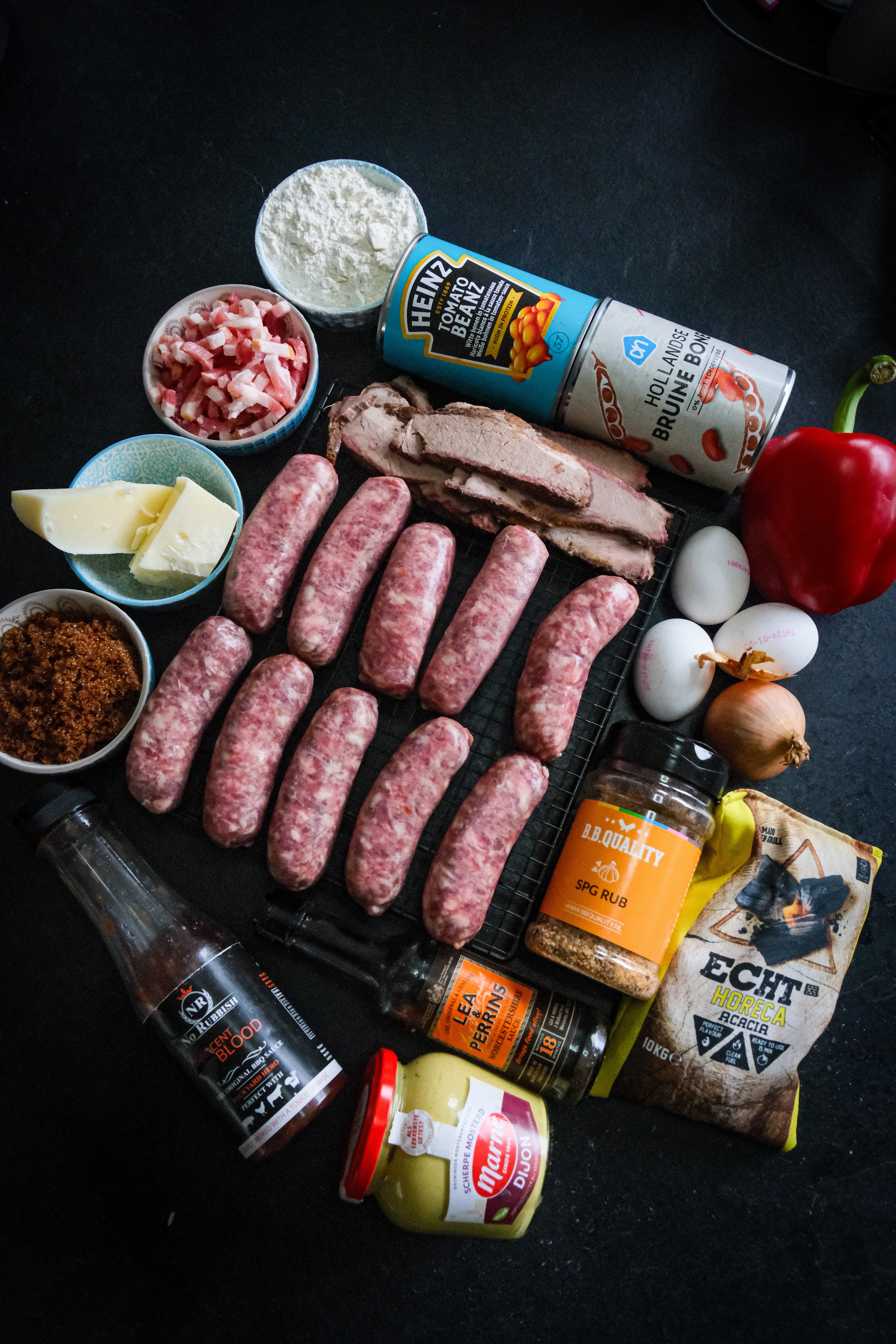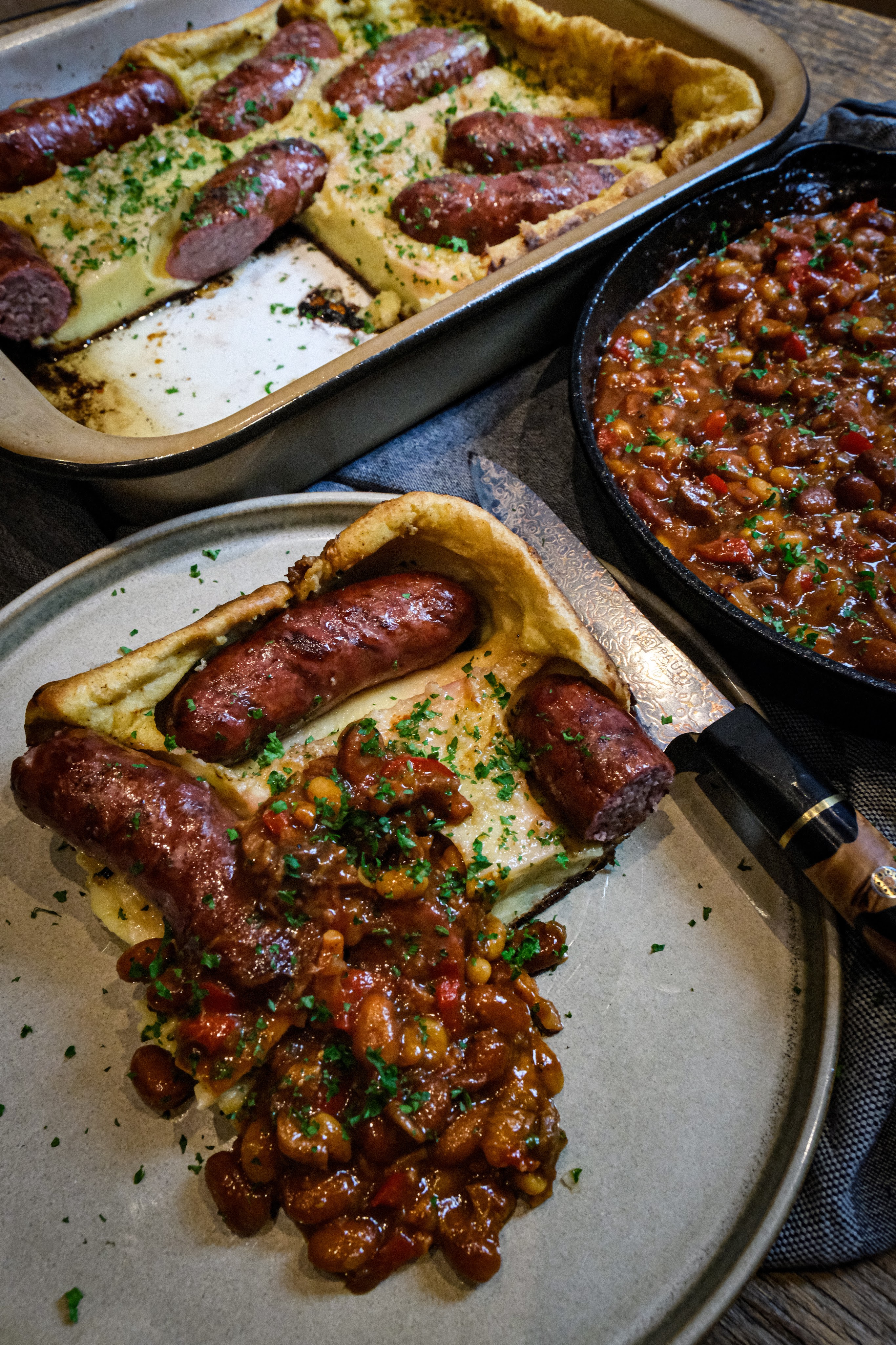 Toad in the hole met lekker sappige gerookte worsten om hem toch net wat anders te maken. Samen met een van de meeste favoriete side dishes uit amerika de baked beans maakt die heel heel goed en voedzame maaltijd.