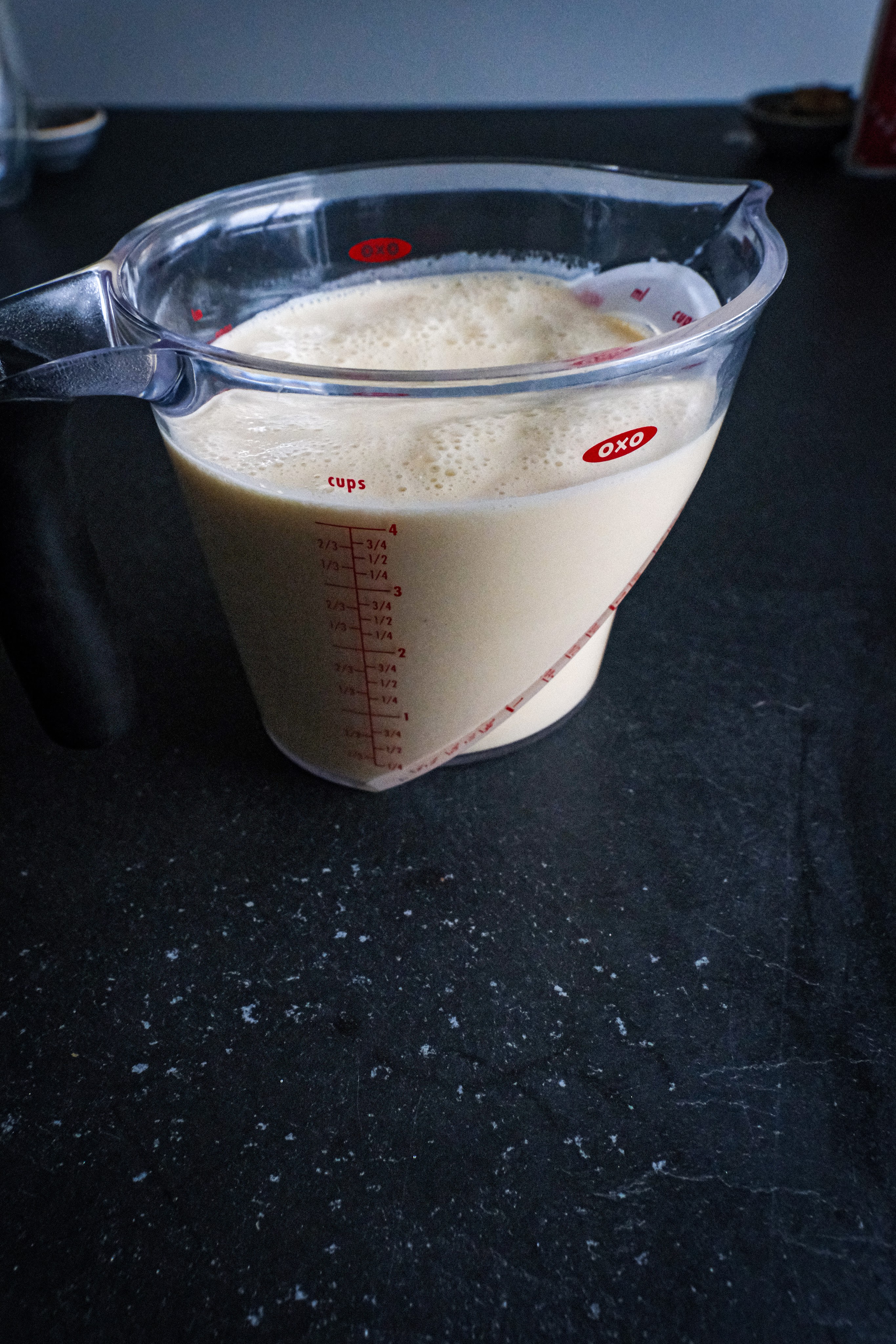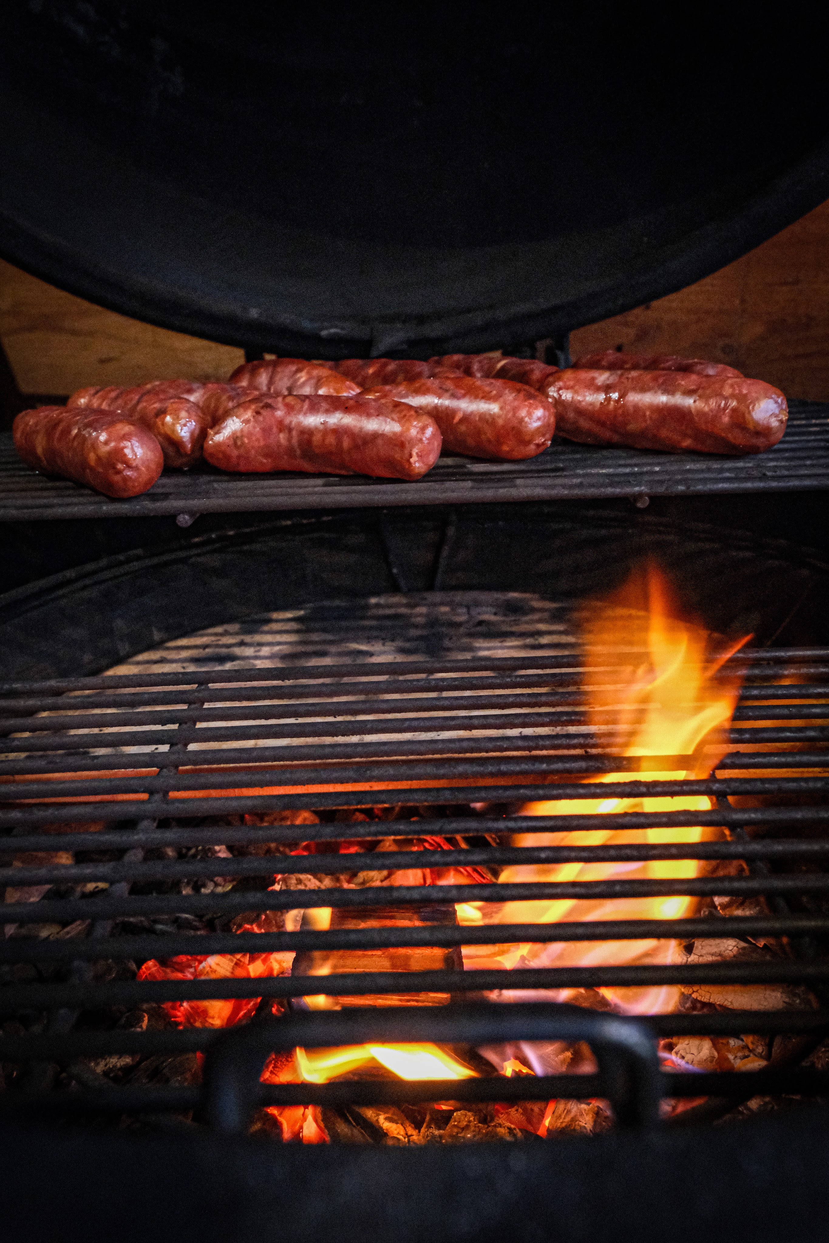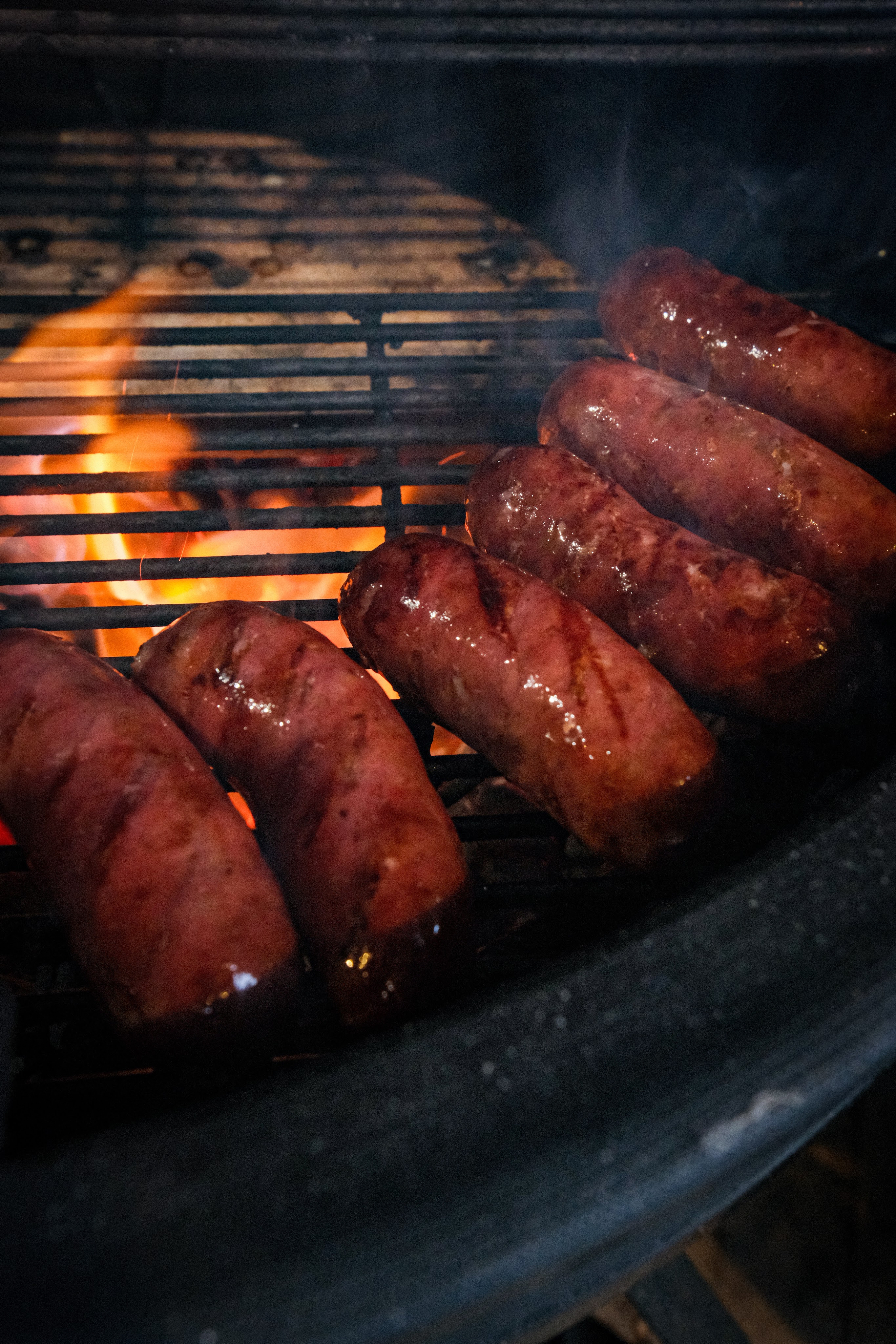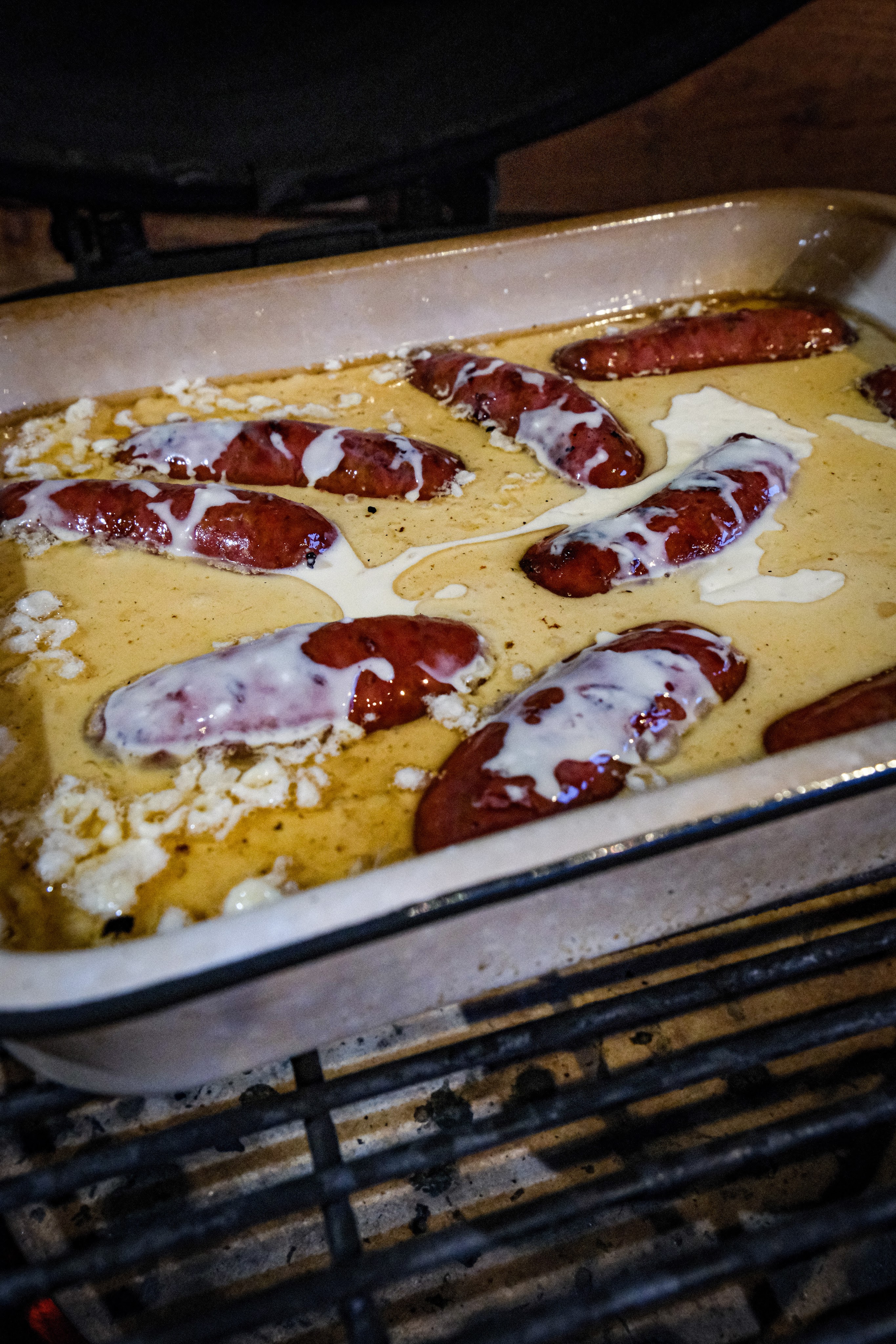 Haal de worsten alvast s’morgens of de avond ervoor uit de verpakking en laat deze dan in de koelkast aan de lucht drogen tot gebruik. Als de bbq klaar is doe de rookhout dan op de kolen en leg de worsten op de rooster en rook ze nu voor 1 uur op de indirecte zijden. Maak nu het beslag voor de toad in the hole doe hiervoor alle drogen ingrediënten in de kom en doe de eieren en de melk erbij. Roer dit nu met de garde tot een glad beslag en giet dan het water erbij en klop dit nog een keer door en zet apart. Na het uur haal dan de worsten van de bbq en zet dan twee skillets of 1 grote ovenschaal op de indirecte zijden en doe hier de beef tallow in. Breng nu de bbq naar 220 graden zodra de bbq de temperatuur behaald heeft en de beef tallow goed heet is. Zorg dan dat je de worsten en beslag paraat hebt staan. Doe de worsten zo snel mogelijk in de skillets of ovenschaal en giet er de beslag overheen en doe de deksel dicht. Laat de deksel nu zeker 25 minuten dicht daarna kun je voorzichtig kijken is de toad in the hole mooi gekleurd dan mag hij van de bbq anders mag hij nog een paar minuten. Haal hem daarna van de bbq hij zal in het begin volledig opgeblazen zijn maar zakt daarna we wat in.