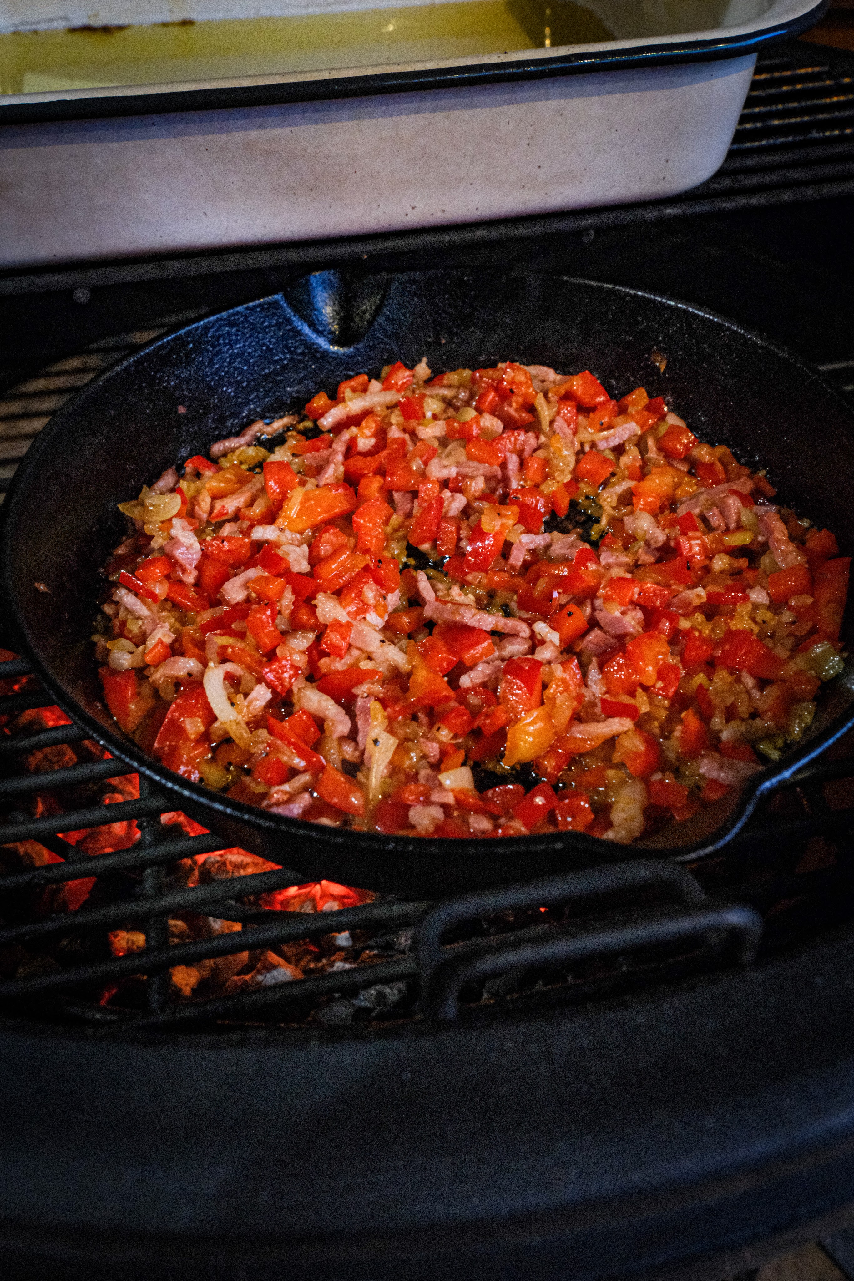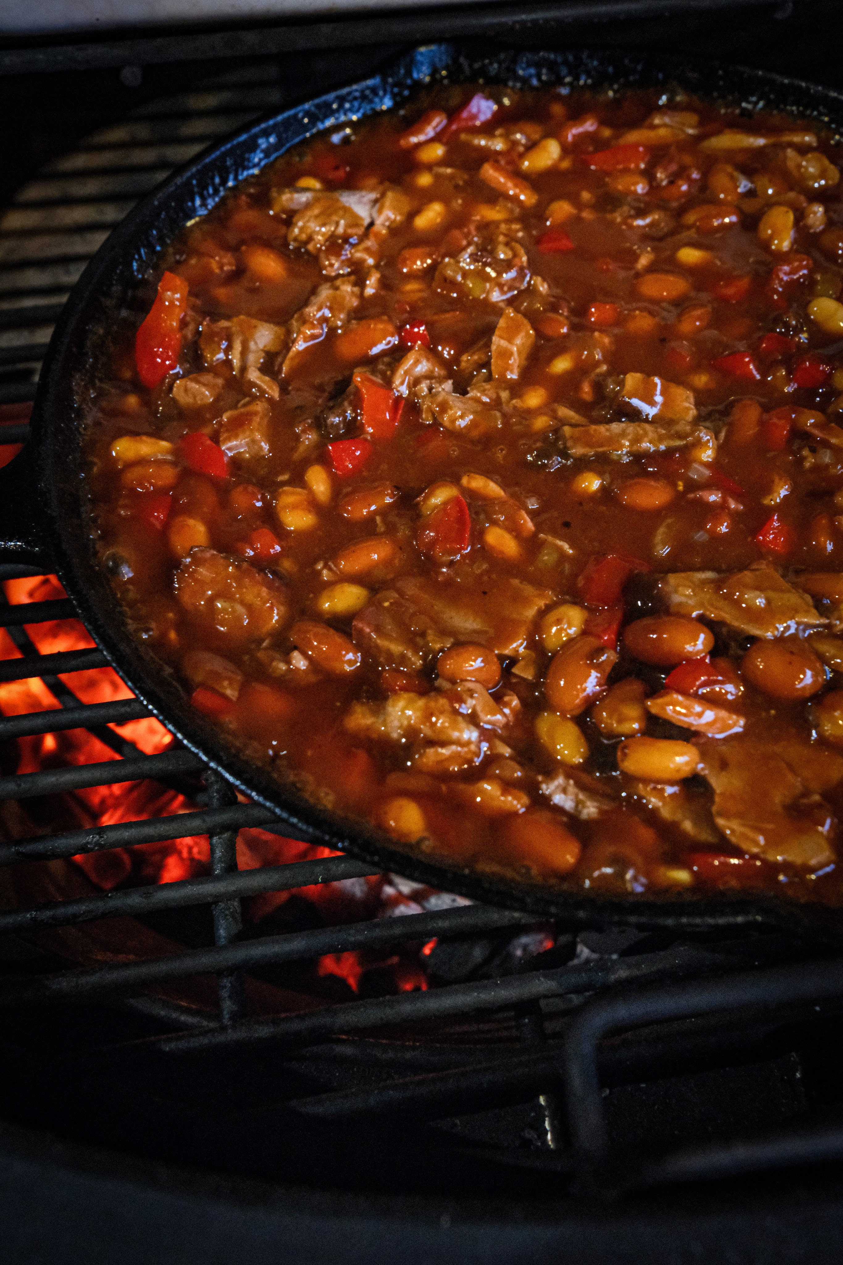 Voor de baked beans snipperen we de ui en snijden we de paprika in kleine blokjes en giet de bruine bonen in een zeef en spoel deze af. Zet een skillet op de directe zijden als de bbq 220 graden is en smelt hier de beef tallow in. Als die gesmolten is mogen de spekblokjes erin en bak deze rustig uit dan mogen de ui en paprika erbij en bak deze ook tot de paprika zacht is en de uien licht gekleurd zijn samen met de spg rub. Doe nu de basterd suiker, mosterd, bbq saus en worcestershire saus eraan toe en roer dit er doorheen. Doe nu de bonen erbij en breng aan de kook laat de saus een klein beetje dikker worden. Voeg nu als je brisket hebt deze eraan toe maar hoeft niet zonder is hij ookal lekker. Breng hierna op smaak met eventueel extra spg rub.