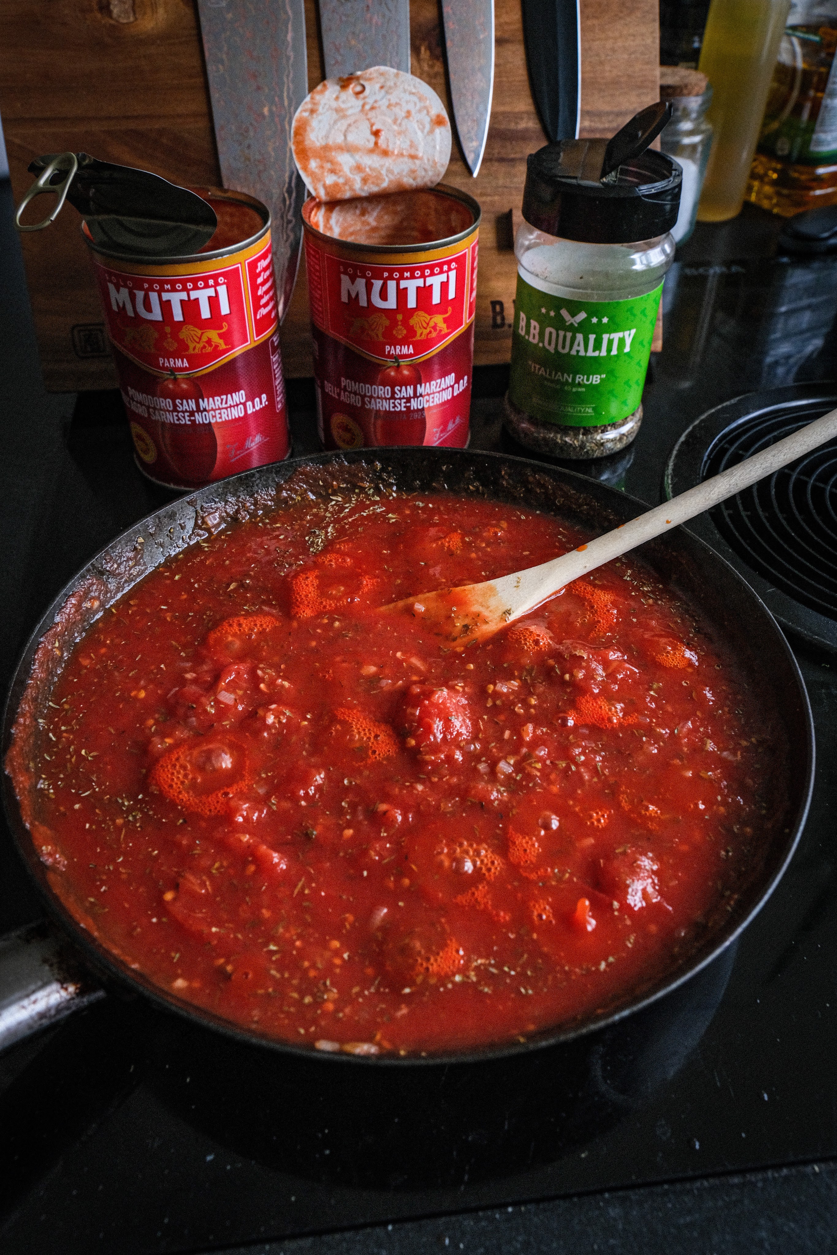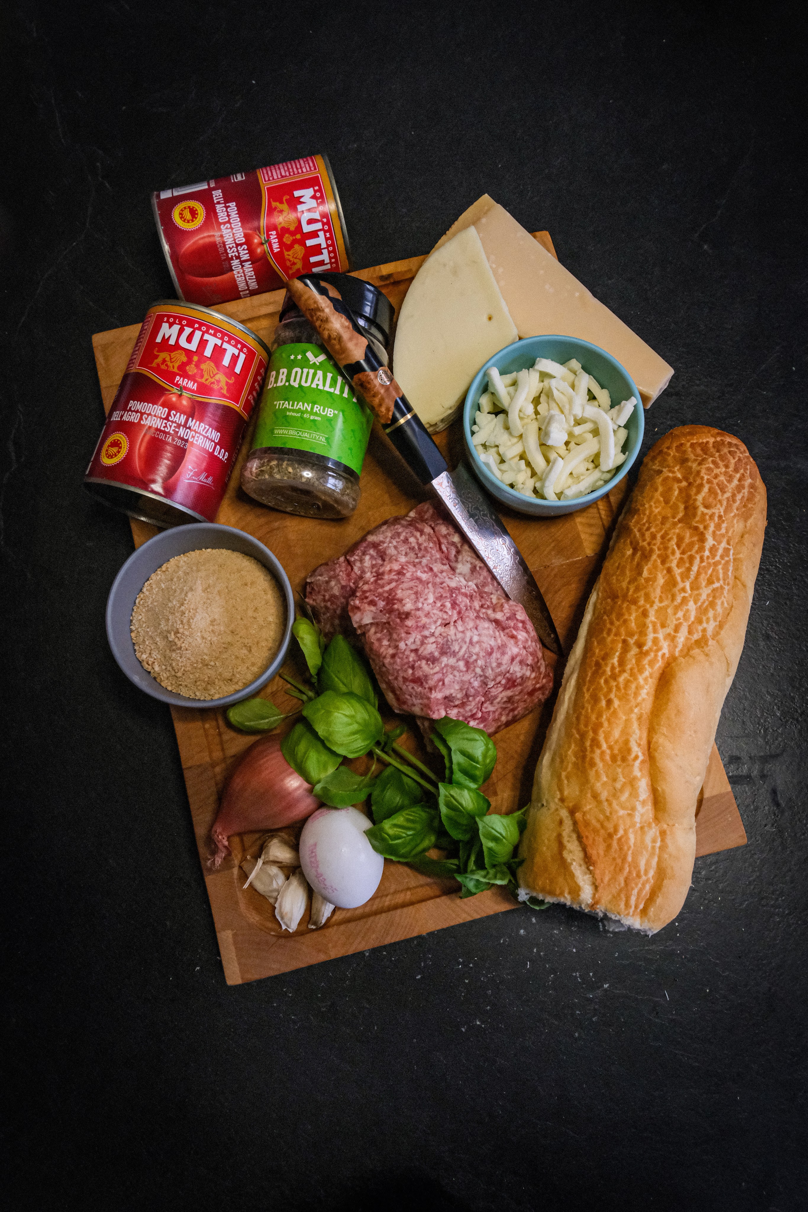we maken eerst de gekruide gehaktballen hiervoor mengen we het gehakt met de paneermeel, 50 gr. pecorino, 1 el. Italian rub en het water en kneed dit goed door elkaar. Mocht het te vast zijn voeg dan wat extra water toe. Verdeel ze nu in 9 gehaktballen van ongeveer 75 gr. per stuk. Snipper nu de sjalot en hak de knoflook fijn voor de saus. Fruit nu de sjalot en knoflook in een beetje olie aan tot ze glazig zijn dit kan op de bbq of op het fornuis. Zodra de sjalot glazig is voeg dan de san marzano tomaten en de rest van de italian rub toe. Doe nu het rookhout op de bbq en zet de skillet met saus en de gehaktballen los ervan op de bbq. Je kunt de gehaktballen op het rooster leggen of met een extra rooster boven de saus zodat de vleessappen lekker in de saus kunnen lekken. Rook alles nu tot de gehaktballen een kern van ongeveer 64 graden hebben dit kan ongeveer 1 uur duren. Als de kern behaalt is doe dan de ballen in de saus en doe er wat van de saus overheen. Meng de overige geraspte kazen door elkaar en verdeel deze over de ballen. Zet de skillet terug op de bbq en breng de temperatuur omhoog naar 200 graden en laat de skillet erop staan tot de kaas gesmolten zijn en haal de gehaktballen dan van de bbq. Bak ondertussen de stokbrood of harde broodjes af volgens aanwijzingen.