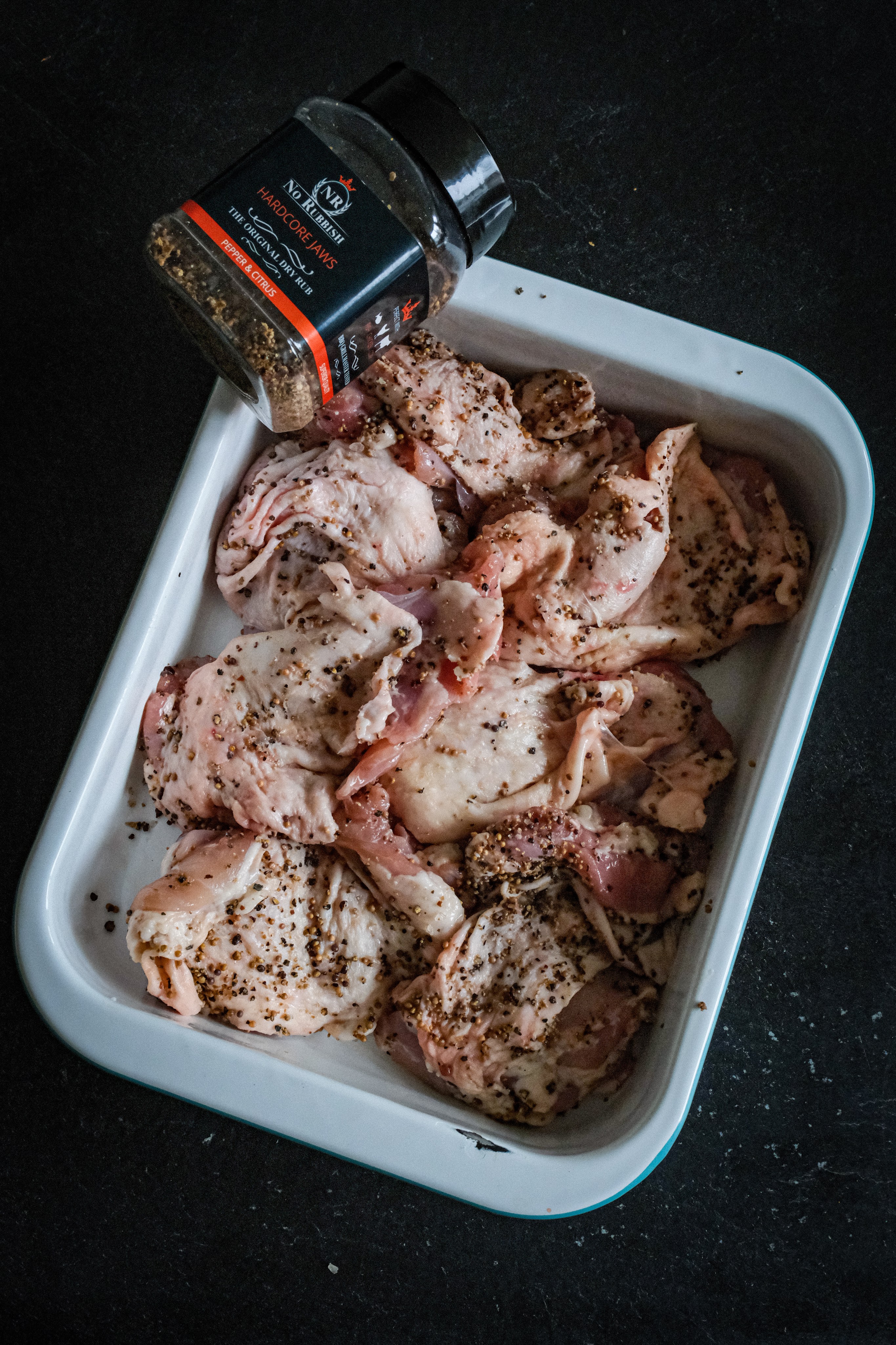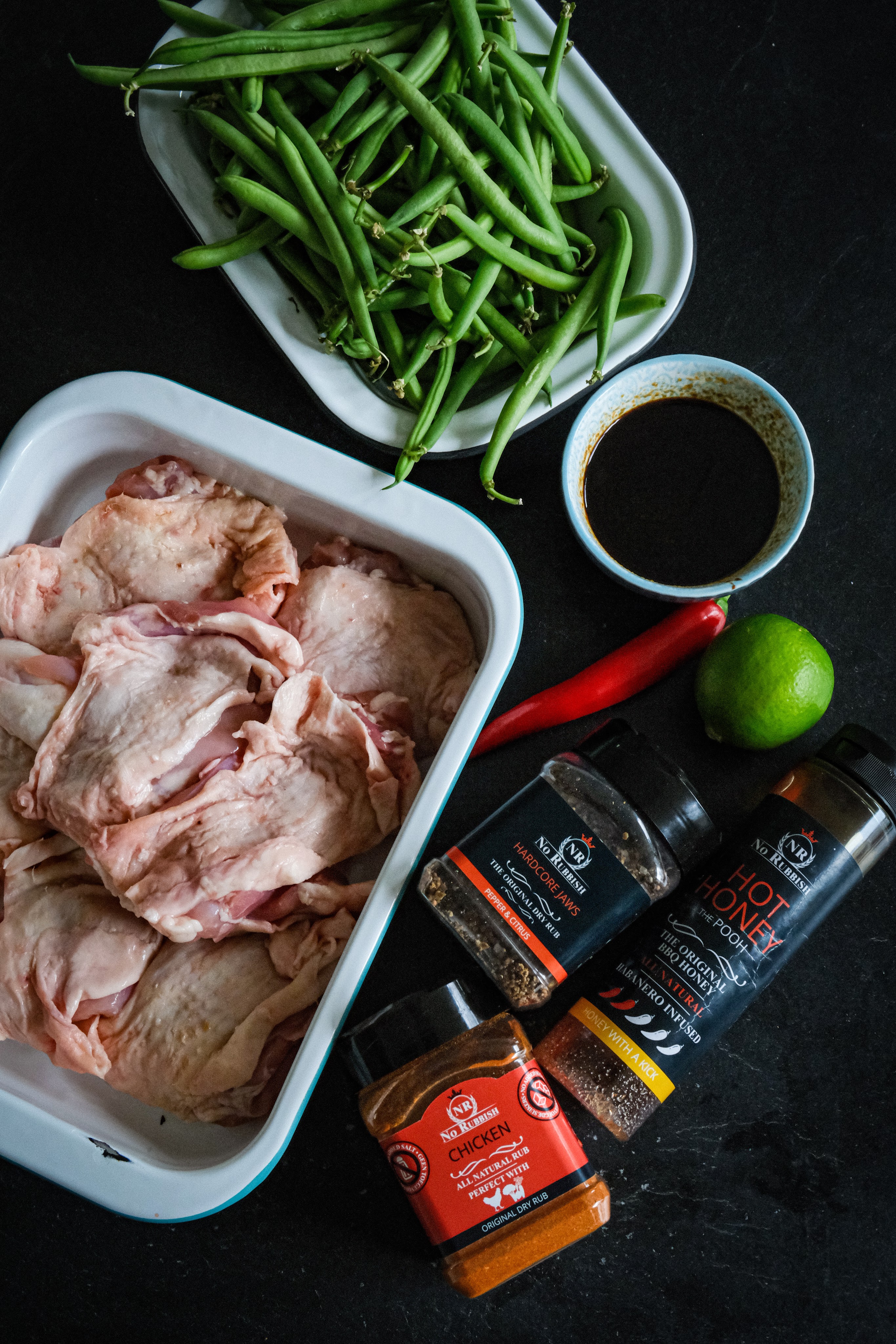 Snij eventueel overtollig vel van de dijen en voorzie de dijen van de hardcore jaws rub en zet deze aan de kant. Rasp de schil van de limoen en snij de rode peper en knoflook fijn. Maak de boontjes schoon en meng deze met een beetje olie, zout en de chickenrub. Bak nu de dijen op de huid kant aan in de skillet zodra deze mooi krokant is haal de dijen dan uit de pan. Fruit in dat vet de knoflook, rode peper en gemberpulp en voeg dan het sap en rasp van de limoen, hothoney, ketjap, sweet soja en de soja saus toe. Breng dit aan de kook en leg dan de dijen met vlees kant naar beneden in de saus. Gaar de dijen nu tot ze een kern van 72 graden hebben en de saus mooi stroperig is geworden. Grill ondertussen in de groente rek de boontjes tot ze gaar zijn draai ze regelmatig om verbranden te verkomen.