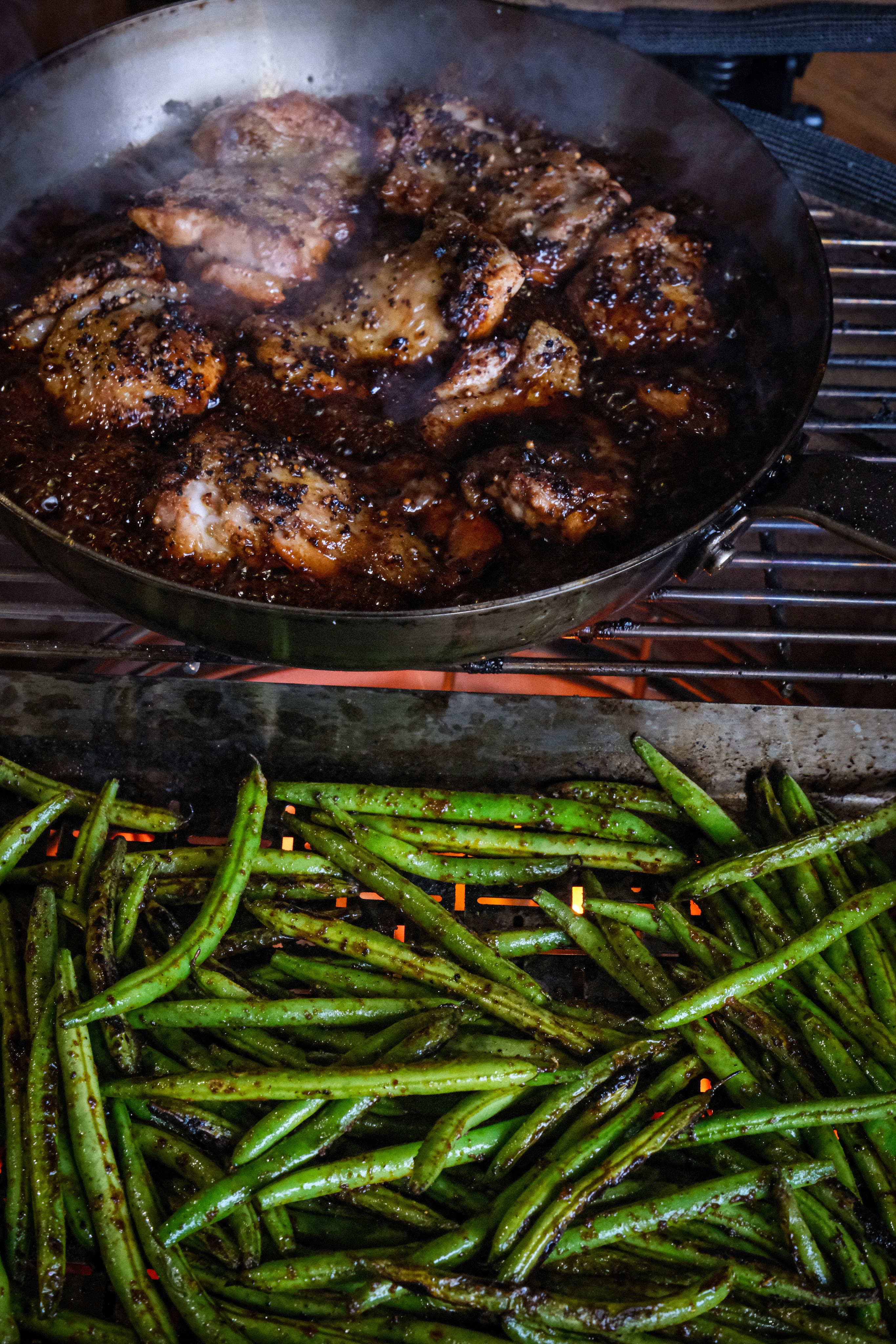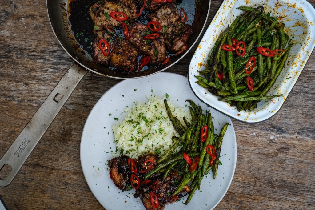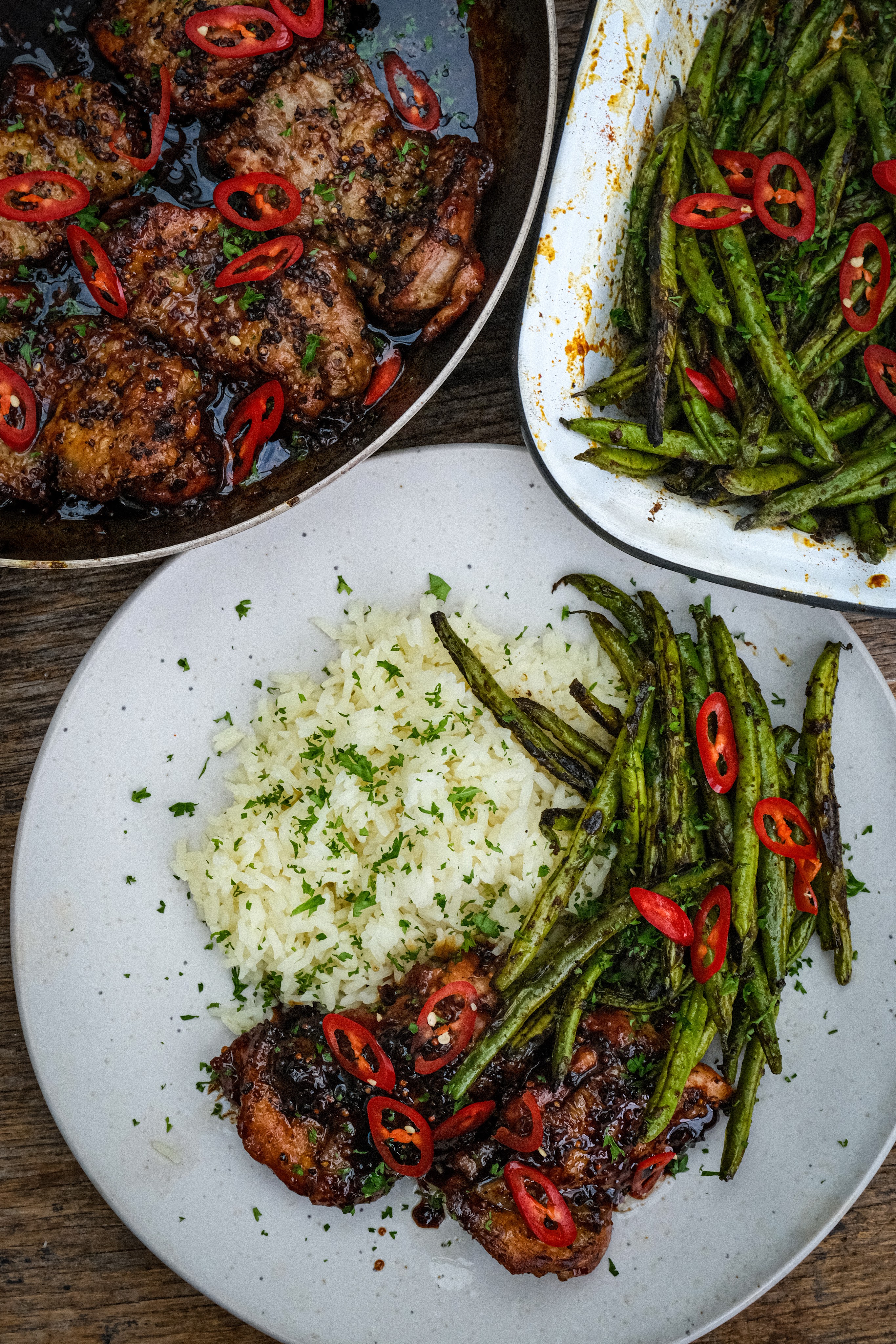 Heerlijke kippendijen met krokant vel en een zoet zure glaze. Samen met gegrilde boontjes en rijst is dit een lekker gerecht met veel smaak.