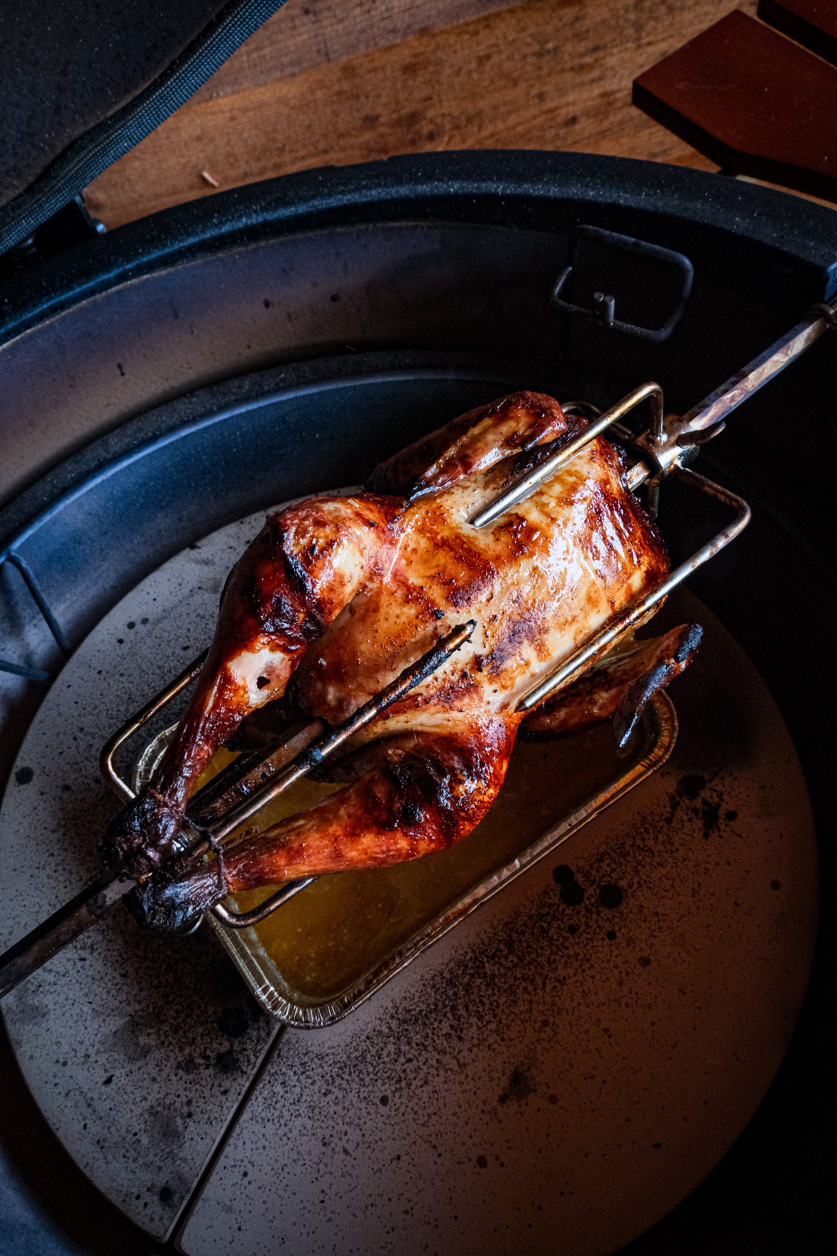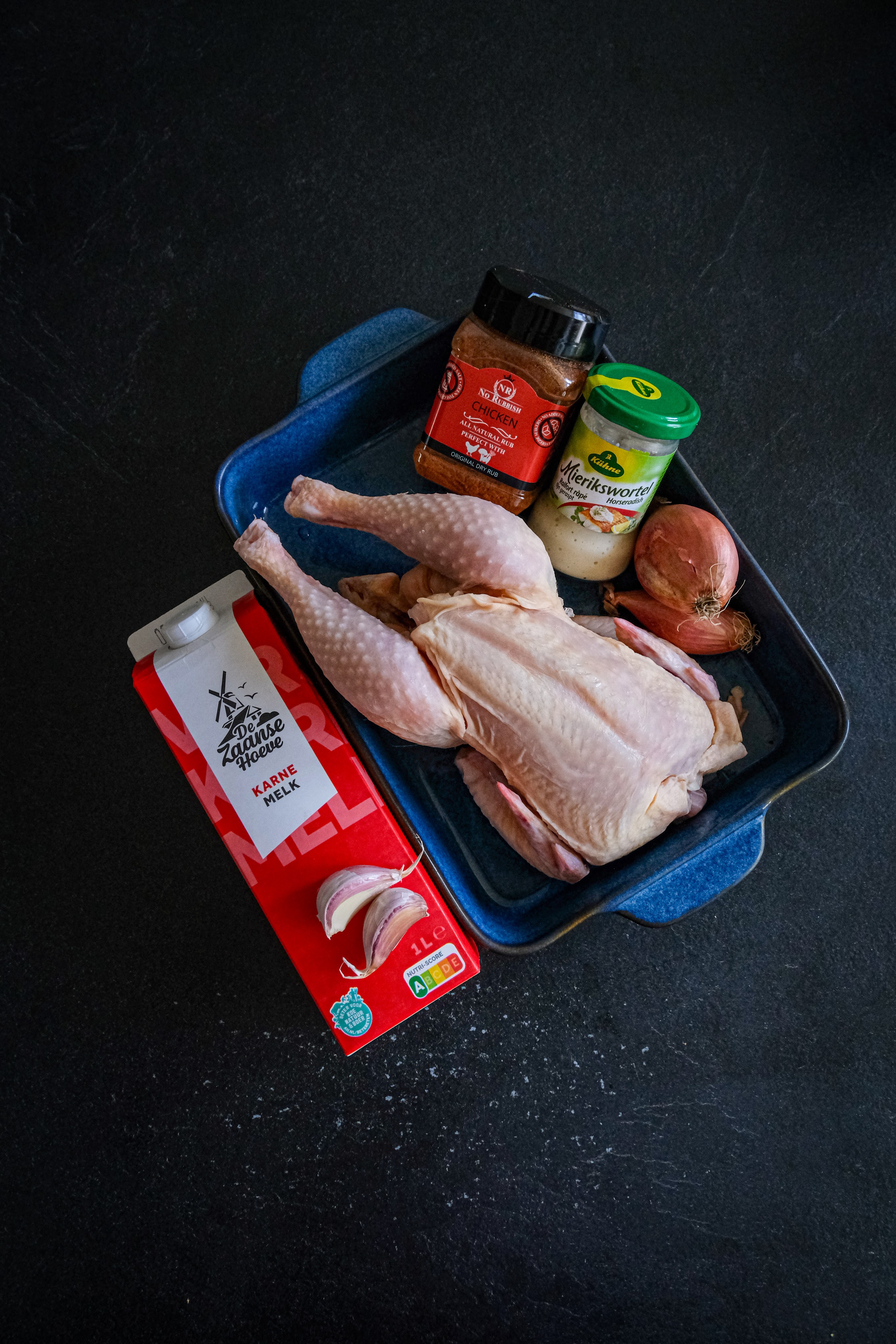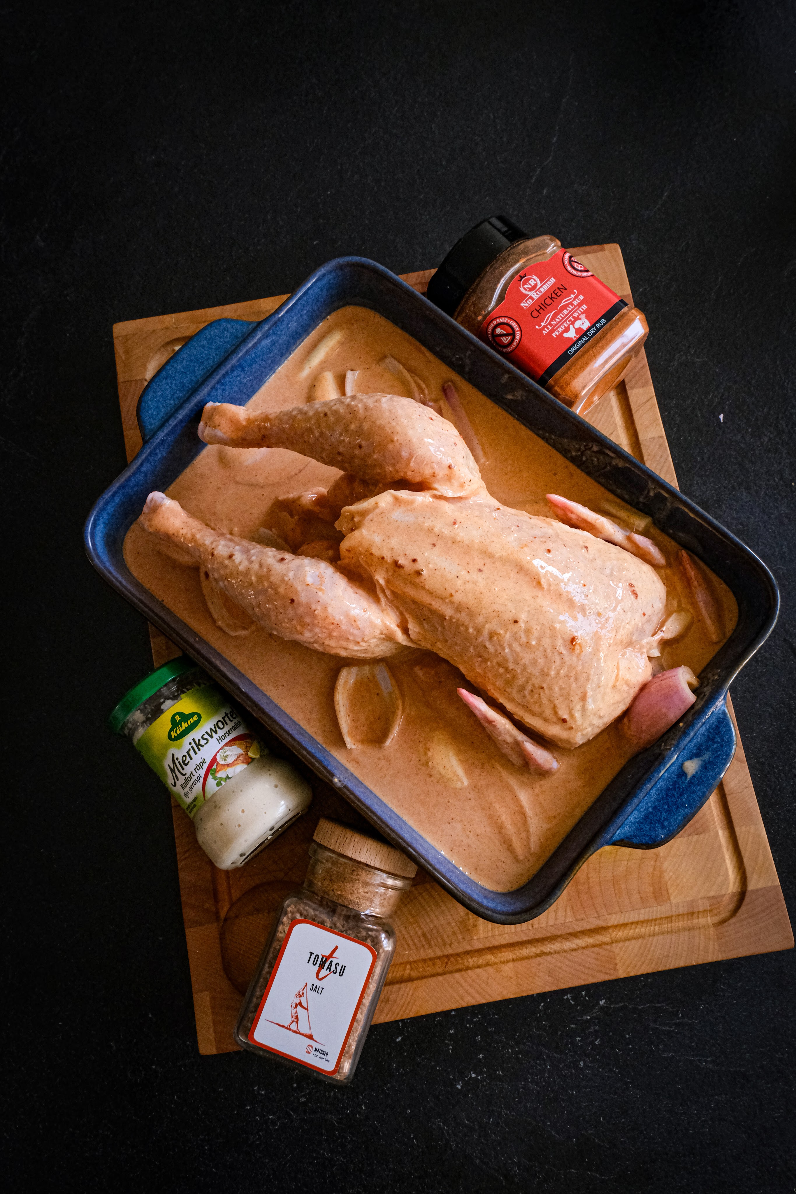Voor de marinade van de kip maken we de sjalotten en knoflook schoon. De knoflook pletten we en de sjalotten snijden we door midden en halen deze helemaal uit elkaar. Meng nu de karnemelk, rub, knoflook, mierikswortel, sjalotten en eventueel zout door elkaar. Giet deze marinade nu over de kip heen en zorg dat de marinade overal zit. Je kan de hele kip nu eventueel met de marinade ligt vacumeren en anders in een afgedekte schaal in de koelkast zetten en enkele keren per dag omdraaien in de marinade. Laat de kip minimaal 12 uur tot maximaal 48 uur marineren hoe langer hoe meer smaak. Haal de hele kip uit de marinade net voordat je hem gaat bereiden en laat deze goed uitlekken zodat er zoveel mogelijk van de marinade eraf is. Rijg de kip aan het spit en doe de spit op de bbq of als je geen spit hebt leg je de hele kip op het rooster. Zorg wel dat je een opvang bakje onder de kip hebt zitten met water erin. Gaar de hele kip nu tot een kern van 72 graden haal hem als die dat bereikt heeft van de bbq en laat hem rusten.