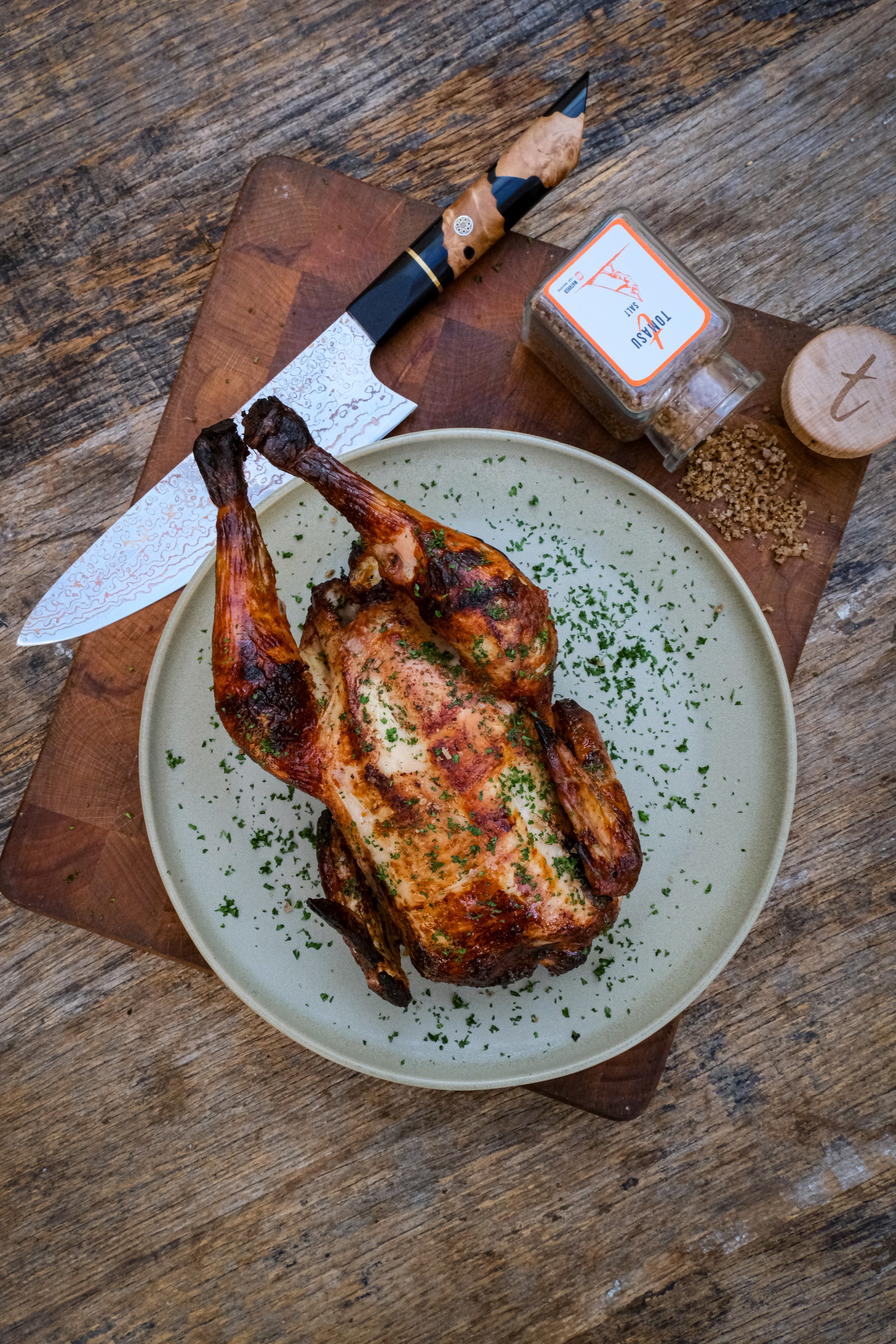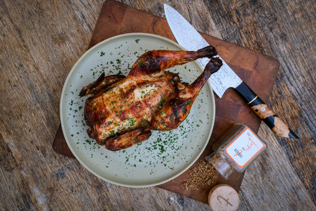 Na het rusten kun je de hele kip aansnijden. Eetsmakelijk.