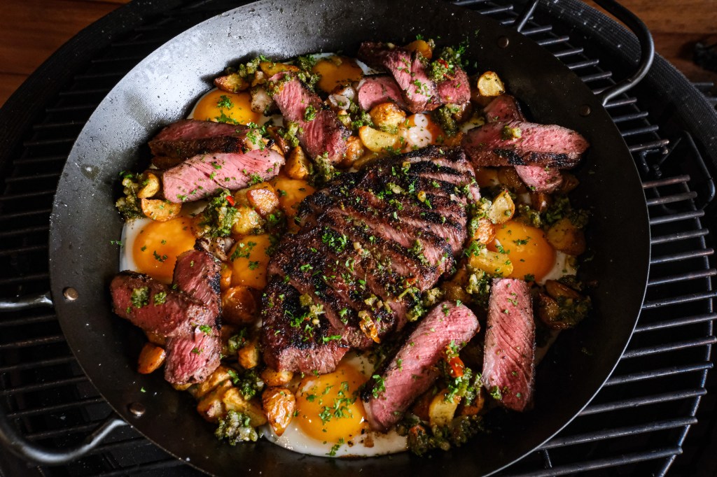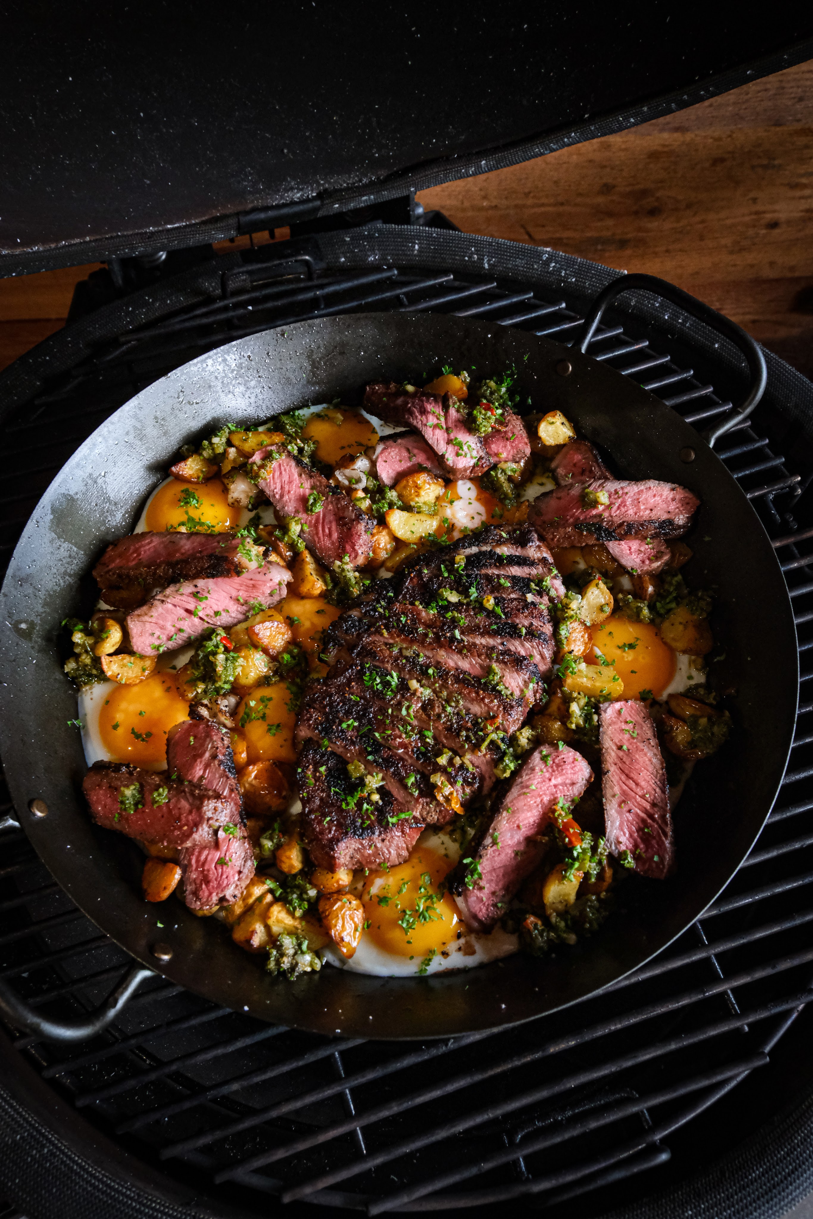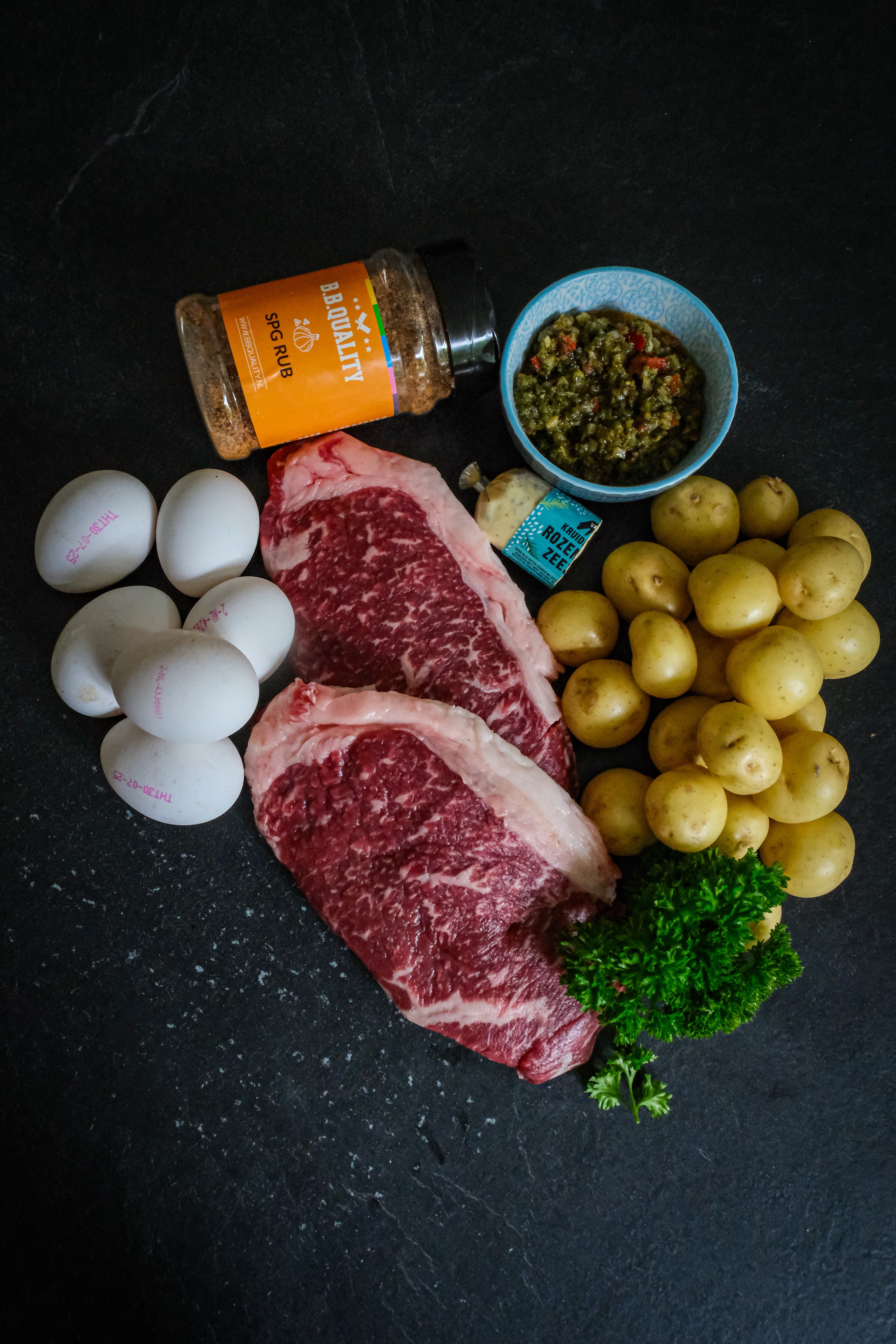 Steak and eggs is een geweldige combinatie heerlijk gegrilde steaks met geroosterde aardappeltjes en de eidooier van de eieren om alles lekker in te dopen. De chimichurri zorgt voor het lekkere zuurtje voor al die rijke smaken.