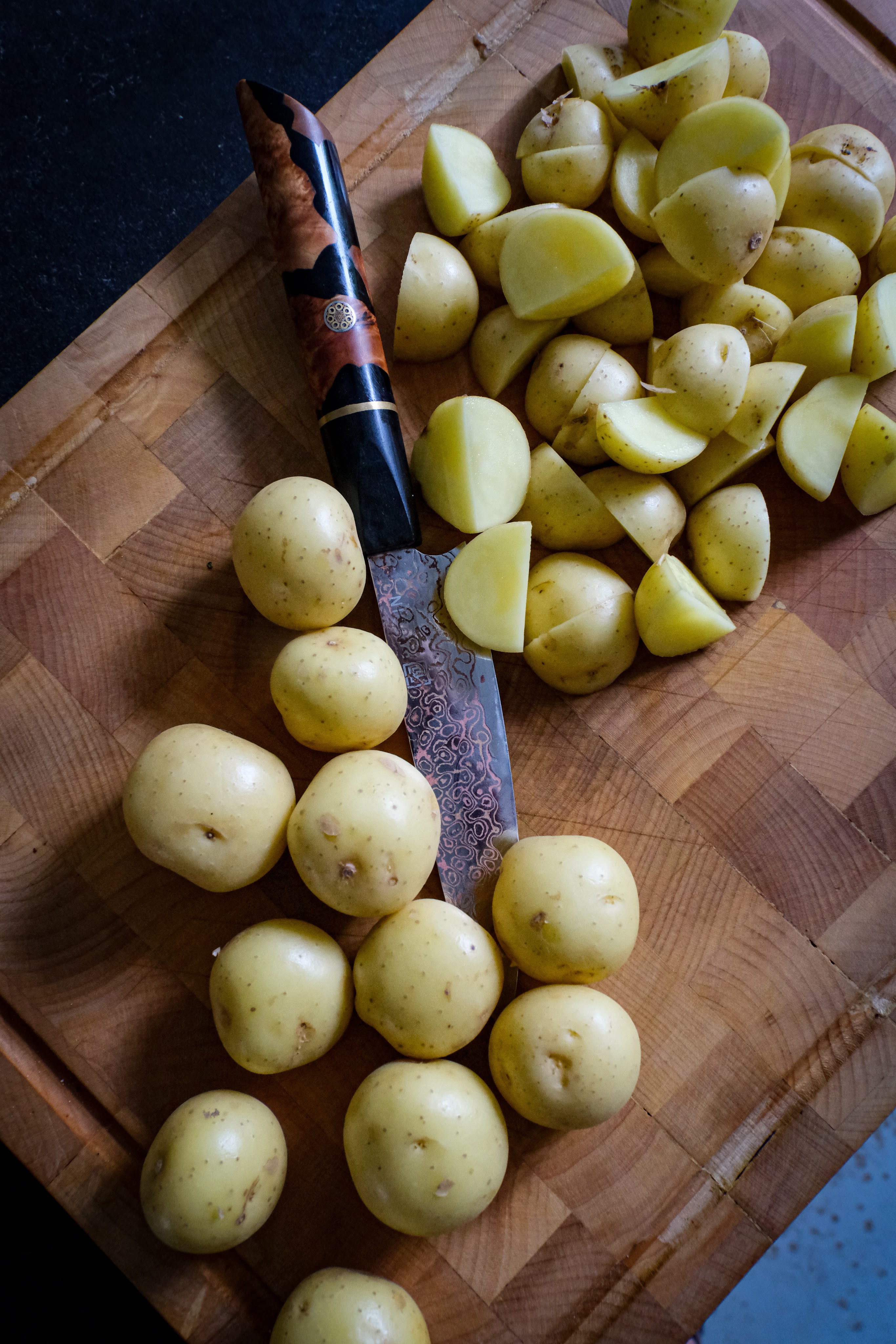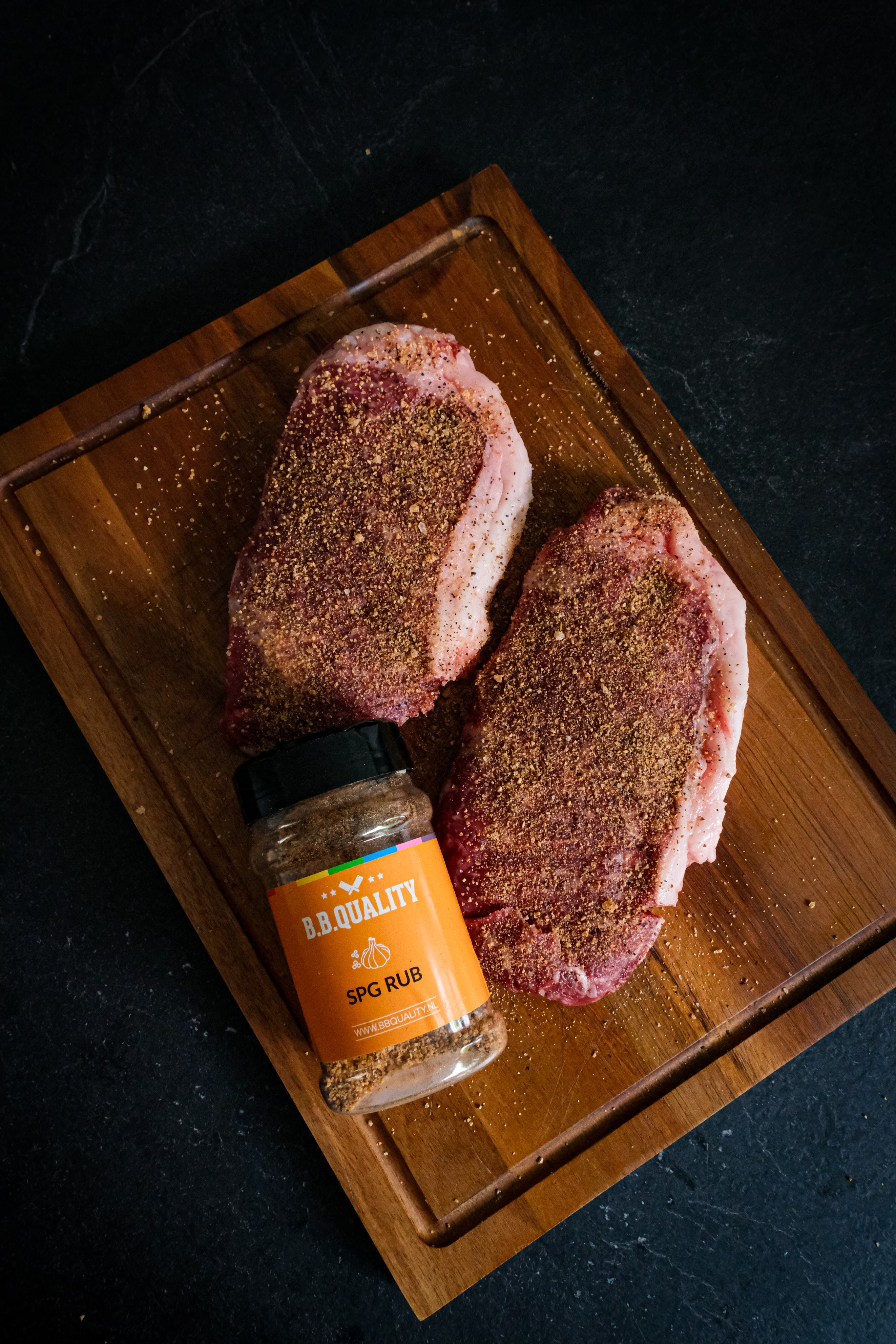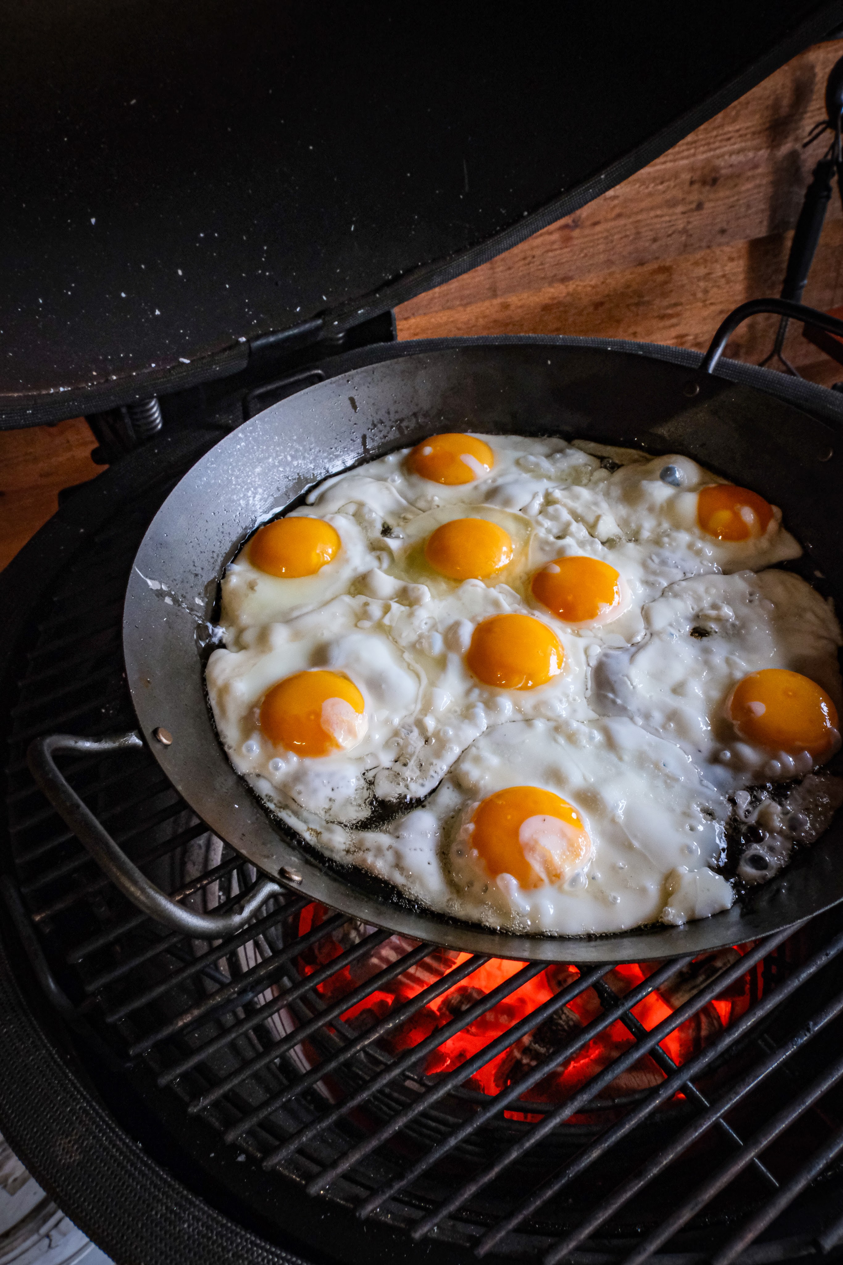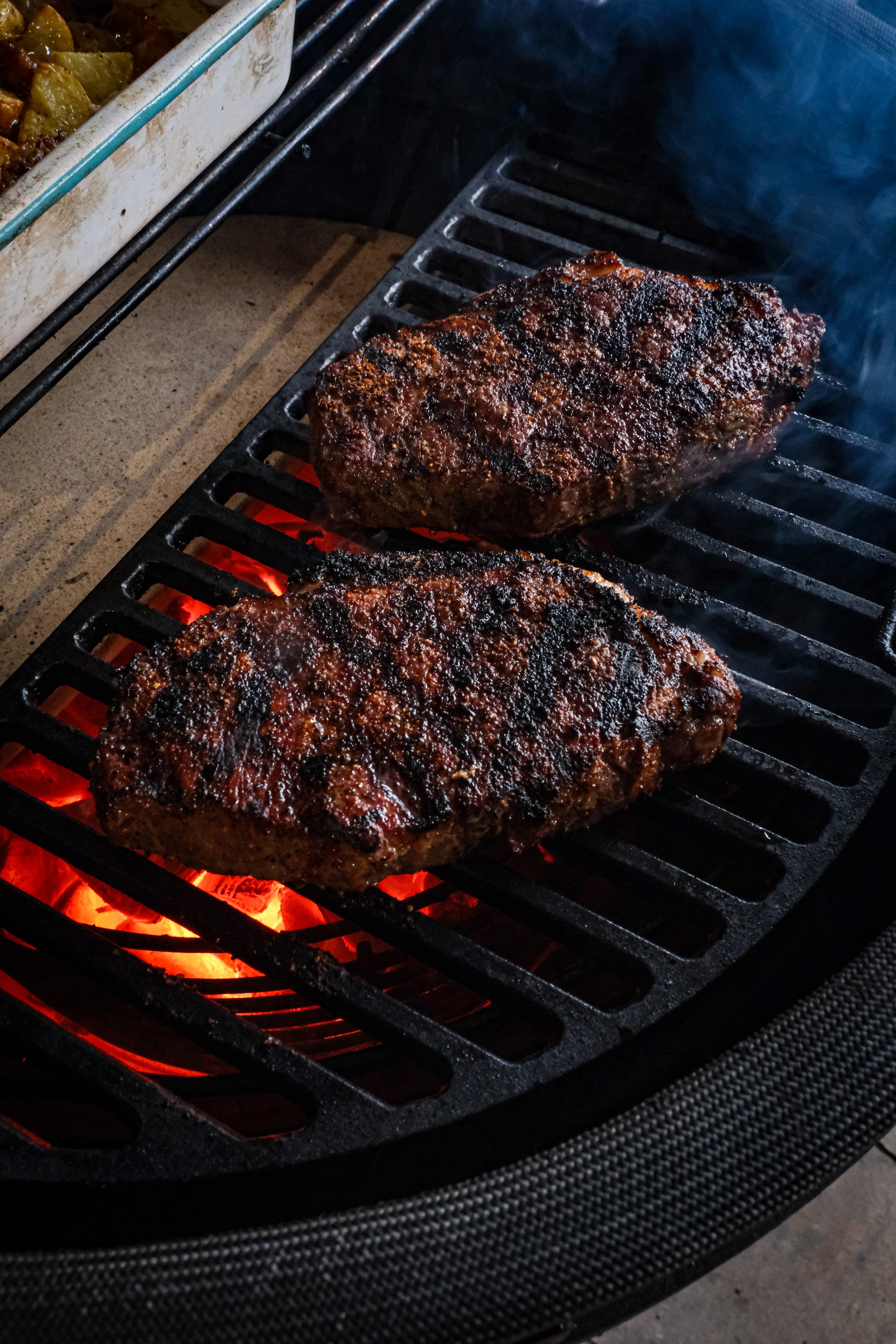Snij de krieltjes in vieren en zet een ovenschaal met de boter op de indirecte zijde en laat de boter smelten. Zodra de boter gesmolten is voeg de aardappeltjes eraan toe en schud goed door de aardappeltjes goed onder de boter zitten. Gaar deze nu 30 minuten met regelmatig omschudden tot ze mooi goudbruin zijn. Voorzie de steaks nu van de rub en grill deze aan beide kanten mooi aan tot een kern van 52 graden op de directe zijden haal ze dan van de bbq en laat ze minimaal 10 minuten rusten. Haal de aardappeltjes ook van de bbq en bouw deze om naar volledige directe bereiding. Zet de skillet op de bbq en laat deze goed opwarmen. Voeg dan een beetje olie toe en bak hier dan de eieren in aan zorg dat de dooiers heel blijven. Zodra de eieren gaar zijn haal ze ook van de bbq zorg wel dat de dooier lopend blijft.