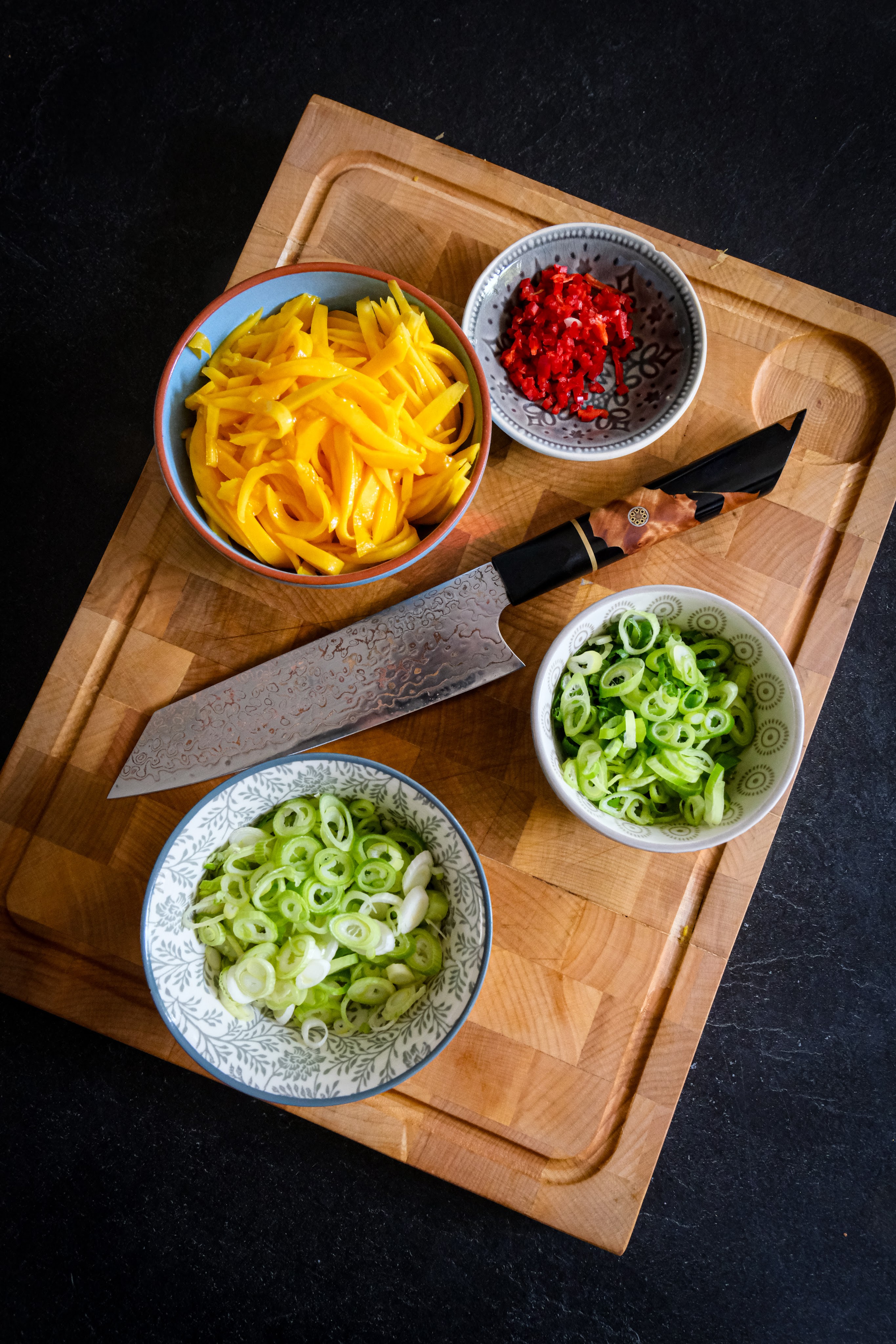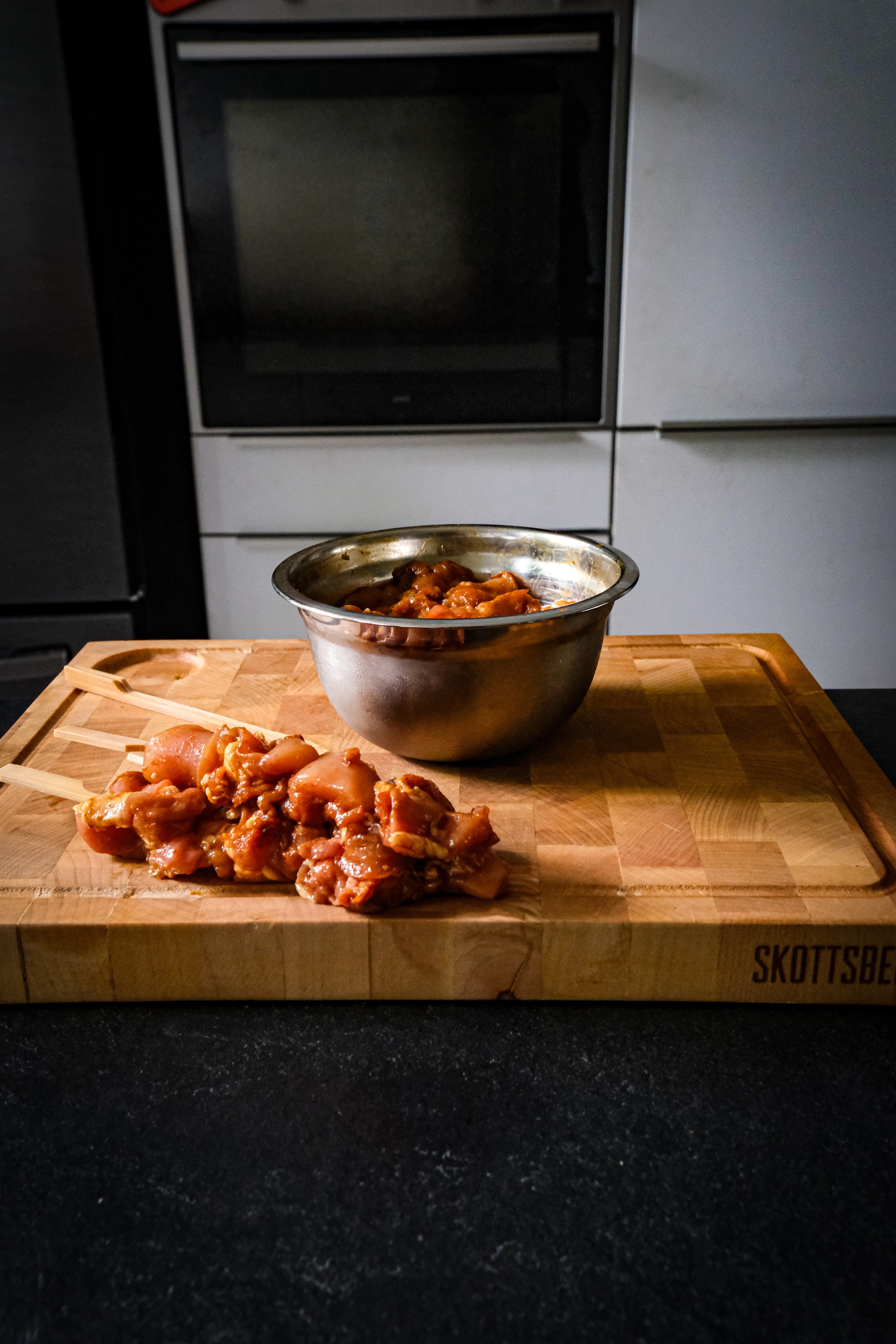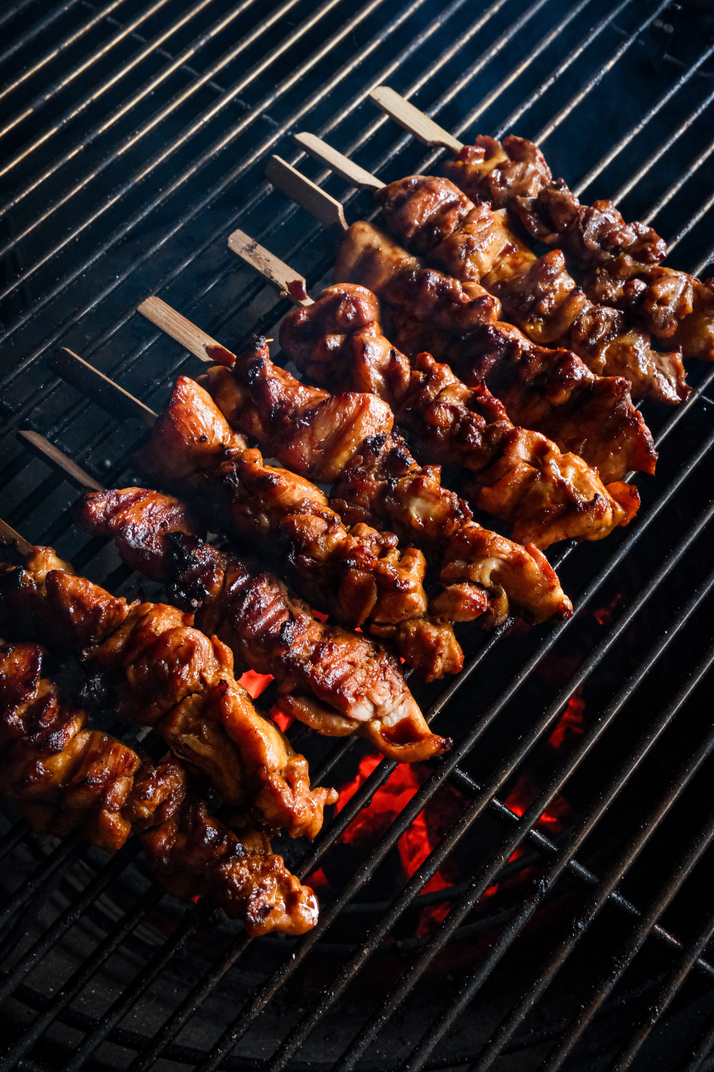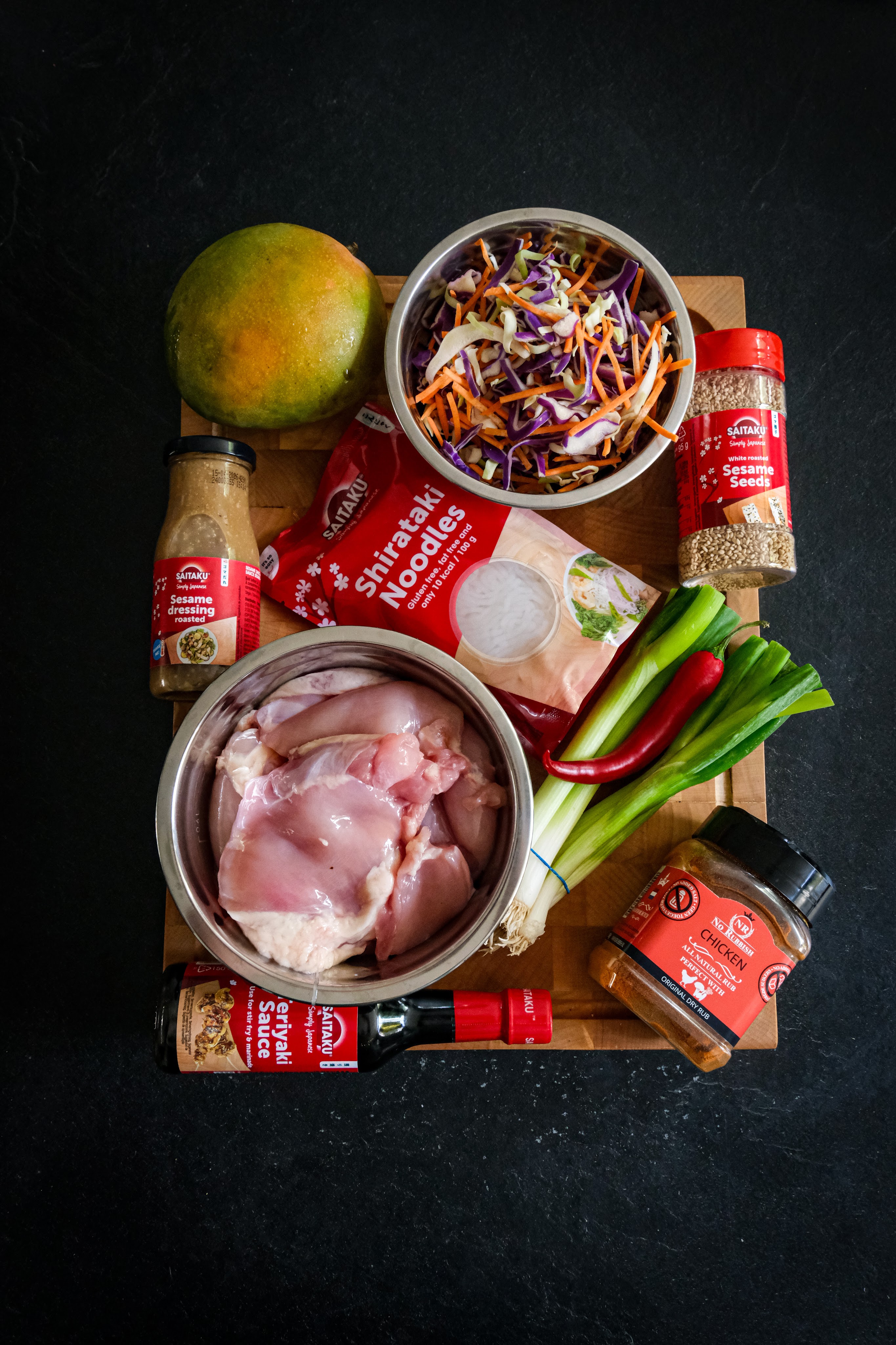 Leg de spiesen in een schaal met water dat ze onderstaan en laat ze minimaal 1 uur in het water leggen zo zullen ze minder snel verbranden op de bbq. Snij de dijen in blokjes die je aan de spiesen kunt rijgen en marineer deze met de rub en 1 el. teriyaki en laat dit ook minimaal 1 uur marineren. Na het marineren kun je de spiesen aan gaan rijgen. Snij ondertussen de mango in dunne reepjes net zoals de koolmix. Verwijder de zaadjes uit de rode peper en hak deze fijn en snij de bosui in ringen houdt een beetje van het groen achter. Grill nu de spiesen direct boven de kolen en grill ze aan beide kanten. Iedere keer als je ze omdraait smeer ze dan steeds in met de teriyaki saus en grill ze tot ze een kern van 72 graden hebben gehaald haal ze hierna van de bbq en smeer ze nog een keer in met de saus. Maak nu de salade door de noedels in een vergiet af te spoelen en doe de noedels, koolmix, rode peper, bosui, mango en de dressing in een kom en meng deze door breng eventueel op smaak met zout.