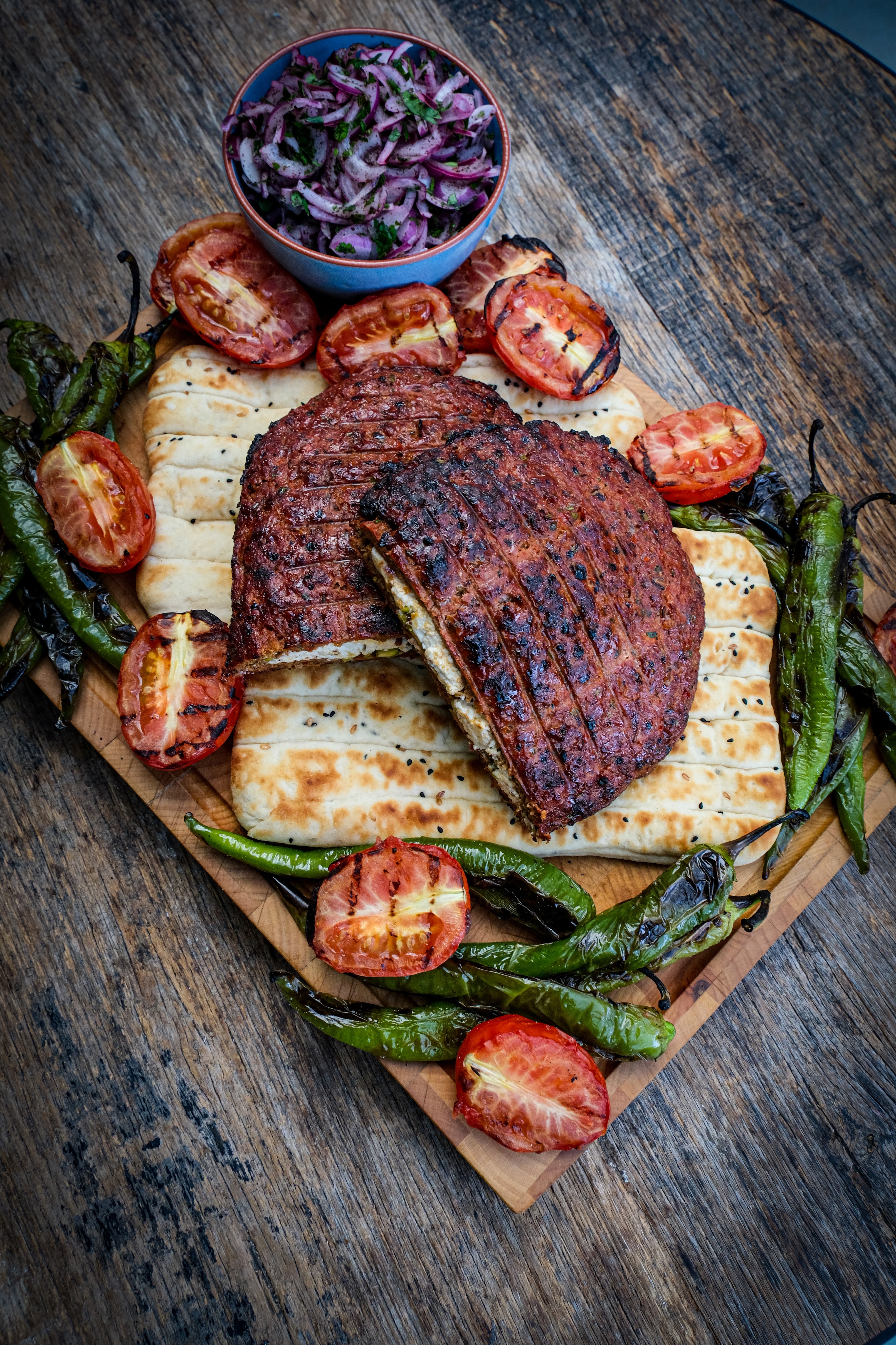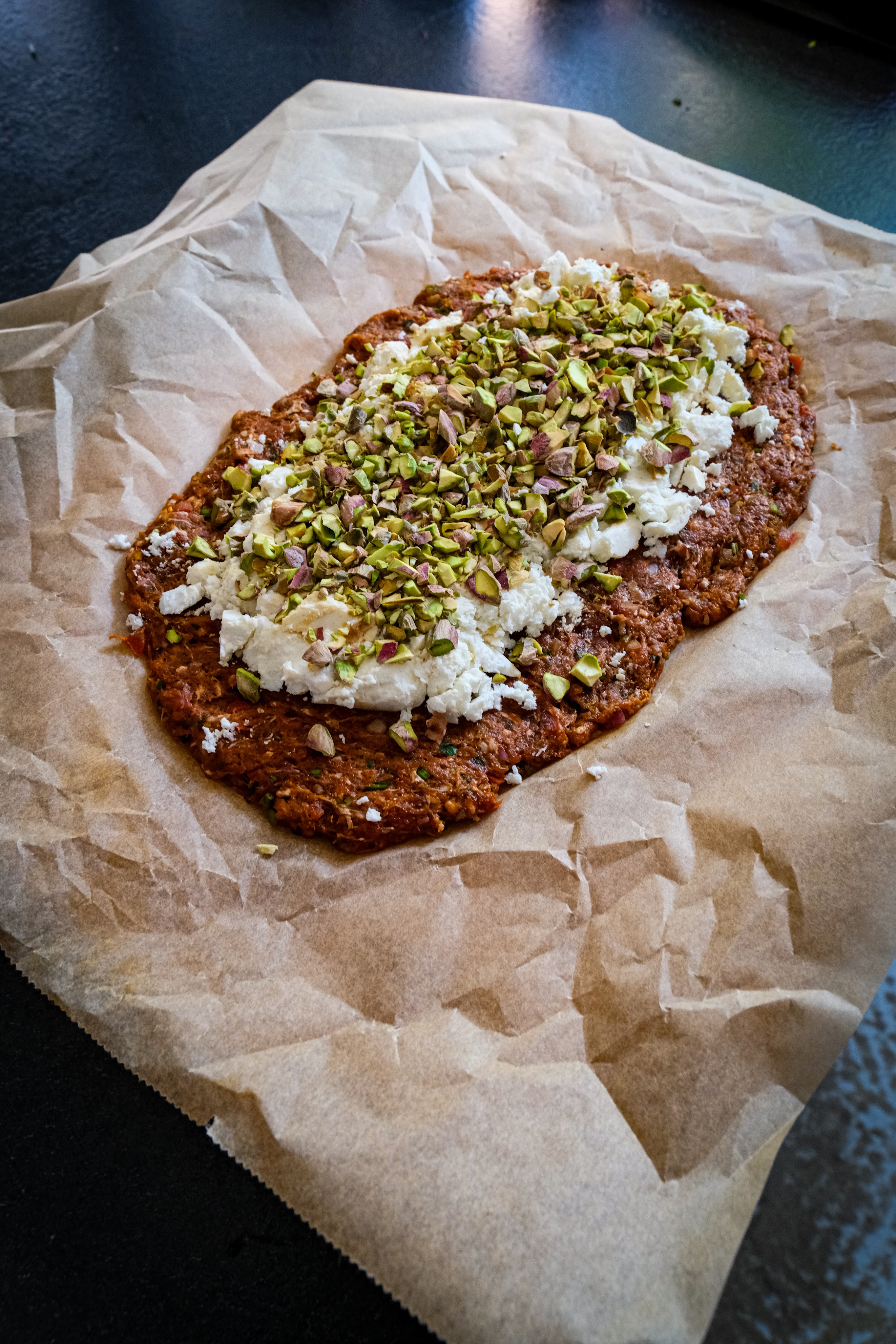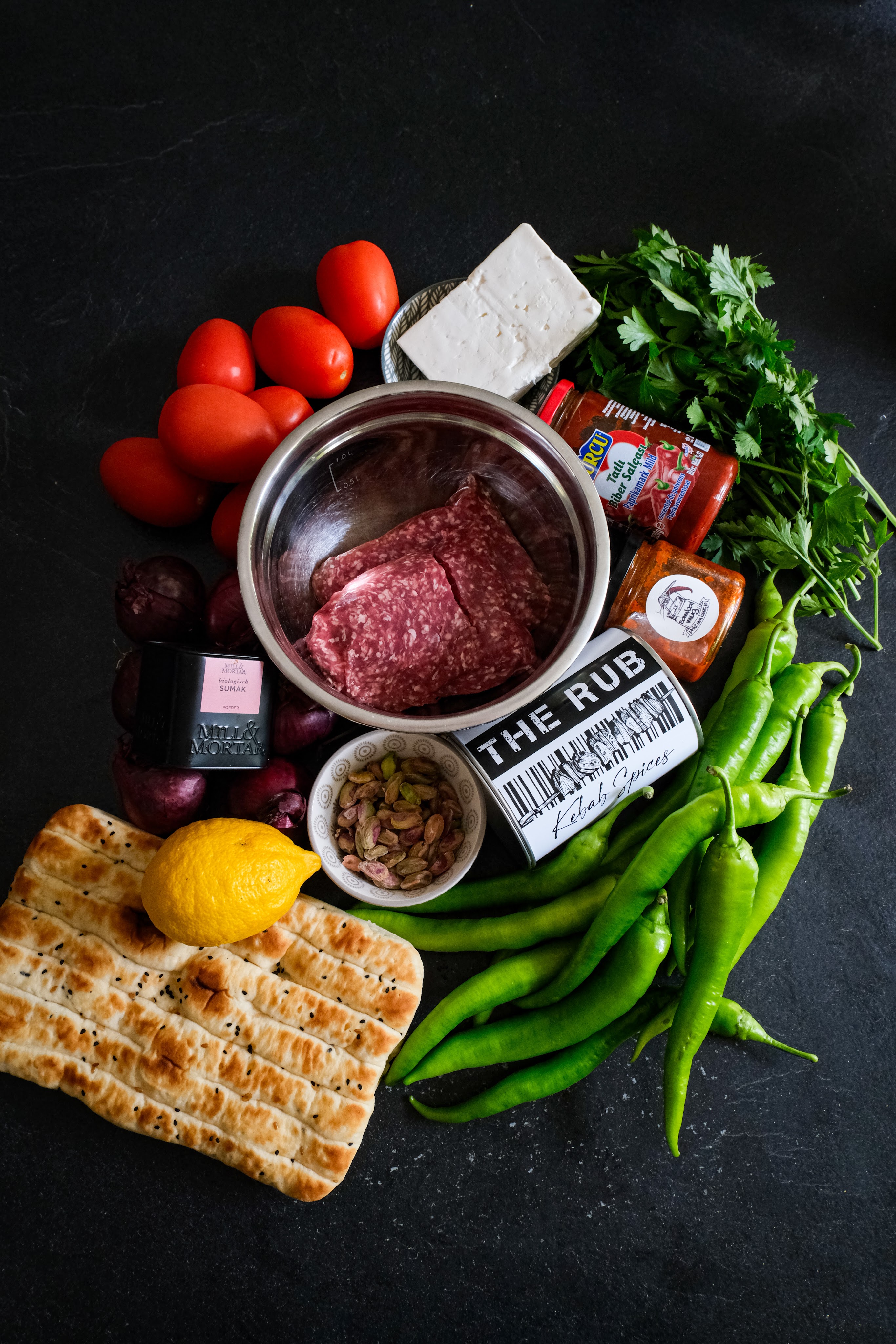 We beginnen met het voor bereiden van het lams gehakt. Hiervoor snijden we de tomaat in kwarten en verwijderen we de zaadjes. Snij de buitenkant nu in fijne blokjes, snipper de ui fijn en hak de platte peterselie fijn. Meng dit op de snijplank door elkaar en leg het lamsgehakt hier bovenop met de biber, sambal en de rub en meng dit al hakkend met de mes door elkaar. Dit doe je door alles te hakken en dan bij elkaar te doen op een hoopje en weer opnieuw hakken herhaal dit tot alles goed door elkaar is gemengd en de groenten nog fijner zijn. Verdeel het gehakt nu in tweeën. Plet beide delen nu op bakpapier uit tot twee even grote ovalen en breek op eentje de feta zorg dat de randen vrij blijven en doe er ook de gehakte pistache erop. Doe nu de andere ovaal er boven op en druk nu alles samen en zorg dat de randen goed dicht zijn. Doe de kebab nu een rooster waar hij tussen geklemd kan worden als je die niet hebt is deze niet perse nodig maar moet je voorzichtig zijn met omdraaien. Leg de kebab nu direct op het rooster boven de kolen en gril de eerste kant tot deze een mooi korst heeft. draai de kebab dan om tot deze ook een mooie korst heeft.