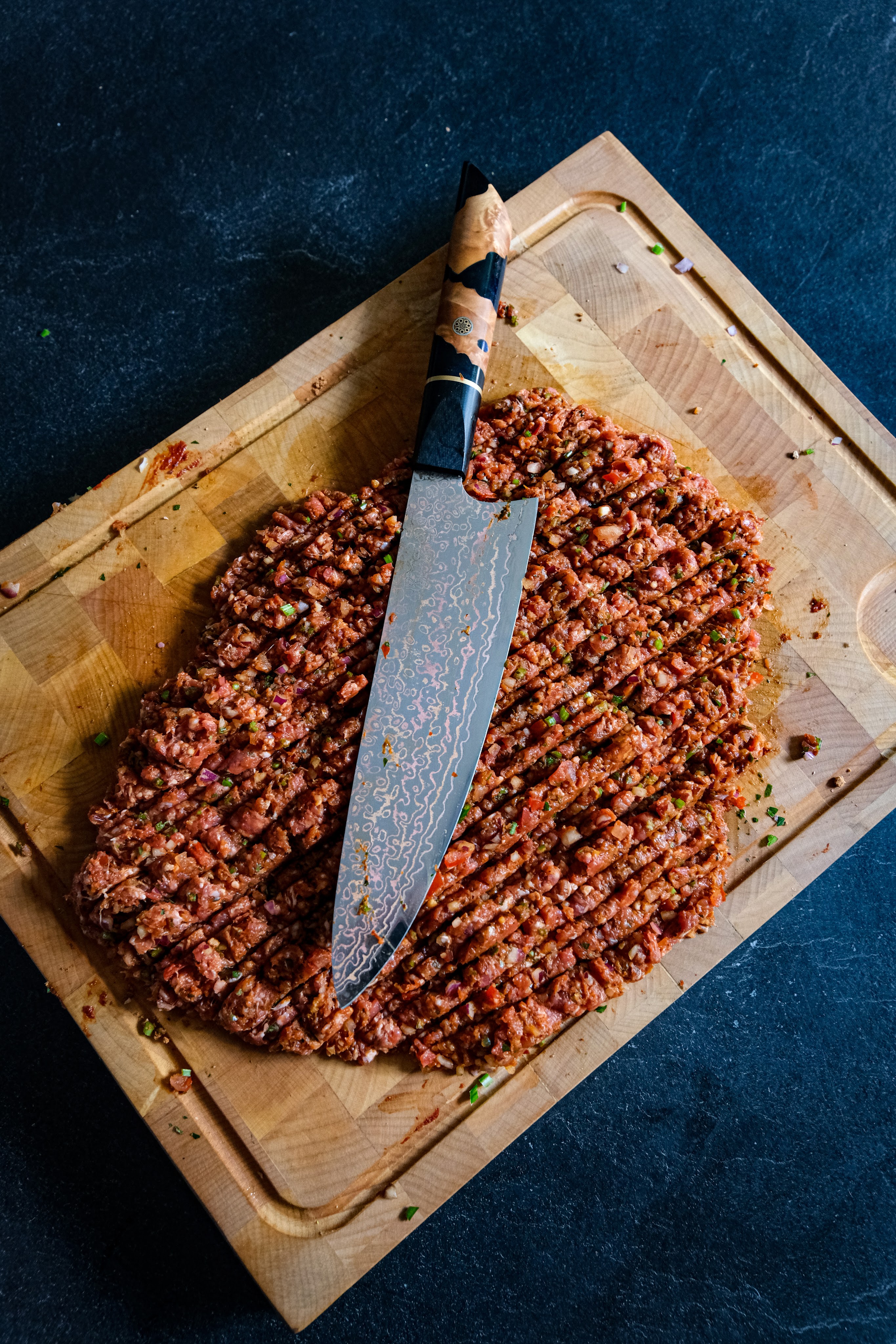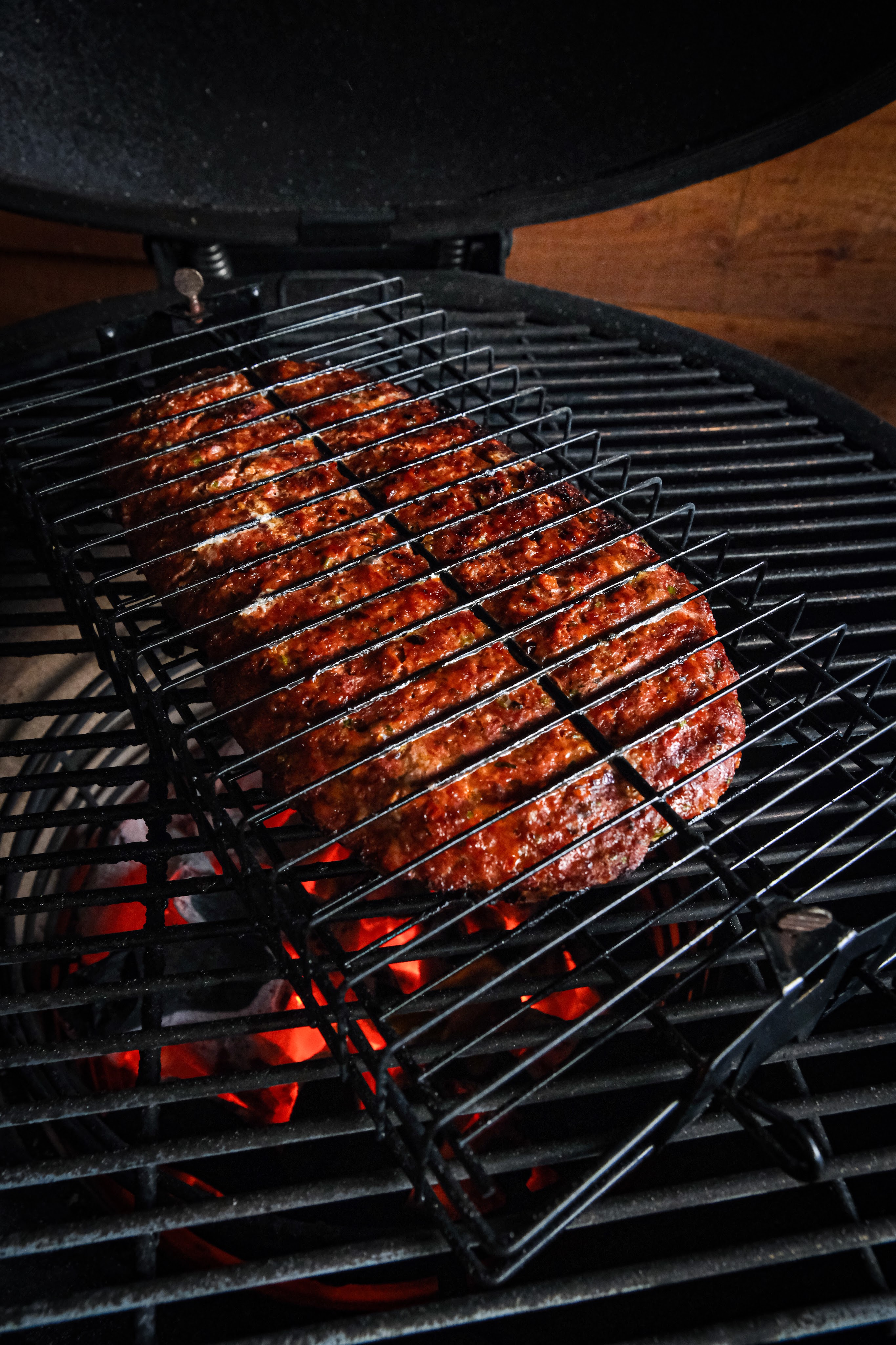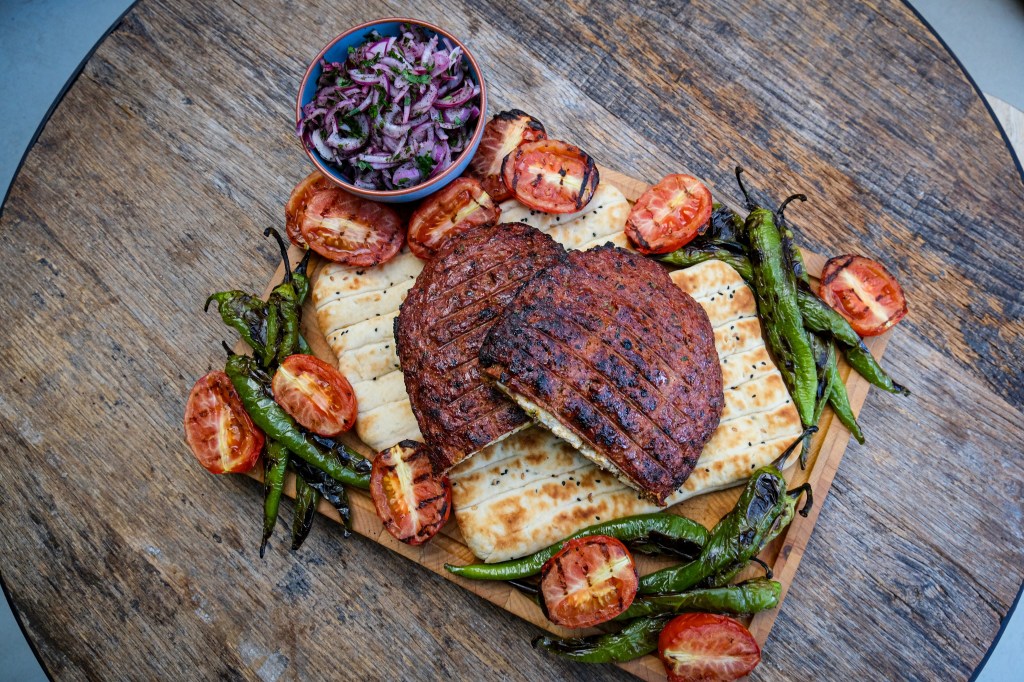 We beginnen met het voor bereiden van het lams gehakt. Hiervoor snijden we de tomaat in kwarten en verwijderen we de zaadjes. Snij de buitenkant nu in fijne blokjes, snipper de ui fijn en hak de platte peterselie fijn. Meng dit op de snijplank door elkaar en leg het lamsgehakt hier bovenop met de biber, sambal en de rub en meng dit al hakkend met de mes door elkaar. Dit doe je door alles te hakken en dan bij elkaar te doen op een hoopje en weer opnieuw hakken herhaal dit tot alles goed door elkaar is gemengd en de groenten nog fijner zijn. Verdeel het gehakt nu in tweeën. Plet beide delen nu op bakpapier uit tot twee even grote ovalen en breek op eentje de feta zorg dat de randen vrij blijven en doe er ook de gehakte pistache erop. Doe nu de andere ovaal er boven op en druk nu alles samen en zorg dat de randen goed dicht zijn. Doe de kebab nu een rooster waar hij tussen geklemd kan worden als je die niet hebt is deze niet perse nodig maar moet je voorzichtig zijn met omdraaien. Leg de kebab nu direct op het rooster boven de kolen en gril de eerste kant tot deze een mooi korst heeft. draai de kebab dan om tot deze ook een mooie korst heeft.
