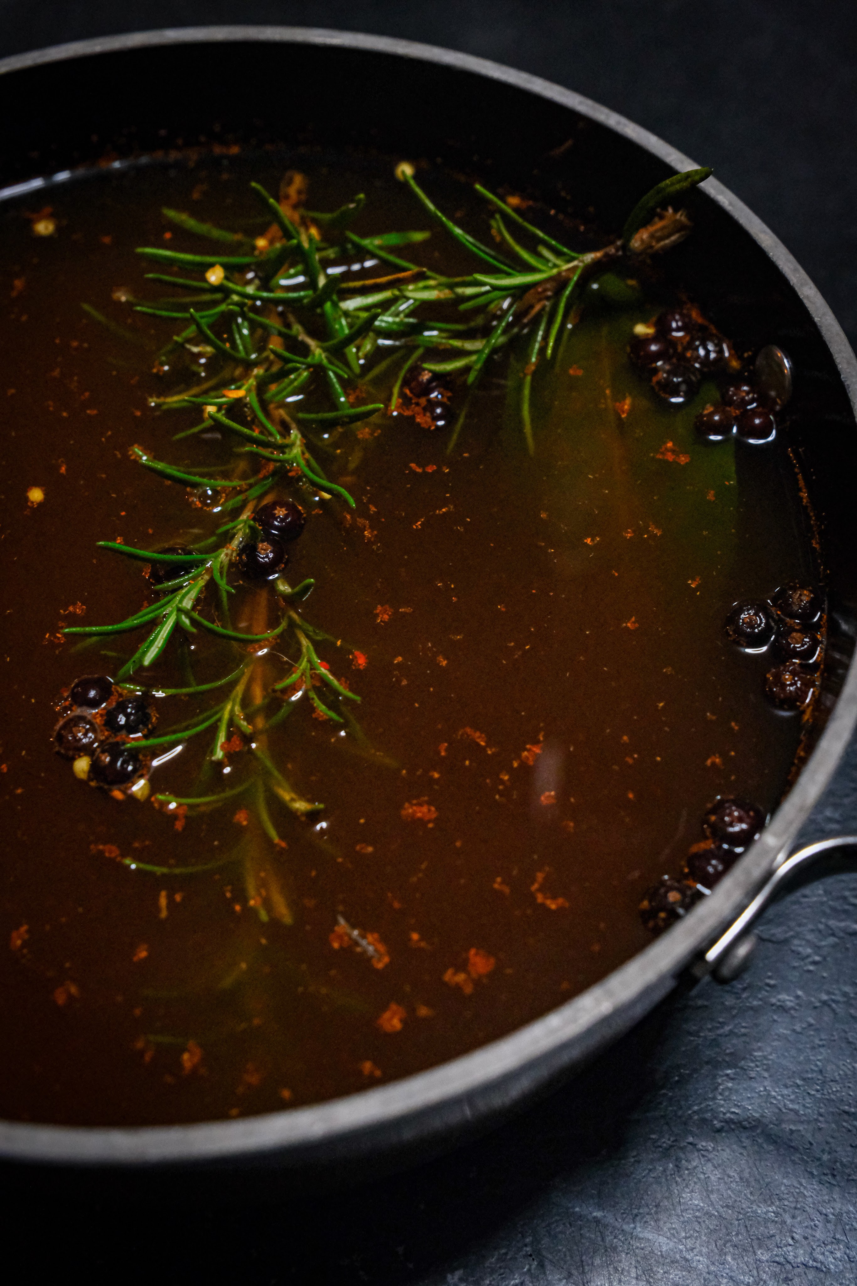 Maak een dag van te voren een pekel van het water, zout, 50 gr rub, laurier, rozemarijn, jeneverbes en de suiker doe dit in een pan en laat de suiker en zout oplossen en dan afkoelen. Doe nu de kalkoen in een grote bak die je kunt afsluiten en doe hier de pekel erbij en laat deze nu een avond pekelen in de koelkast. Haal hem de volgende dag uit de pekel en droog deze af. Maak de huid bij de borsten nu wat los en doe hier de kruidenboter onder en probeer dit een beetje te verdelen onder de huid. Doe nu de rest van de rub over de kalkoen. Snij de uien in parten de bospeen zonder kroos in vieren en de knoflook door midden leg deze in de ovenschaal en doe hier de fond bij. Leg hier de kalkoen bovenop en zet deze op de bbq en gaar deze nu tot een kern van 72 graden en haal hem daarna van de bbq en laat de kalkoen nu rusten. Maak ondertussen de jus door de gevogelte jus op te warmen en daar de cranberry saus en the cherry erdoorheen te mengen.