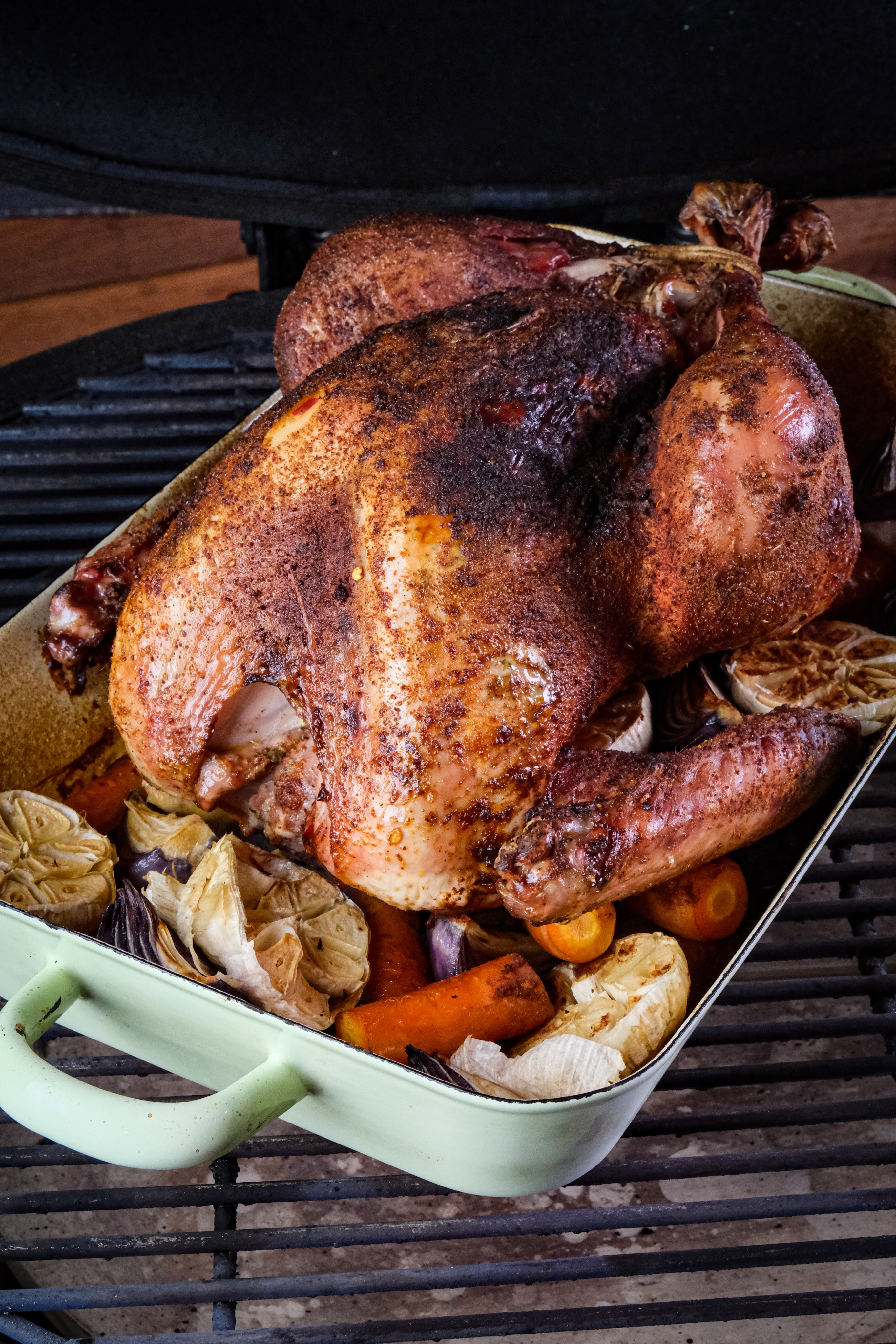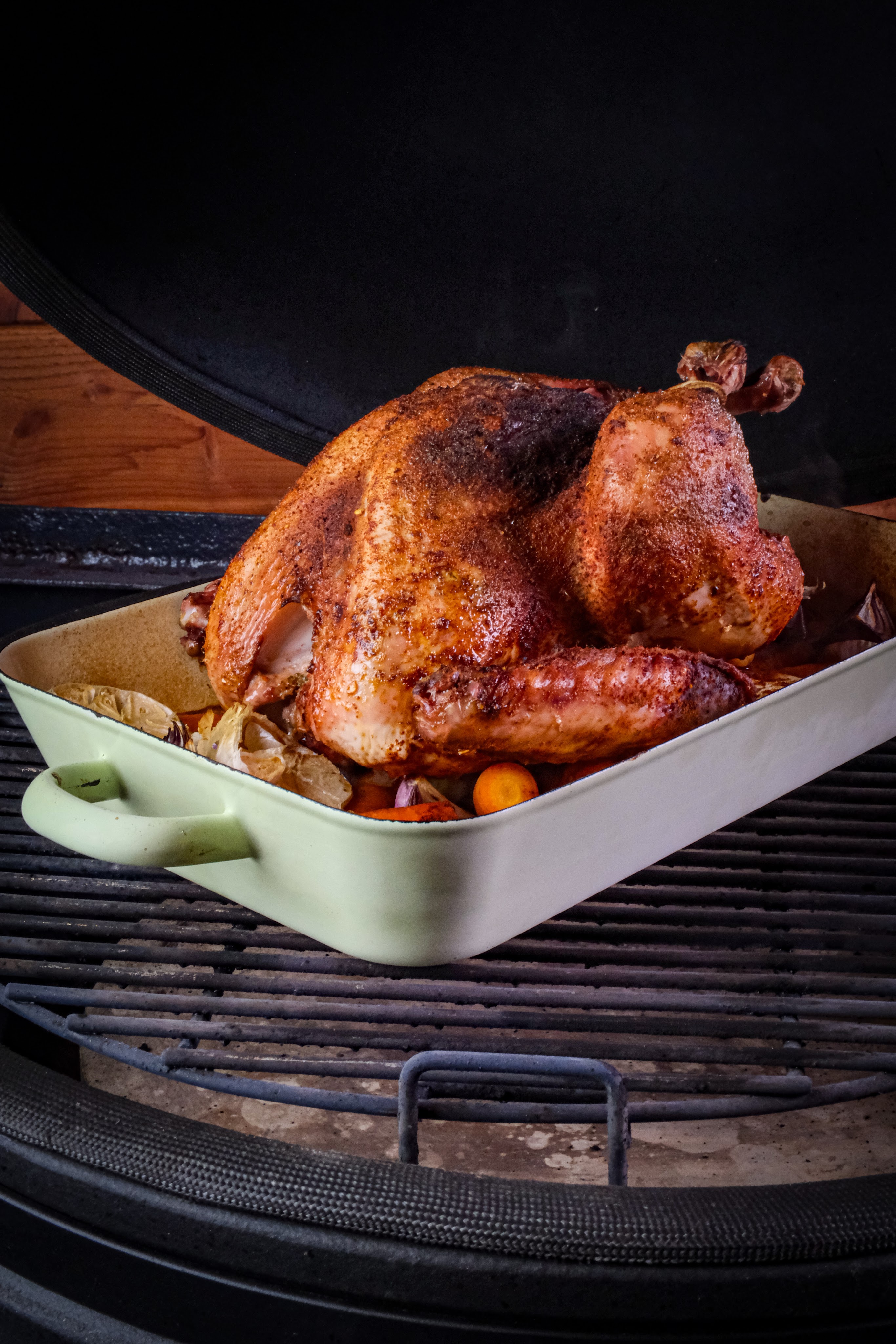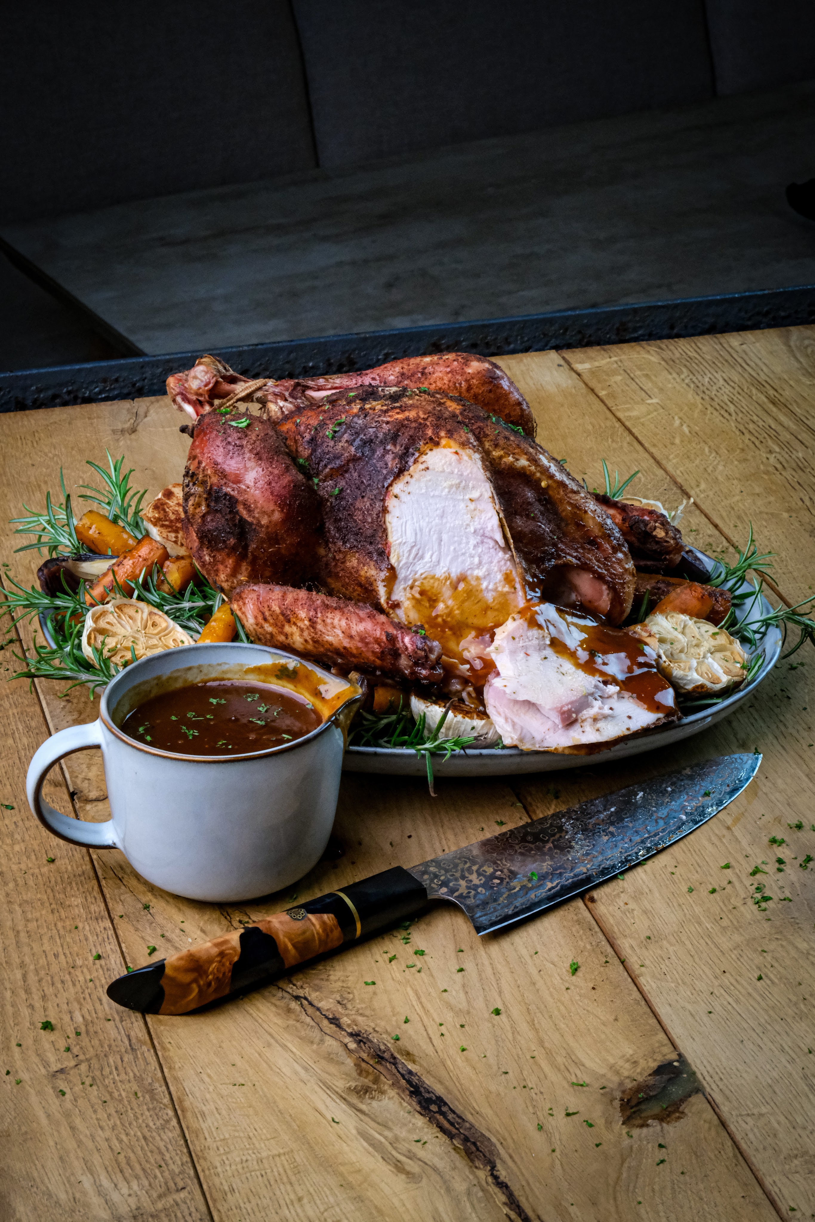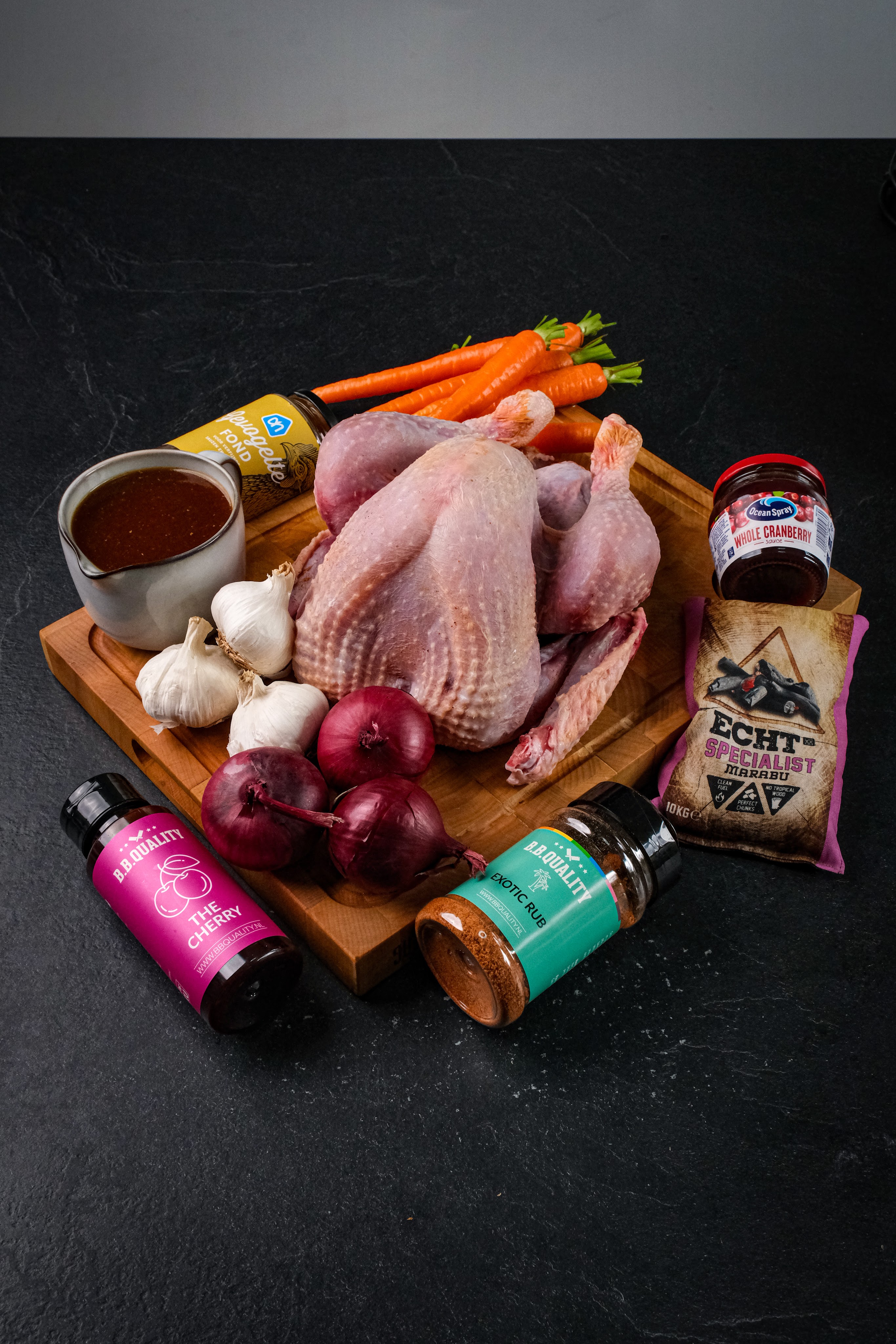 Een hele kalkoen van de barbecue krijgt iets bijzonders wanneer je hem eerst pekelt in een aromatische pekel met Exotic Rub. Het maakt het vlees mals, smaakvol en perfect sappig. Onder de huid gaat een chili kruidenboter die tijdens het garen langzaam smelt en de kalkoen extra diepte geeft. Hij wordt rustig geroosterd op een bed van wortel, ui en knoflook, met wat gevogeltefond om het geheel vochtig te houden. Voor erbij maak ik een makkelijke maar smaakvolle cranberry kersenjus, op basis van gevogeltejus die ik verrijk met cranberry en kersen BBQ saus. Een feestelijk en rijk gerecht.