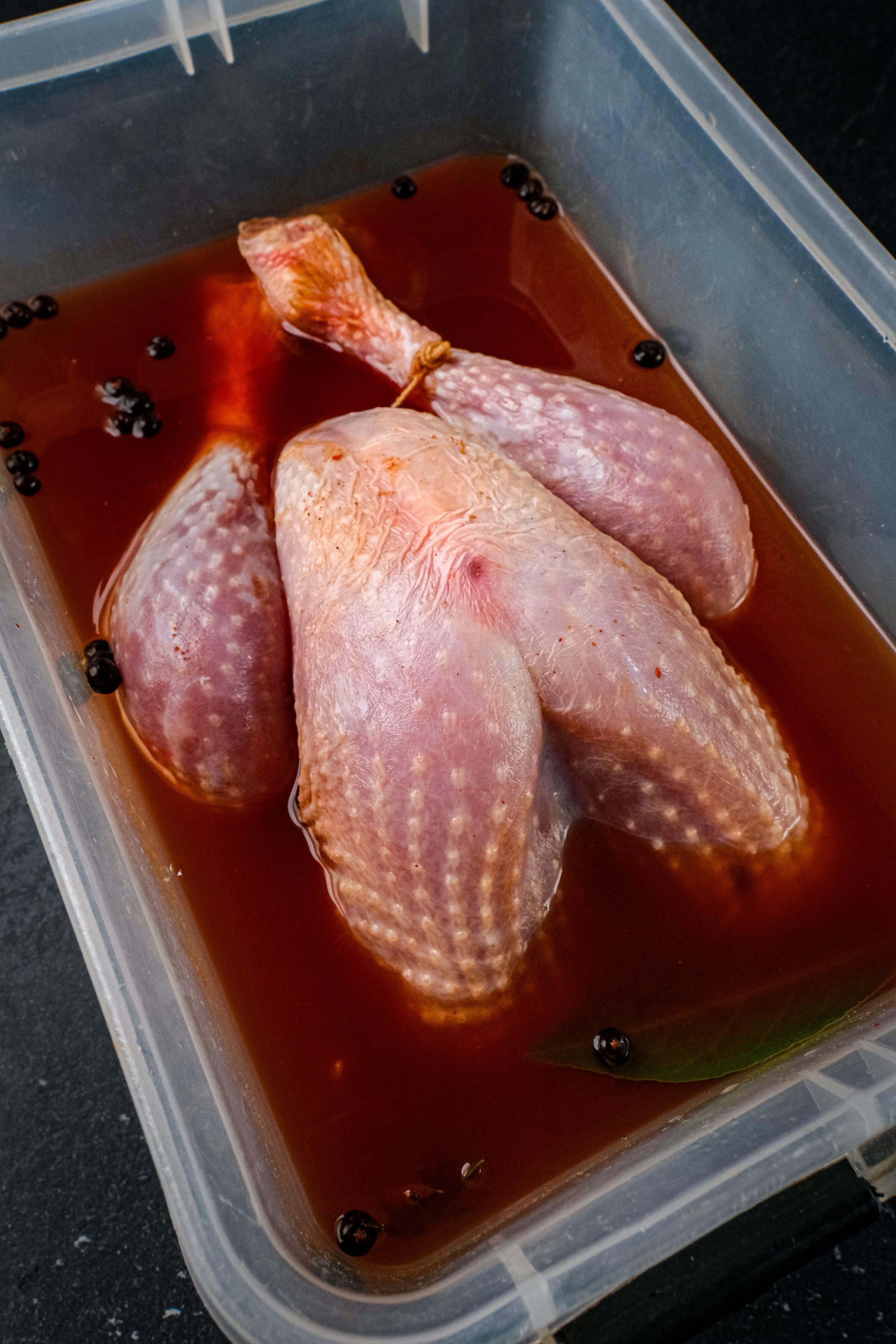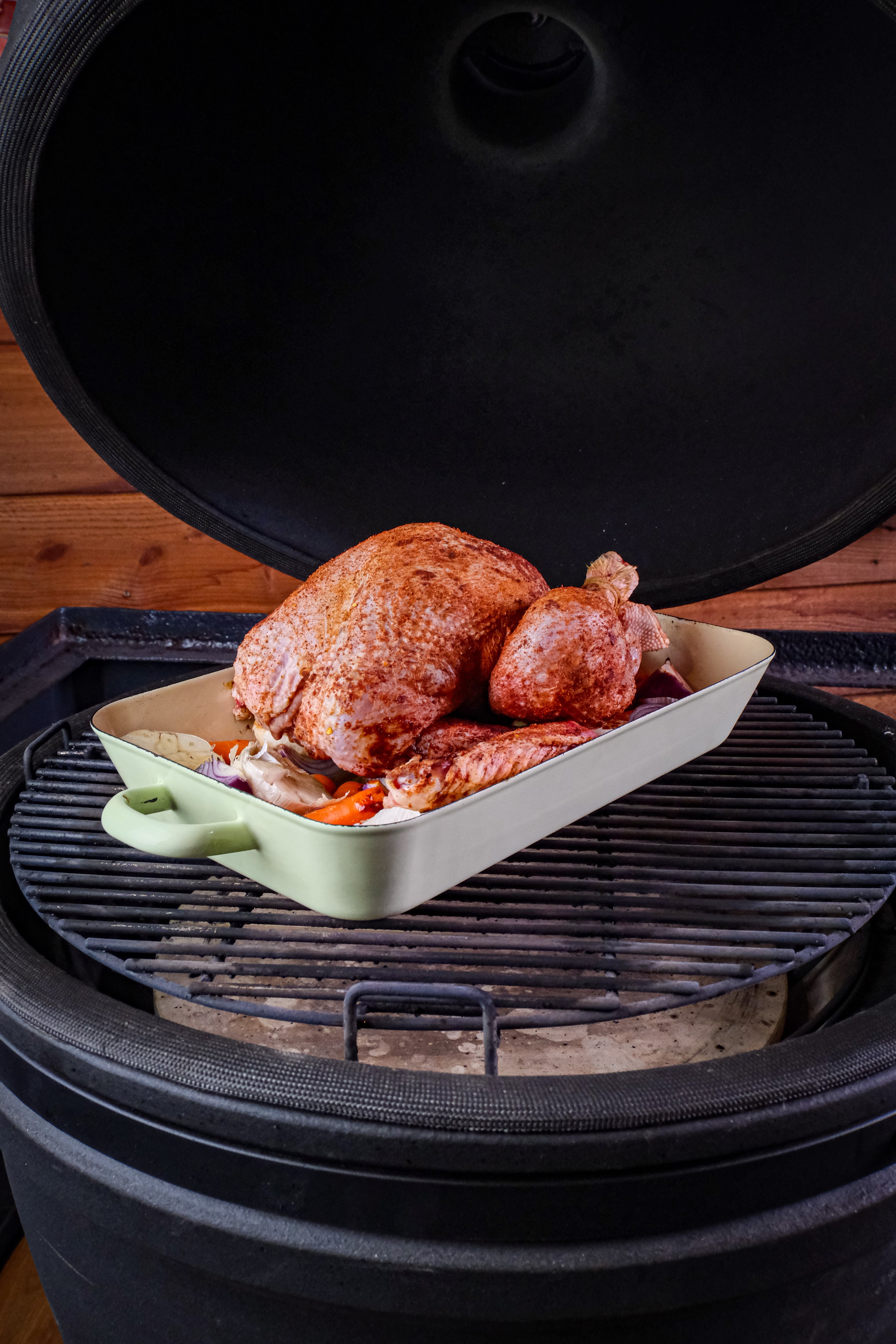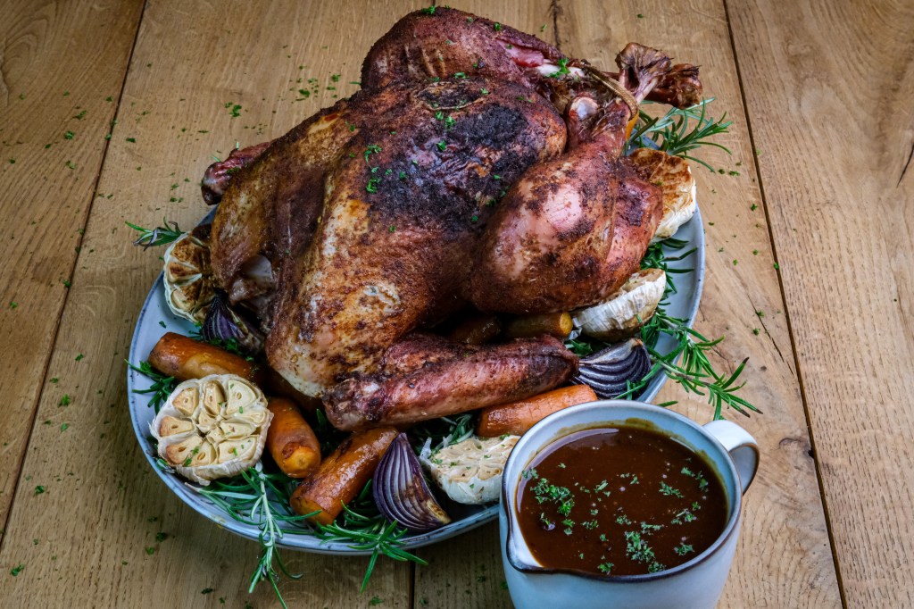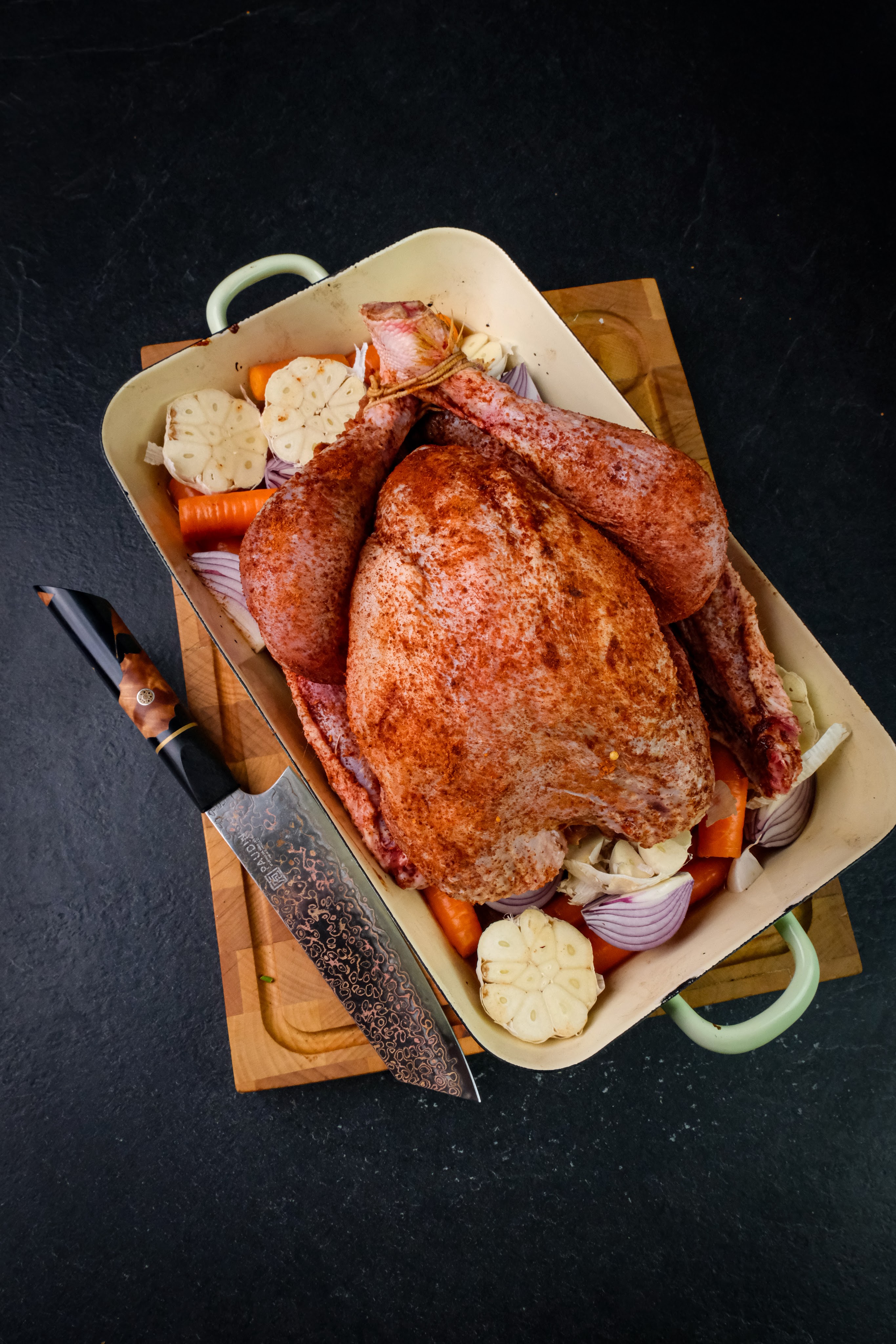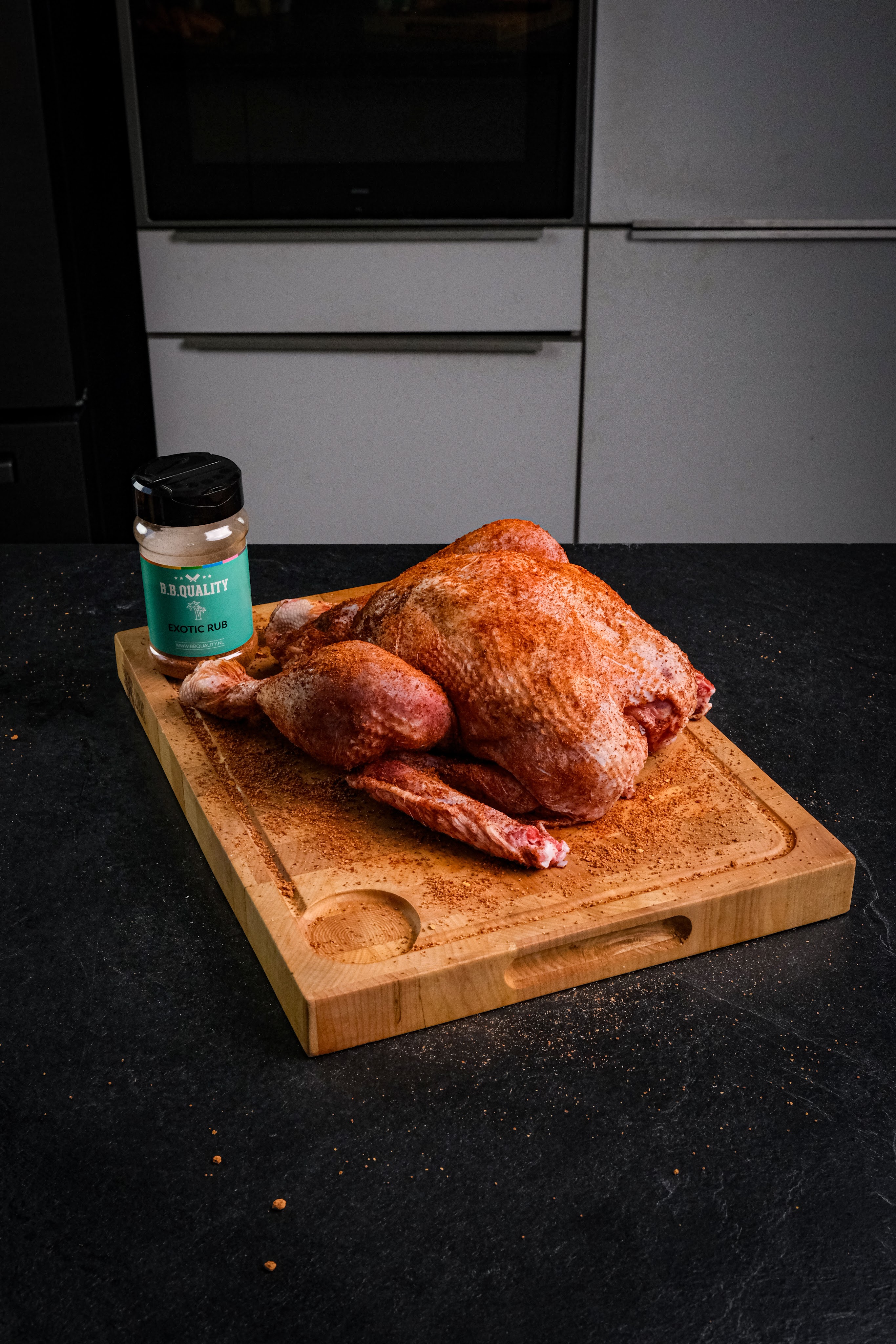Een hele kalkoen van de barbecue krijgt iets bijzonders wanneer je hem eerst pekelt in een aromatische pekel met Exotic Rub. Het maakt het vlees mals, smaakvol en perfect sappig. Onder de huid gaat een chili kruidenboter die tijdens het garen langzaam smelt en de kalkoen extra diepte geeft. Hij wordt rustig geroosterd op een bed van wortel, ui en knoflook, met wat gevogeltefond om het geheel vochtig te houden. Voor erbij maak ik een makkelijke maar smaakvolle cranberry kersenjus, op basis van gevogeltejus die ik verrijk met cranberry en kersen BBQ saus. Een feestelijk en rijk gerecht.