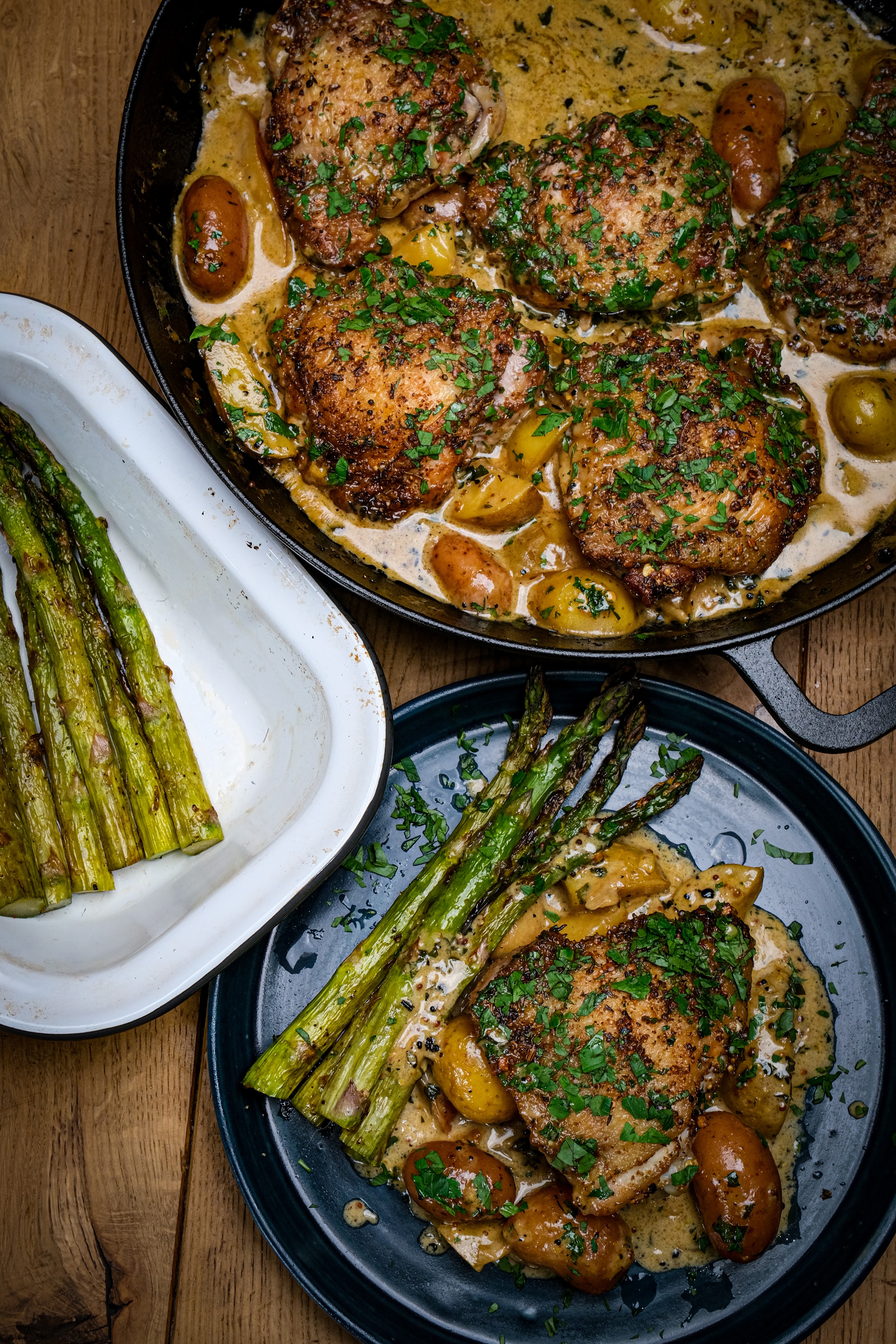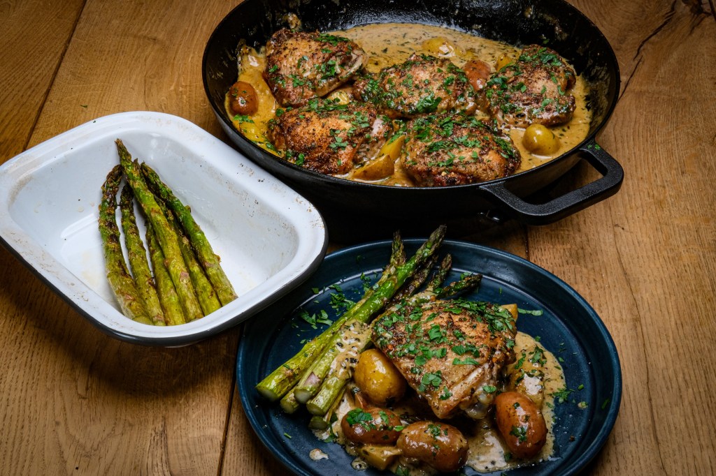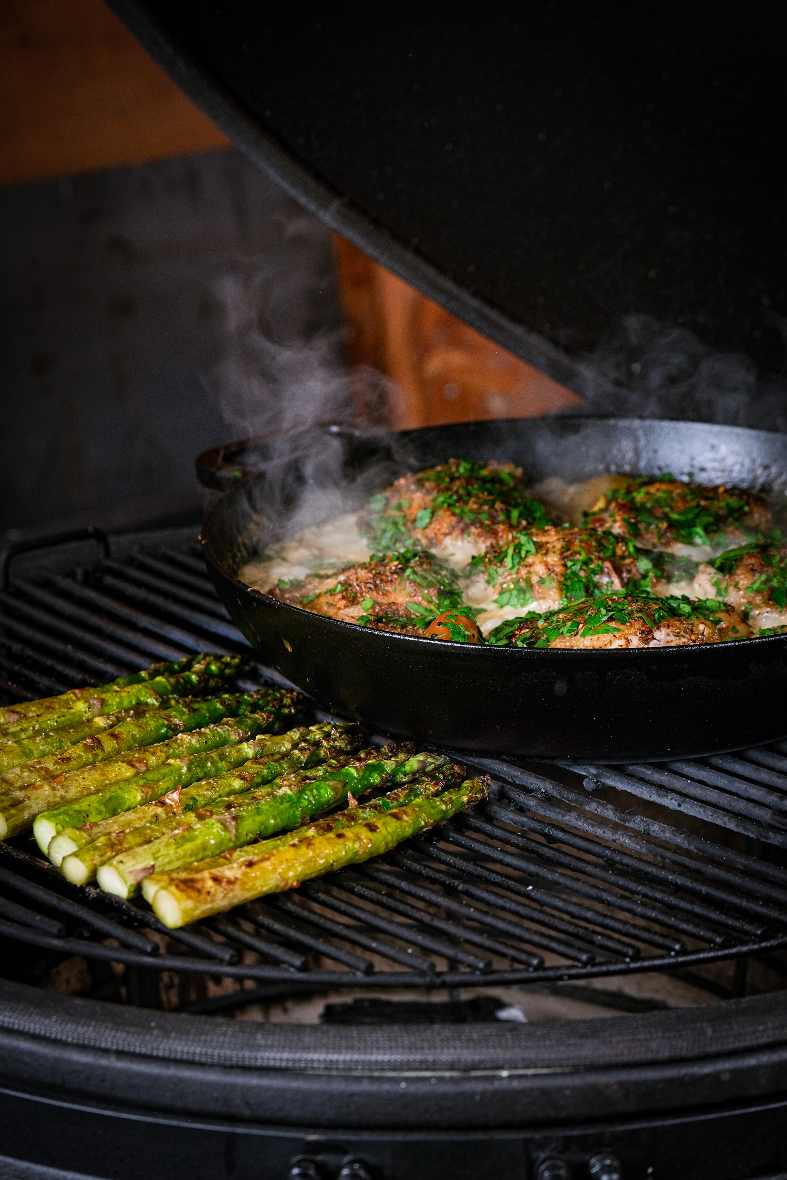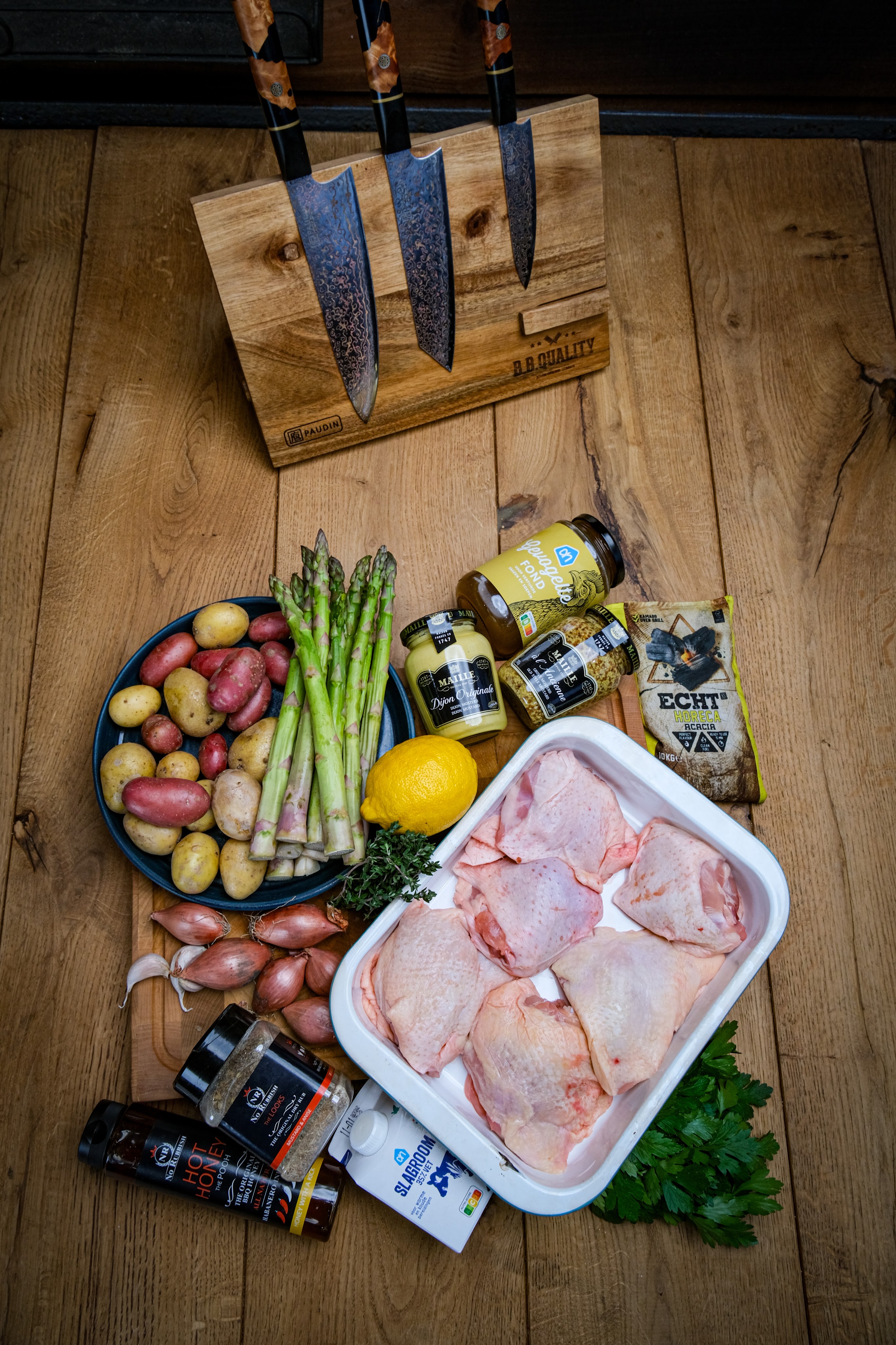 Soms ontstaan de beste gerechten door alles samen te laten komen in één pan. Deze kipkoteletten met krokant vel worden langzaam gegaard in een romige hot honey mosterdsaus waarin ook de krieltjes meekoken en alle smaken opnemen. Door het gerecht op de BBQ te bereiden krijgt alles een extra diepe smaak terwijl de gegrilde groene asperges zorgen voor frisheid en balans.