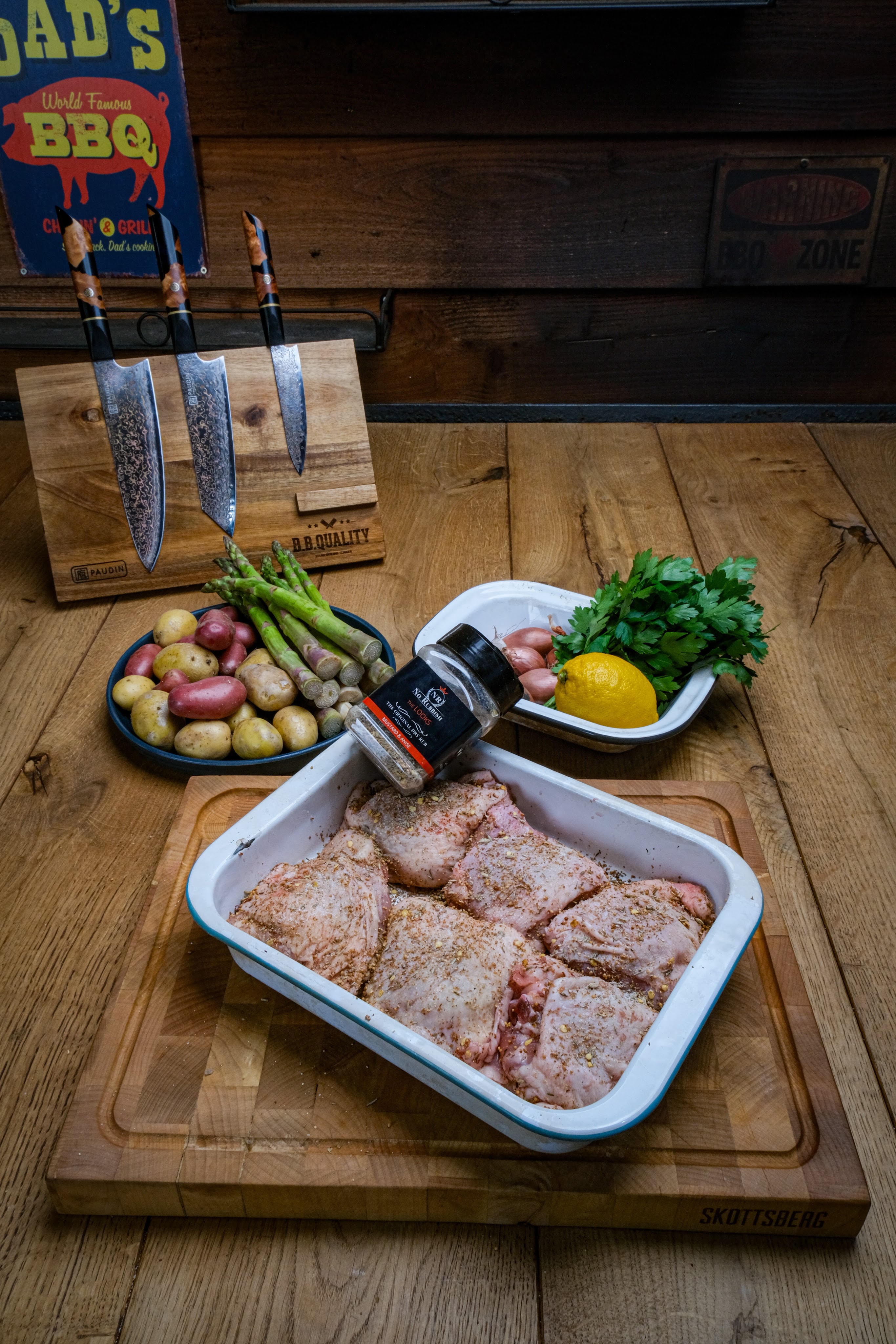 We beginnen door eerst kipkoteletten te voorzien van de rub en zet even apart. Ris nu de tijm van de takjes, hak de platte peterselie grof, maak de sjalotten schoon en snij deze in kwarten. Snij ook de krieltjes in parten of door de helft en hak de knoflook ook fijn. Snij het harde gedeelte van de asperges eraf en meng die met een beetje olie, peper en zout. Doe nu wat olie in de skillet en bak hier eerst met de huid kant naar beneden de kipkoteletten tot de vel lekker krokant is en draai deze dan om en bak kort aan de vlees kant. Haal ze er daarna uit en zet ze even apart. Bak nu de sjalotten en de krieltjes aan in de pan tot ze een beetje kleur krijgen. Zodra dat zo is voeg dan de fond, knoflook en tijm toe en breng dit nu licht aan de kook laat dit nu zachtjes koken tot de krieltje bijna helemaal gaar zijn. Doe er nu de slagroom, mosterd en hot honey erbij en meng dit door leg daarna de kipkoteletten er terug in met de vel naar boven. Laat dit nu verder koken tot de saus een mooie dikte heeft en de dijen een minimale kern temperatuur van 72 graden hebben. Grill ondertussen de groene asperge ook op de bbq tot deze gaar zijn draai regelmatig zodat ze niet verbranden. Als de dijen op temperatuur zijn voeg dan de peterselie toe en knijp de sap van de citroen uit boven de saus en meng dit er nog lekker doorheen.