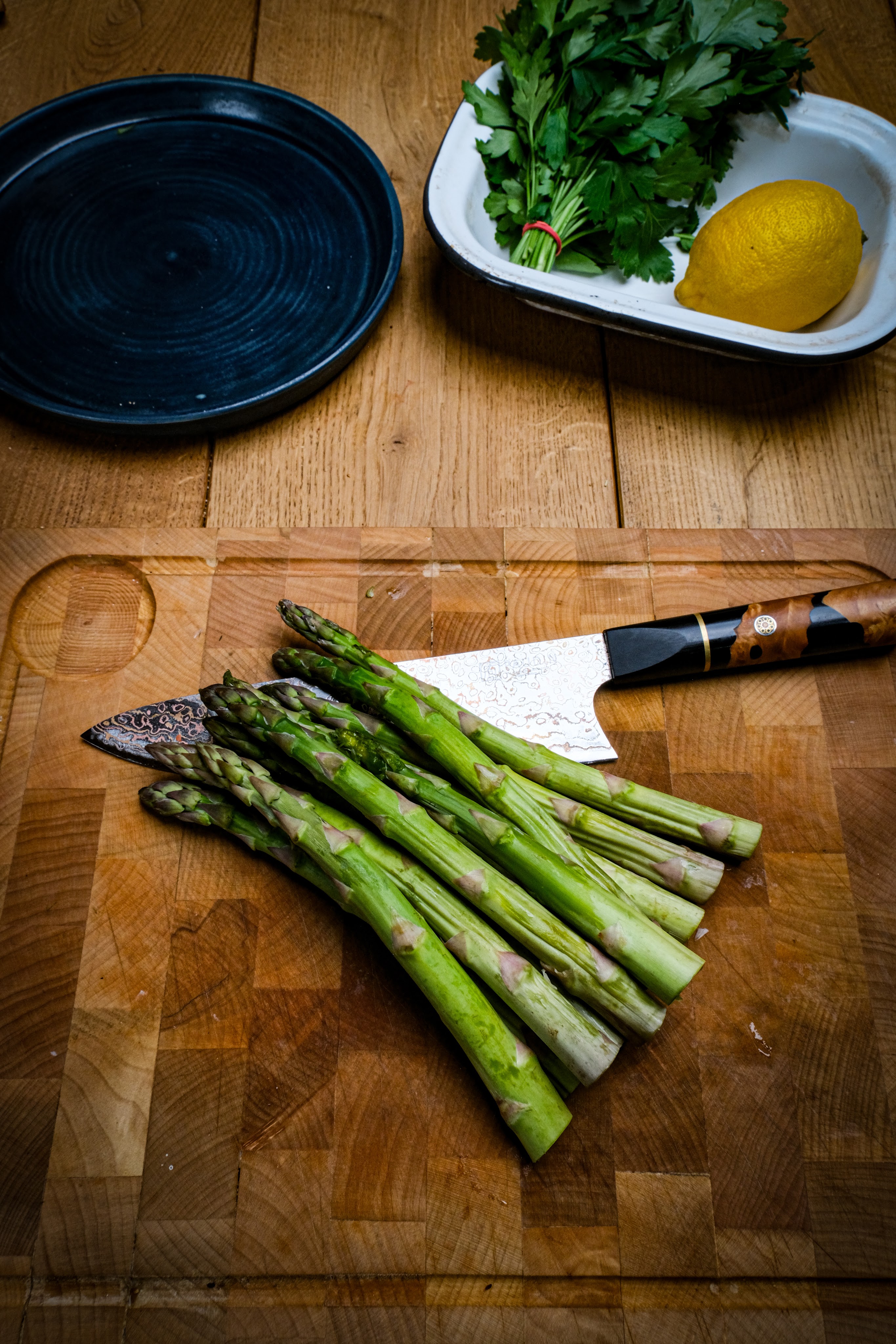 Serveer de pan nu lekker midden op tafel met de asperges in een schaal erbij. Eetsmakelijk.