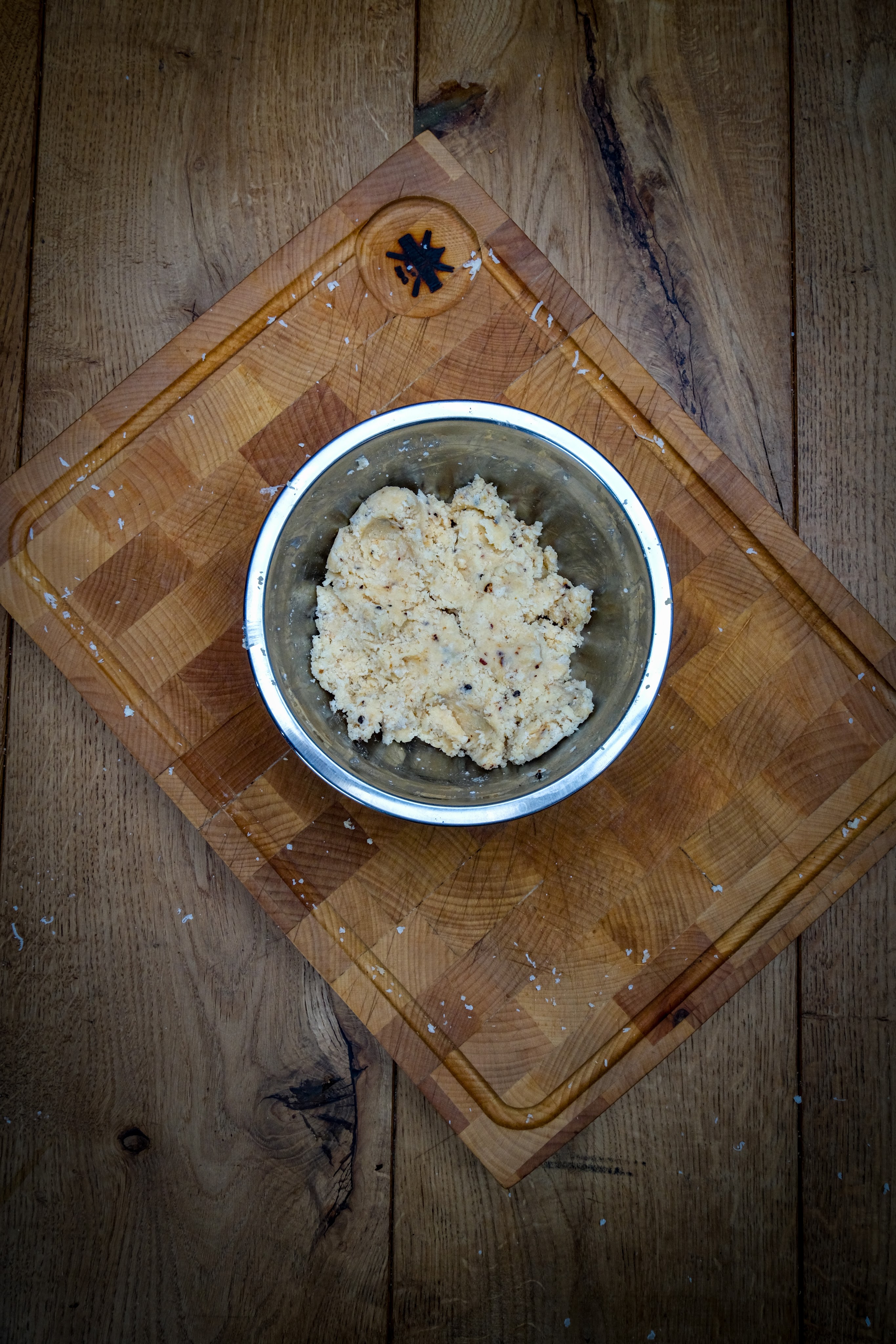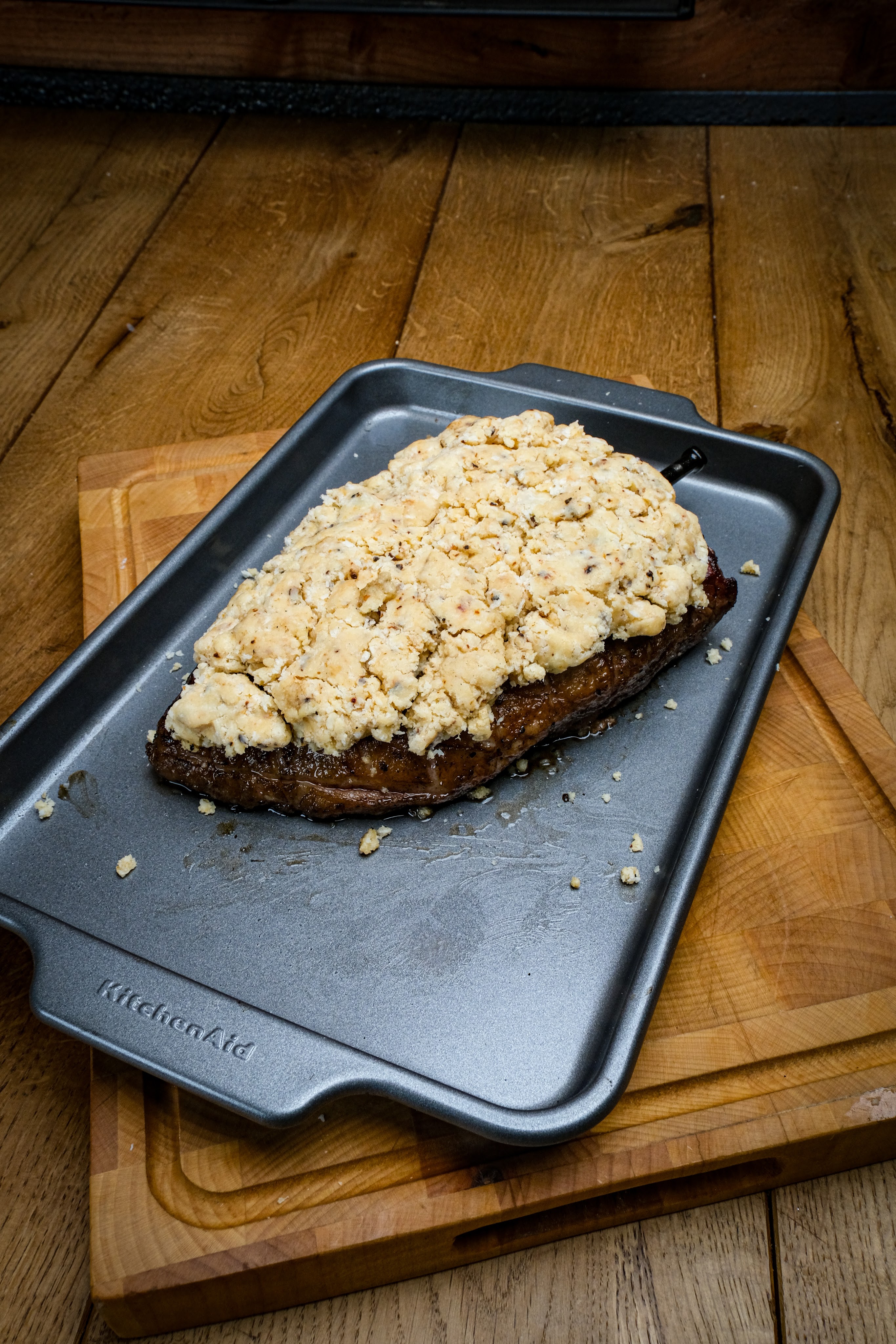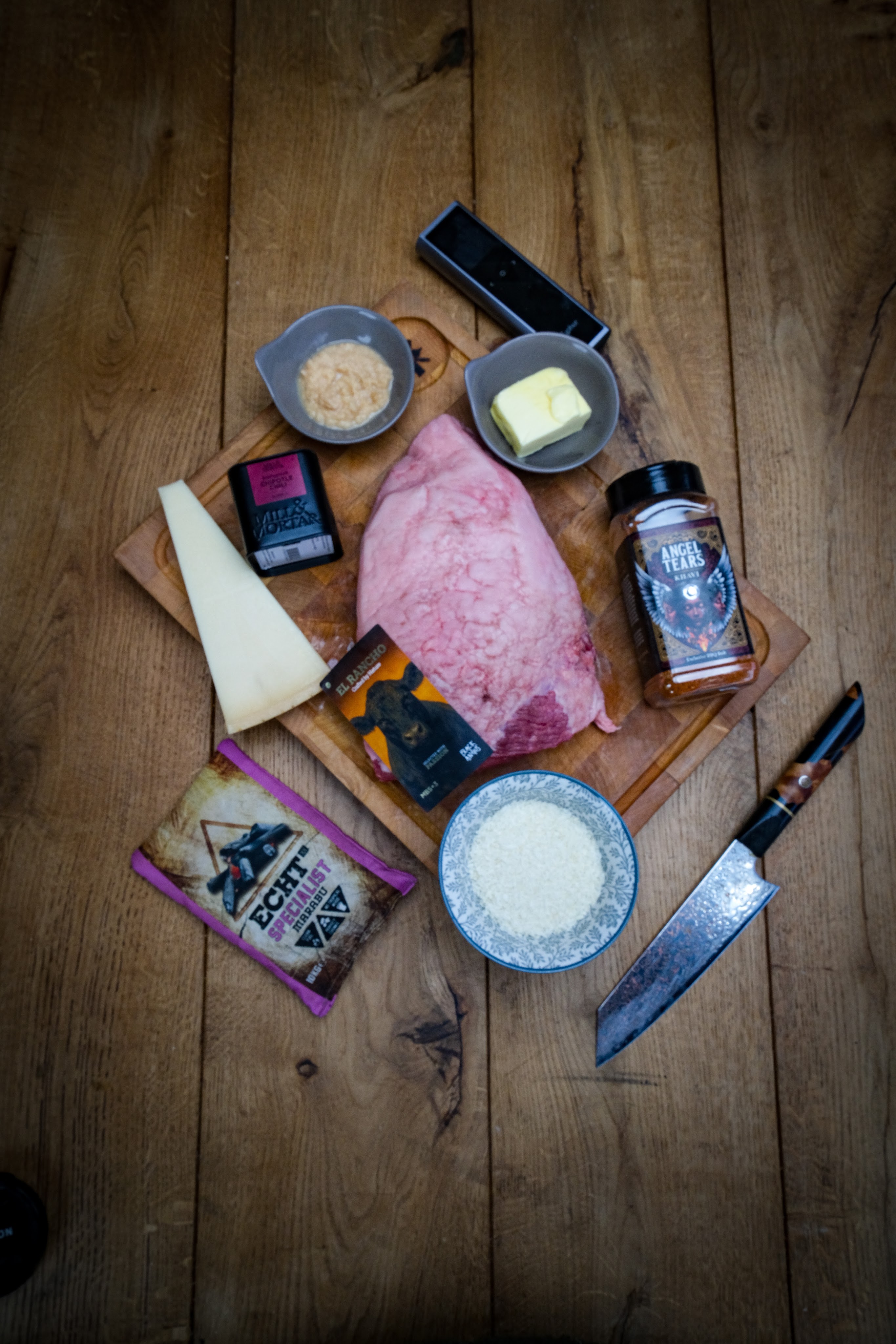 We beginnen met het insnijden van de vetkant doe dit kruislings en zorg dat je niet in het vlees snijdt. Doe nu de rub aan de vleeskant en royaal zout op de vetkant. Grill de picanha nu direct boven de kolen met de vetkant naar beneden tot deze een mooie korst heeft. Draai dan de picanha om en gaar zachtjes aan de vleeskant om deze mooi te sluiten. Maak ondertussen de korst door de kaas te raspen en deze dan te mengen met de knoflook, pank, chiptole en boter. Als de picanha mooi aan alle kanten is gegrild haal hem dan even van de bbq en doe dan de korst mengsel op de vetkant mooi verdeeld. Leg de picanha dan terug op de bbq aan de indirecte zijden eb gaar deze dan tot een kern van 48 graden. Haal hem dan van de bbq en laat minimaal 10 minuten rusten voor het snijden.