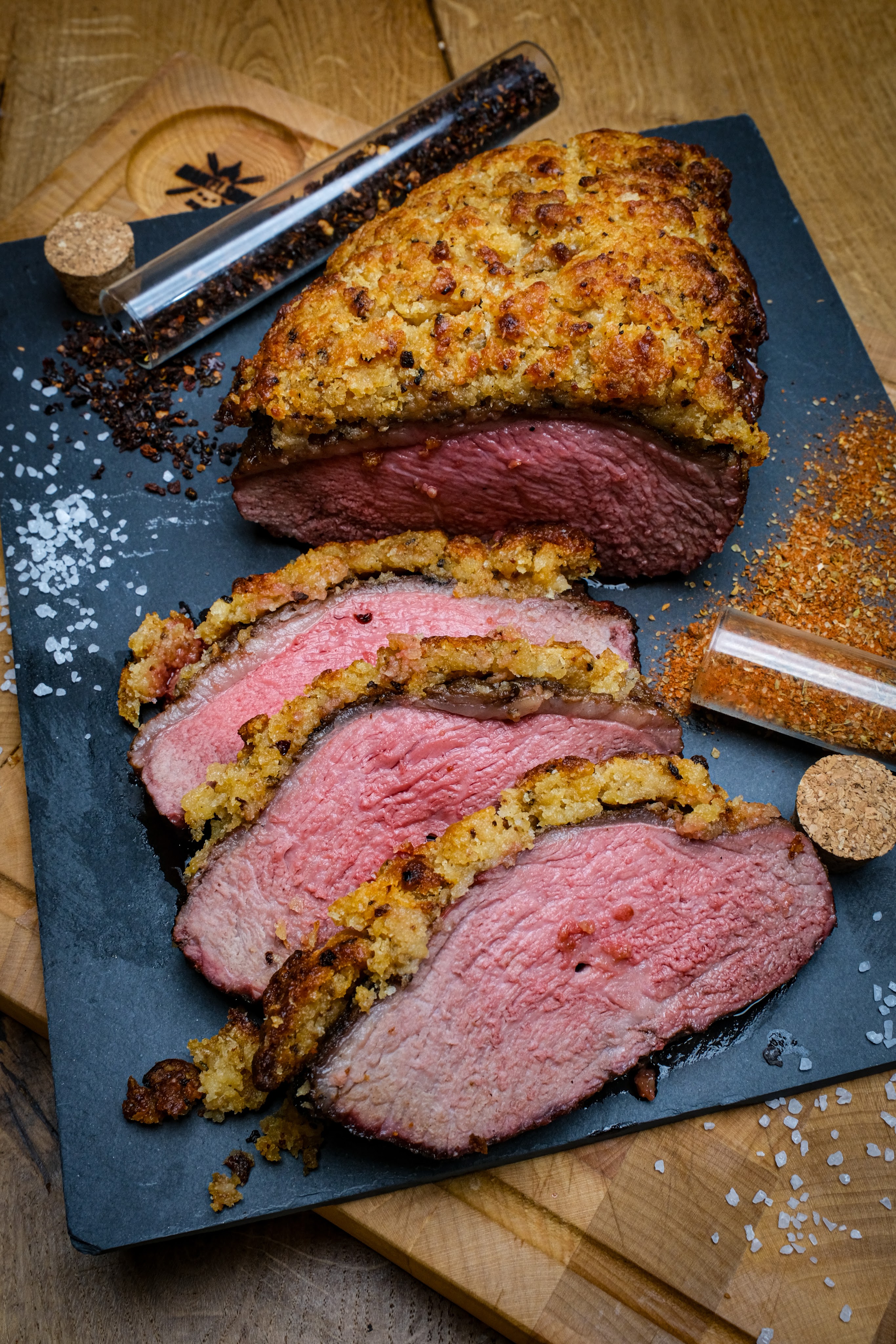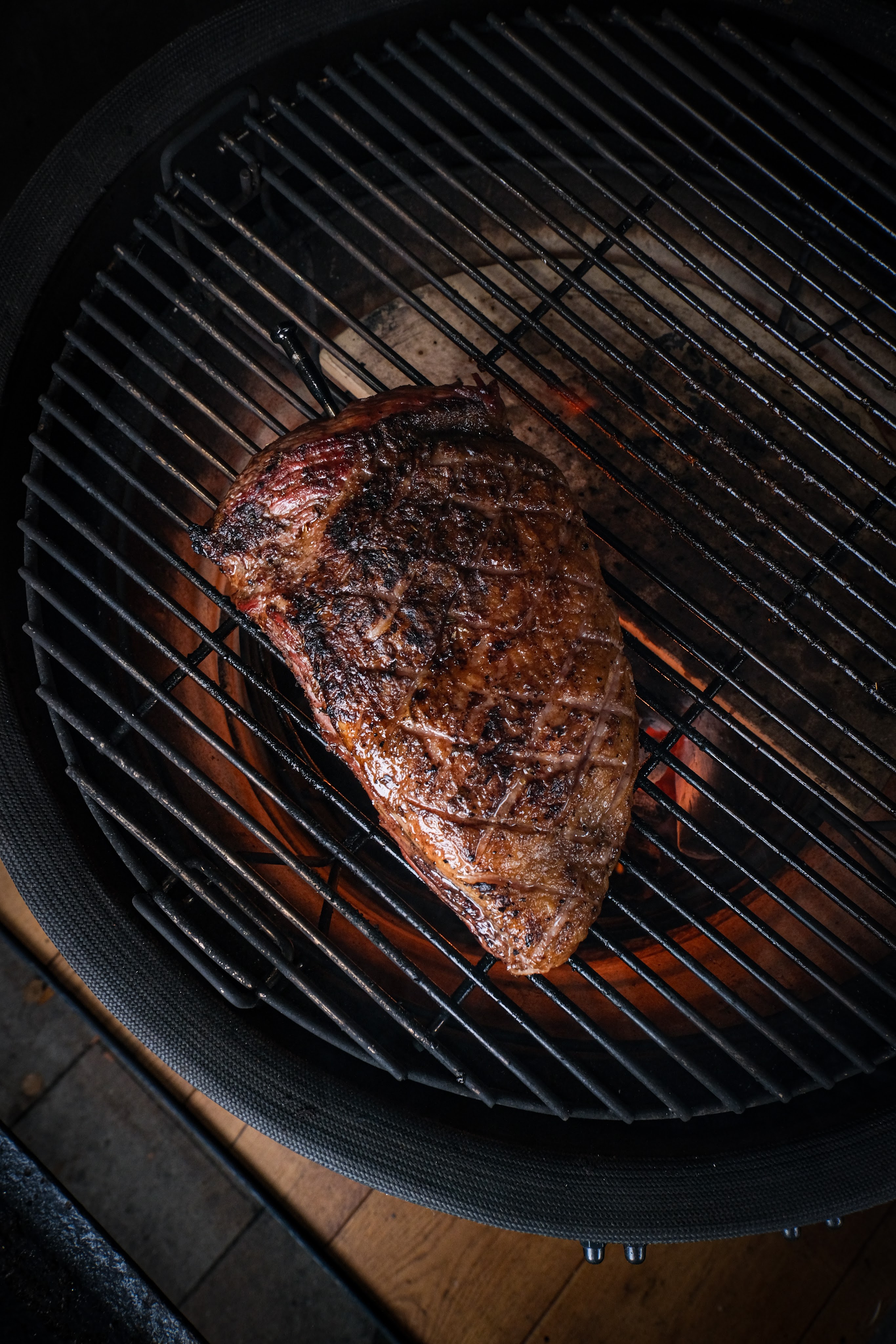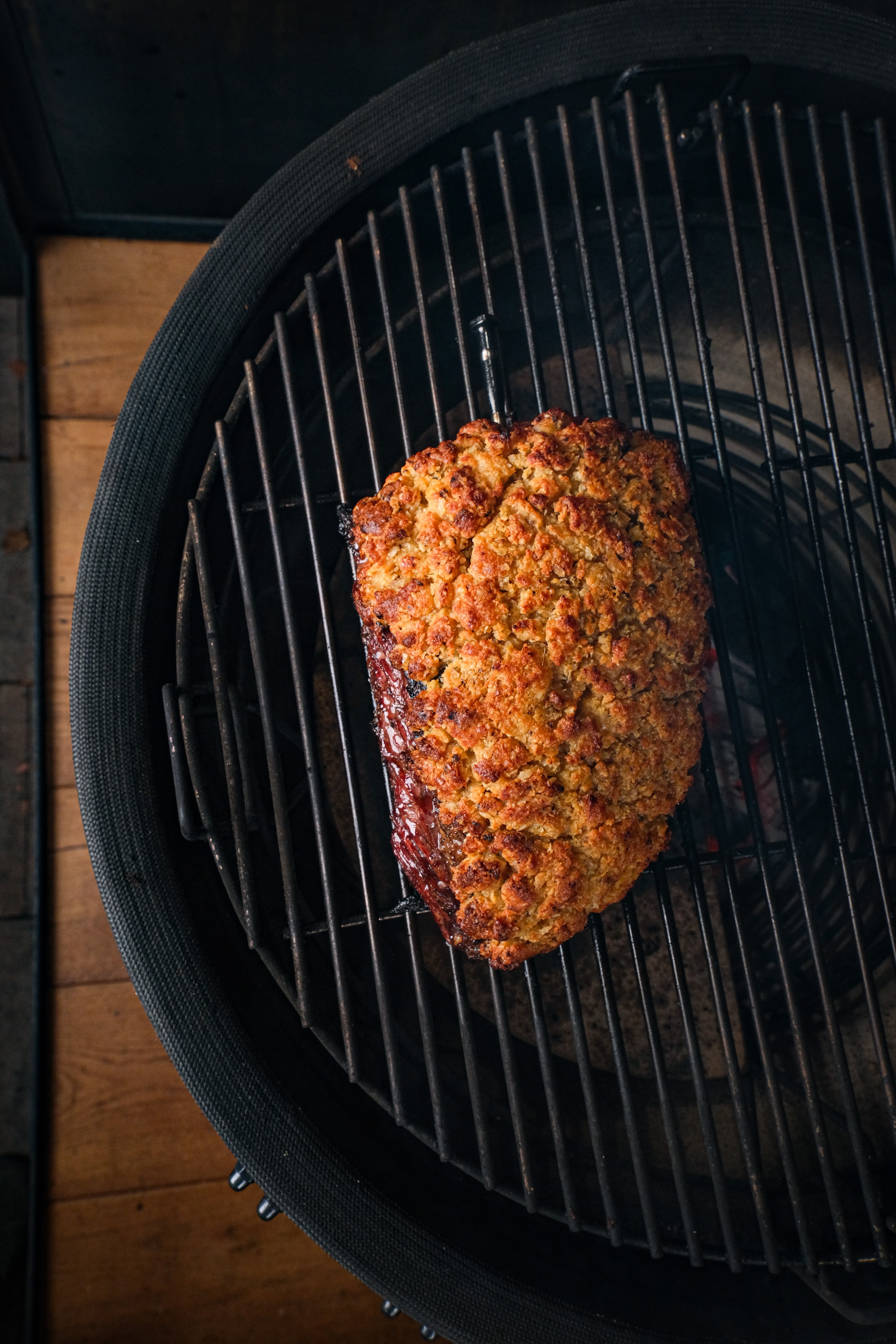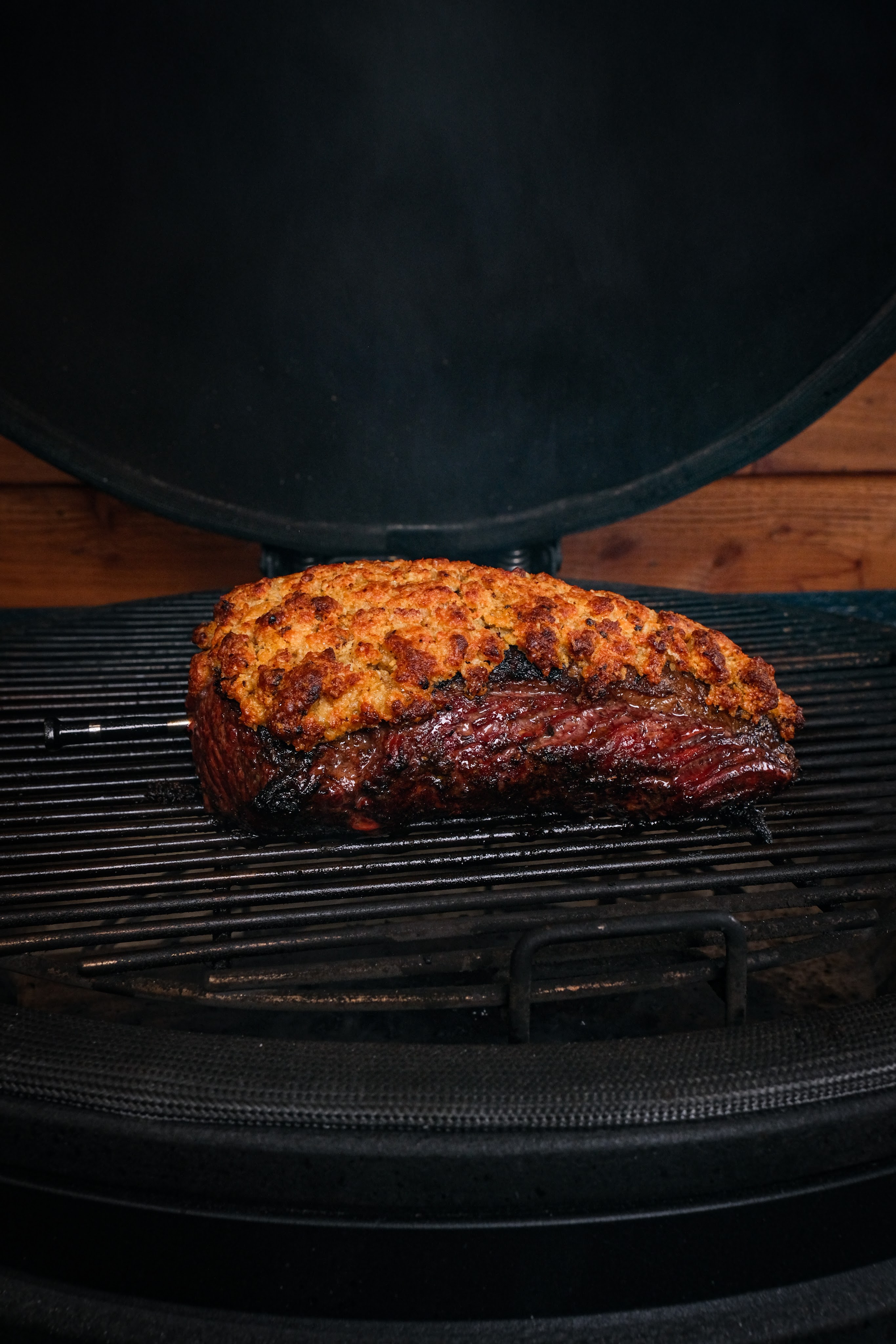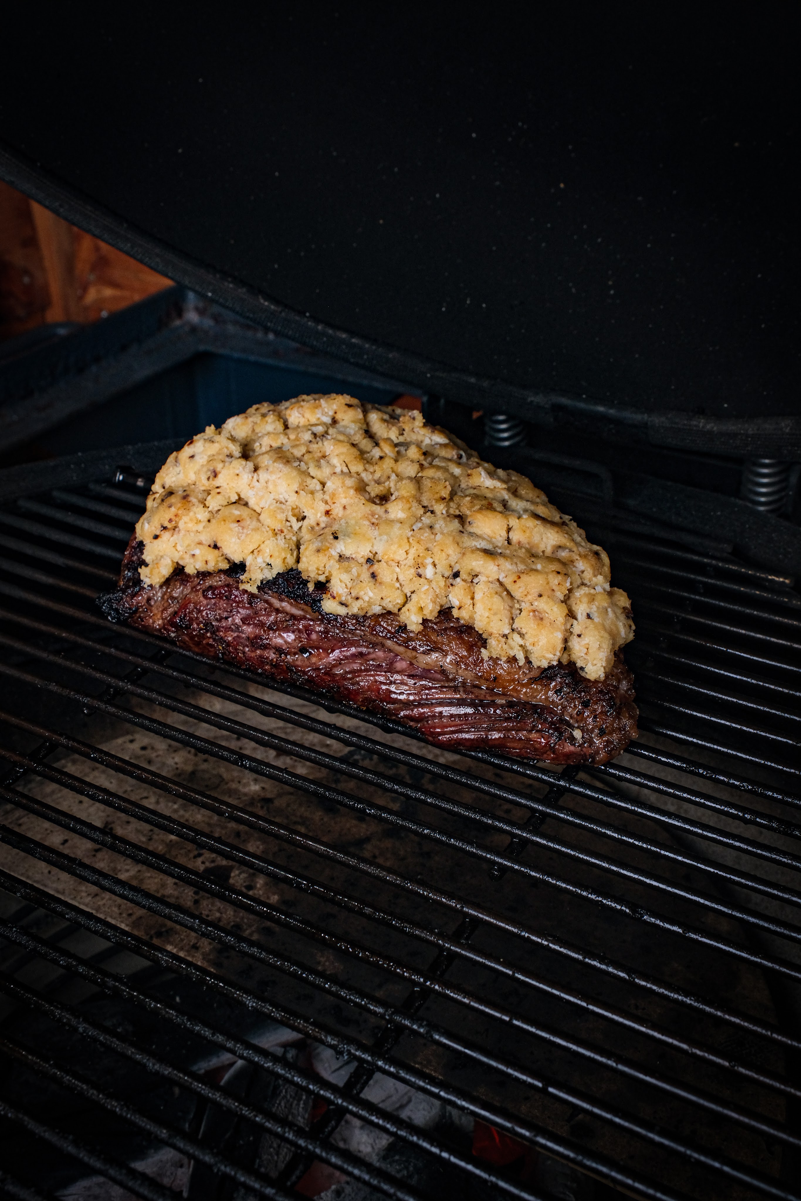 Picanha met knoflookkorst is een gerecht waarbij eenvoud en techniek samenkomen. Eerst wordt de picanha hard gegrild op de vetkant voor smaak en structuur daarna kort op de vleeskant. Vervolgens gaat er een krokante korst op van panko, pecorino romano, boter, knoflook en chipotle chili. Door het vlees daarna indirect verder te garen smelt het vet langzaam en krijgt de korst de tijd om mooi goudbruin en knapperig te worden. Het resultaat is sappig rundvlees met een volle hartige korst en net dat subtiele rokerige pitje van chipotle.