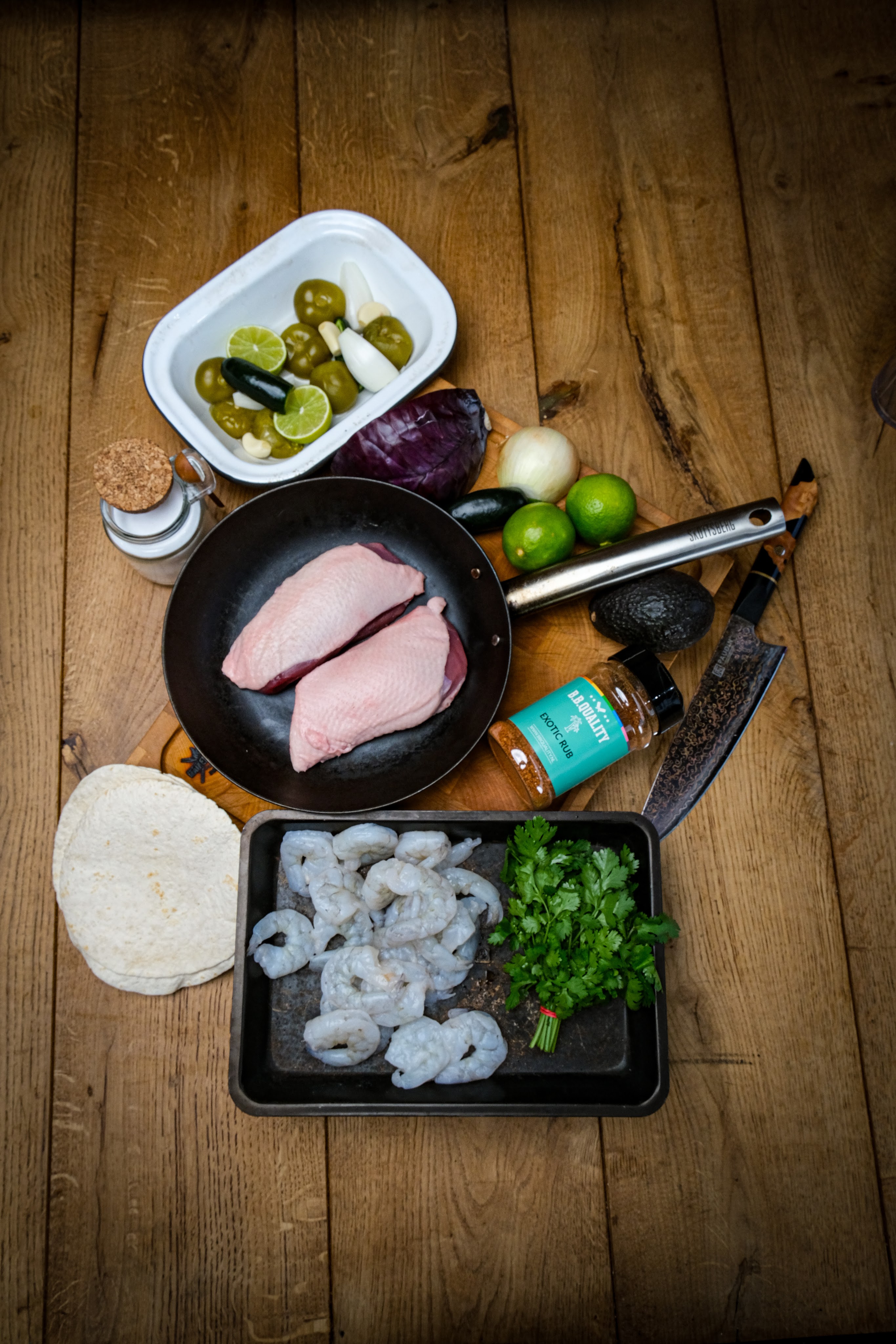 We beginnen met de salsa verde hiervoor doen we de tomatillo’s, knoflook, 1 schoongemaakte jalapeno, halve zoete ui en 1 limoen door de midden in een schaal. Zet deze nu op de indirecte kant op de bbq en laat deze roosteren tot alles een mooi kleurtje heeft. doe nu dat alles behalve de limoen in een blender met de koriander en knijp de limoen boven de blender uit. Mix nu alles in een blender tot een mooie salsa en breng op smaak met zout. Snij nu de rode kool en de andere helft van de ui dun en meng dit met de sap van 1 limoen en een beetje zout en zet apart. Snij nu het vet van de eendenborst kruislings in en doe wat zout op de vet kant en draai de eendenborst om en doe daar de exotic rub op. Meng de garnalen met wat van de rub en olijfolie. Leg de eend met de huid naar beneden in een skillet en zet deze op de directe zijde van de bbq en laat deze rustig op temperatuur komen. Bak nu op de huid kant tot deze mooi krokant en uitgebakken is draai ze dan om en bak ze nu verder tot een kern van 52 graden en haal ze dan van de bbq. grill nu de garnalen op de directe zijden tot deze ook mooi gegrild zijn en grill ook de taco’s kort.
