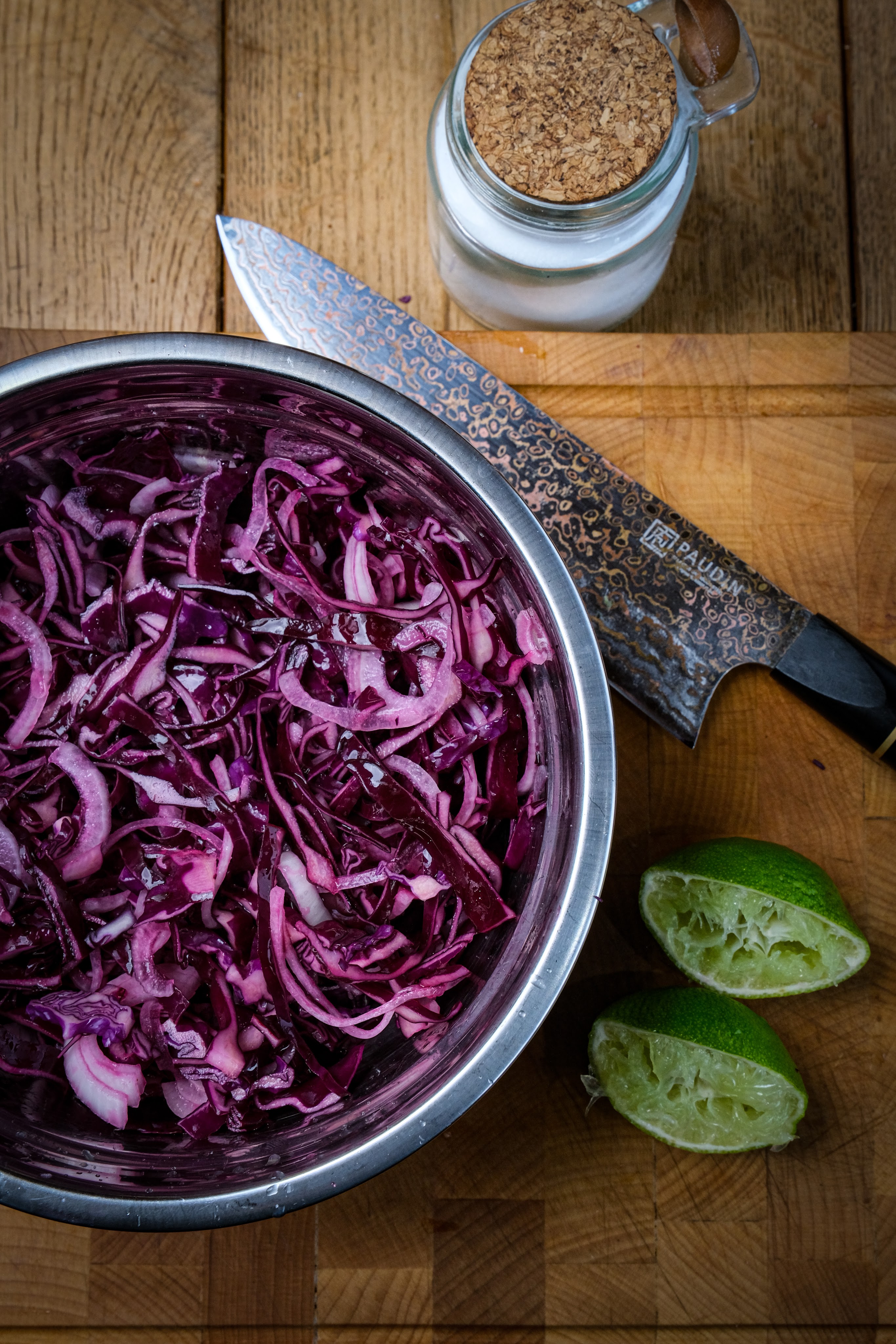 Snij nu de eend in mooi plakken. Verdeel nu de koolsalade over de taco’s en verdeel hierover de eend en garnalen. Doe nu over elke taco wat van de salsa verde. Eetsmakelijk.