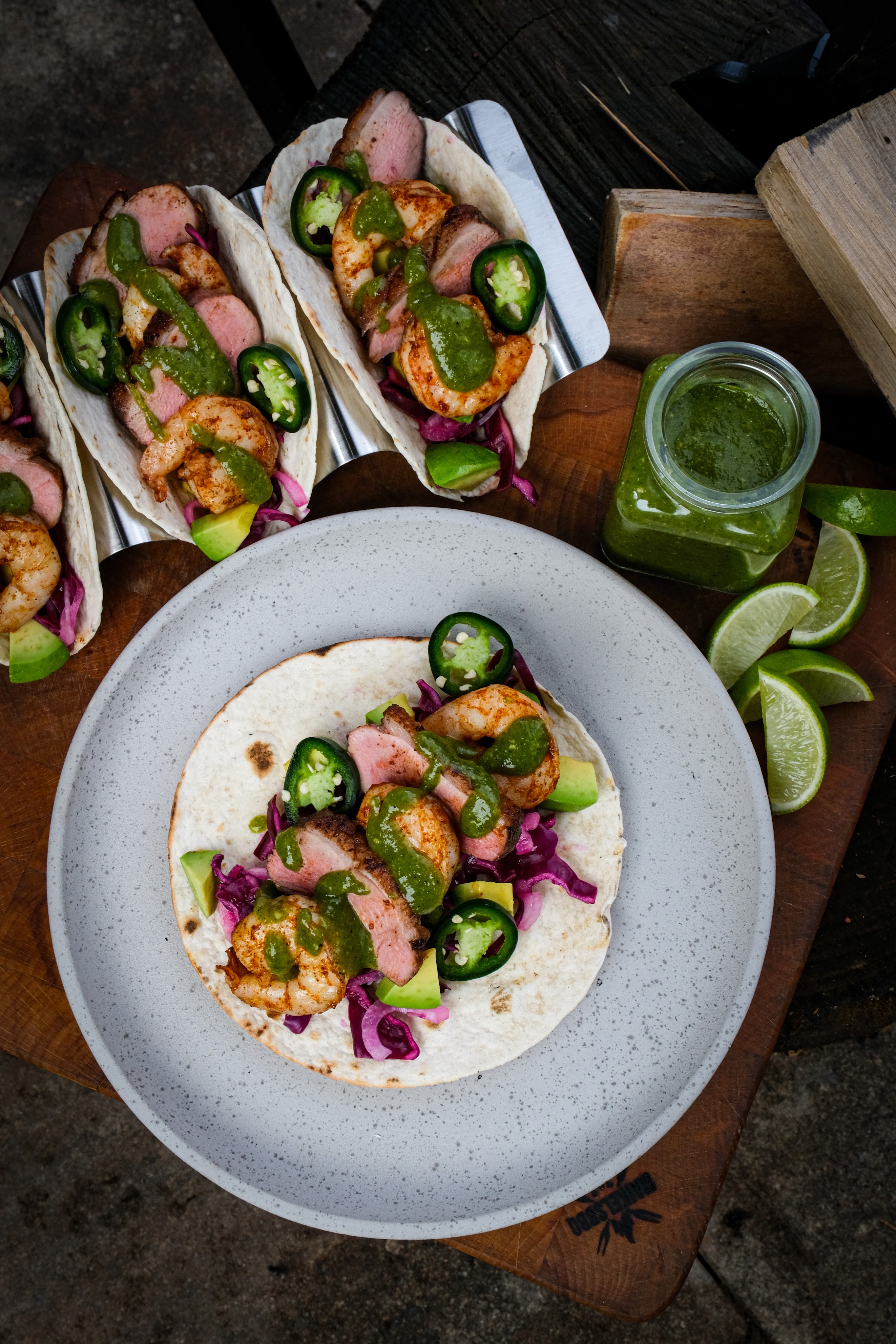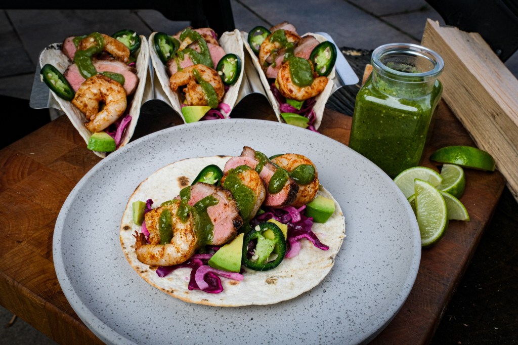 Surf en turf krijgt een compleet nieuwe twist in deze taco’s van gegrilde eendenborst en sappige garnalen van de BBQ. De rijke smaak van de eend combineert verrassend goed met de kruidige garnalen, frisse rodekoolsalade en een zelfgemaakte salsa verde van geroosterde tomatillo, jalapeño en limoen. Alles komt samen in een warme tortilla voor een taco die tegelijk fris, pittig en vol BBQ smaak is. Perfect als zomers BBQ gerecht of als indrukwekkende taco night van de grill.