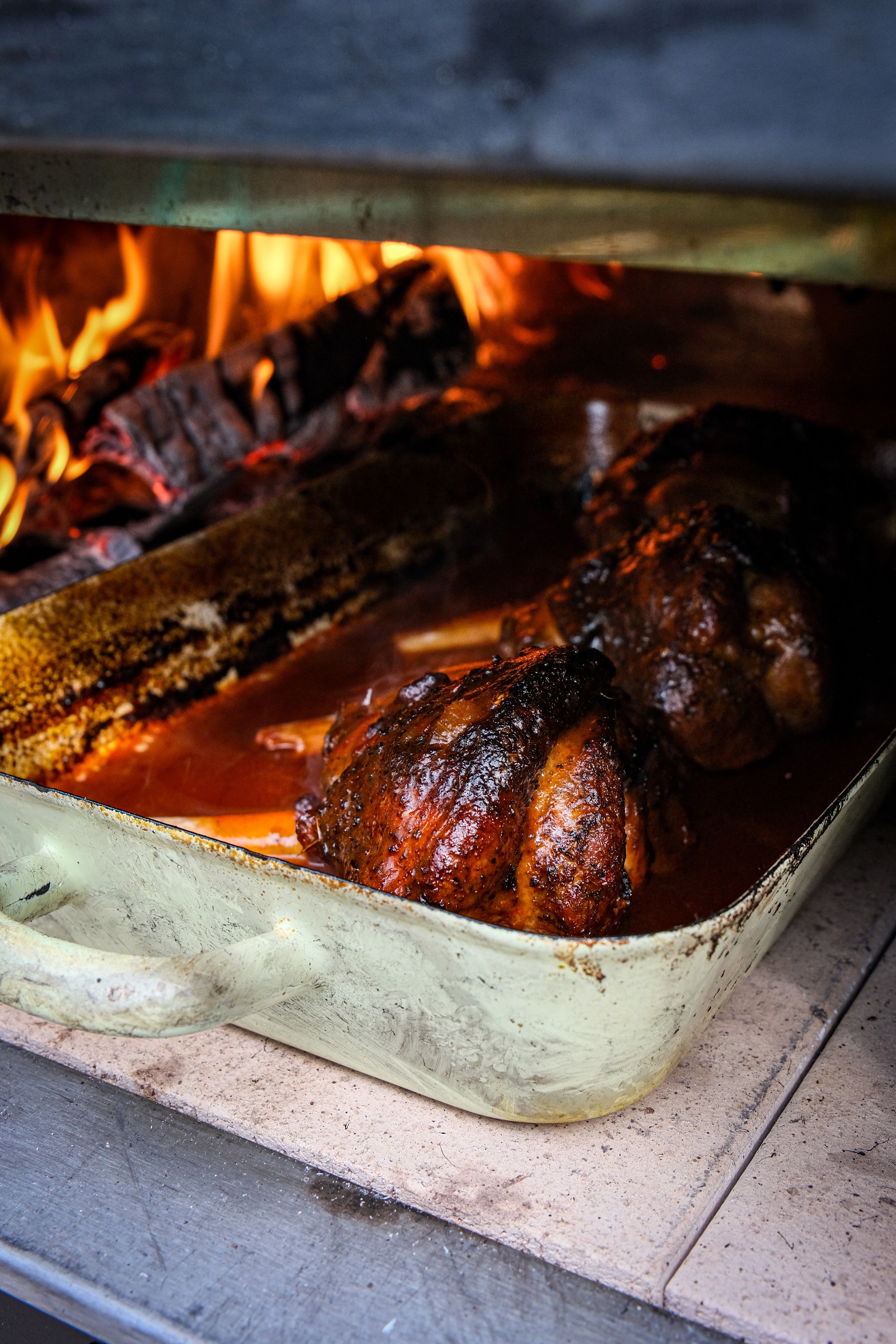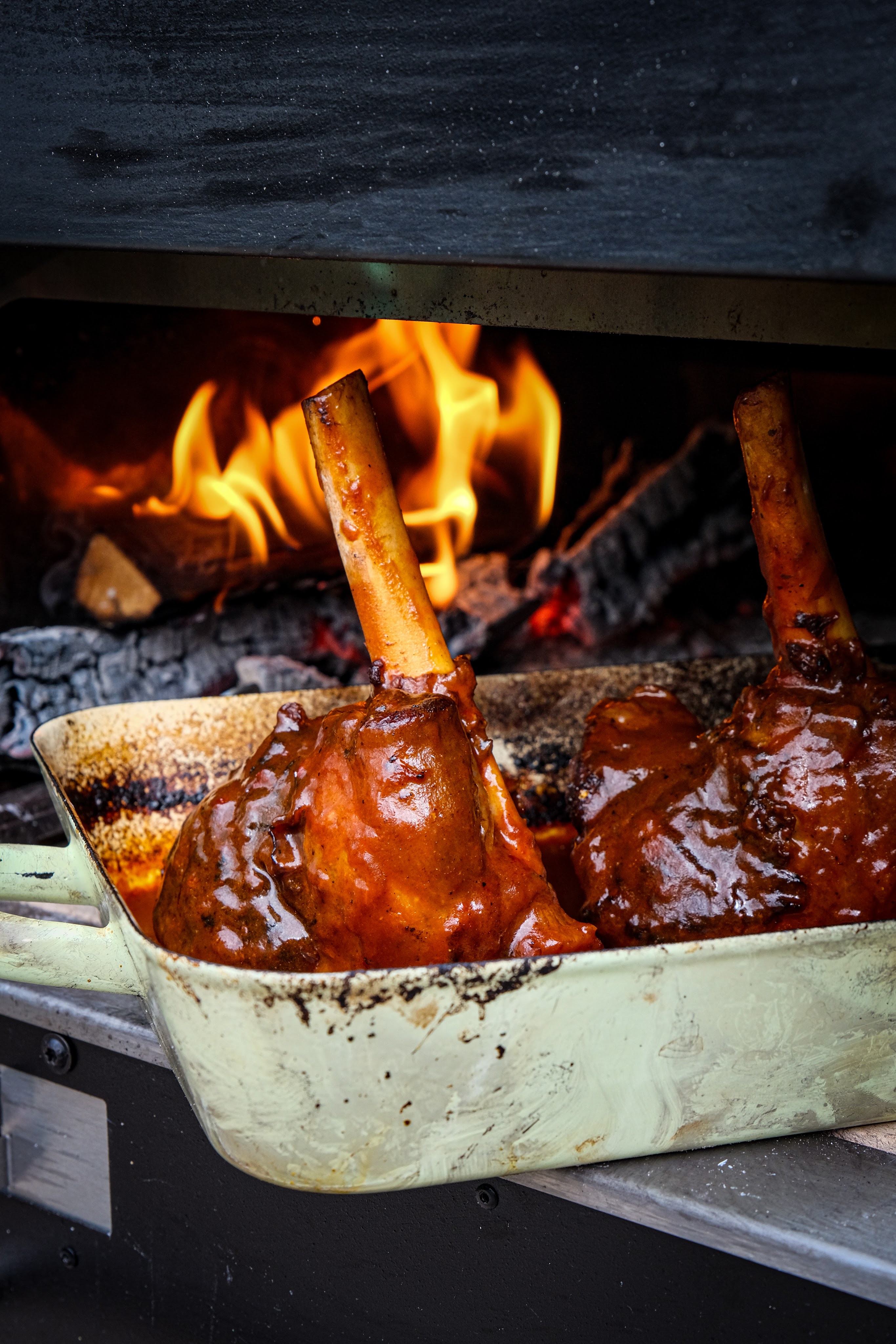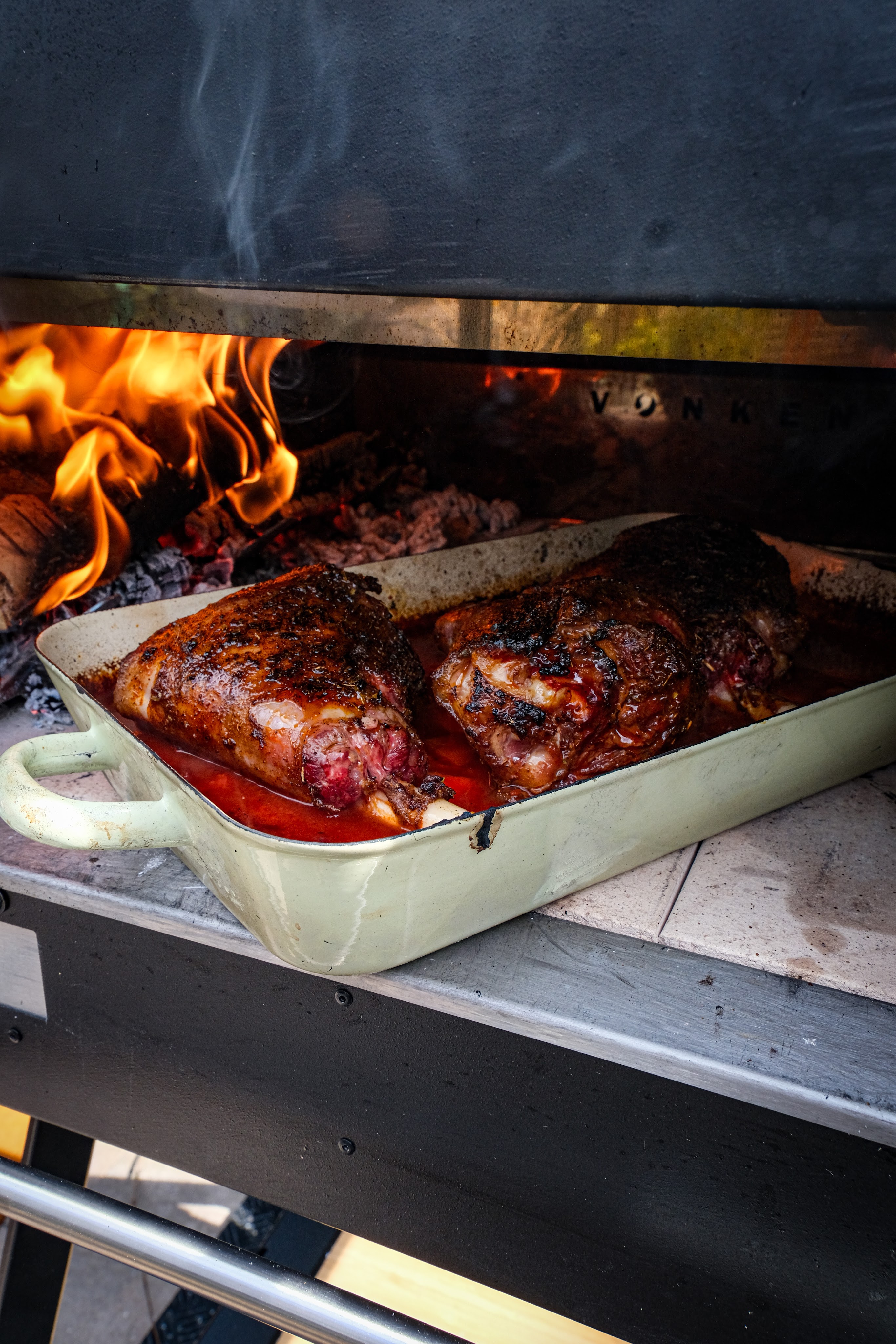 Lamschenkels zijn misschien wel een van de mooiste stukken vlees om langzaam te garen. In de houtoven krijgen ze alle tijd om rustig naast het vuur te stoven waardoor het vlees langzaam boterzacht wordt en bijna vanzelf van het bot valt.