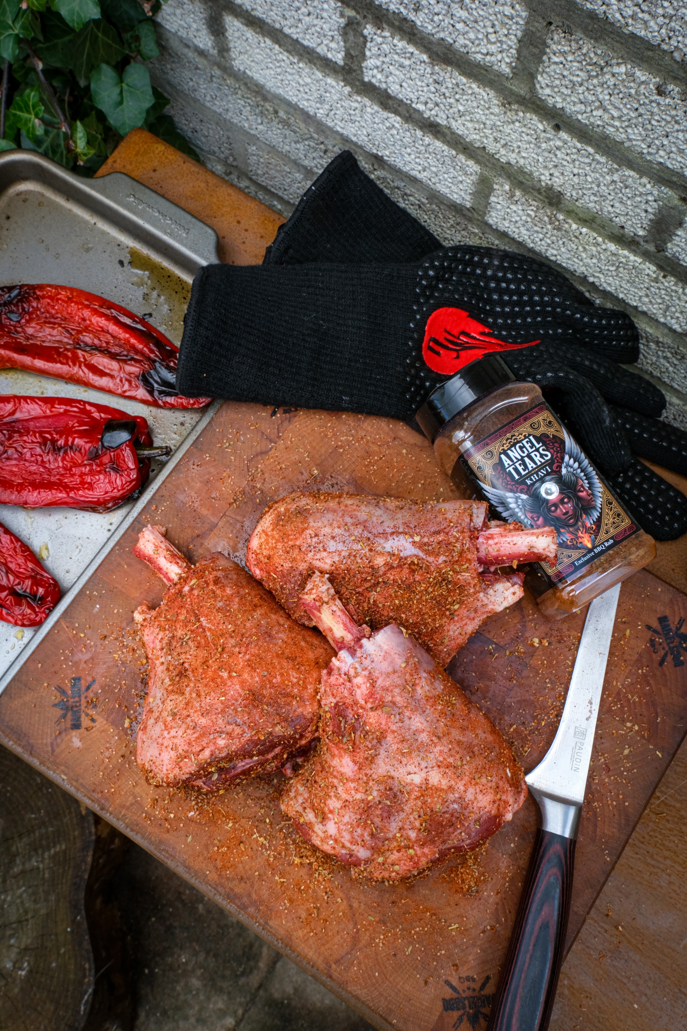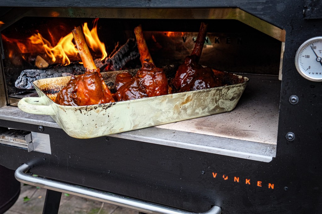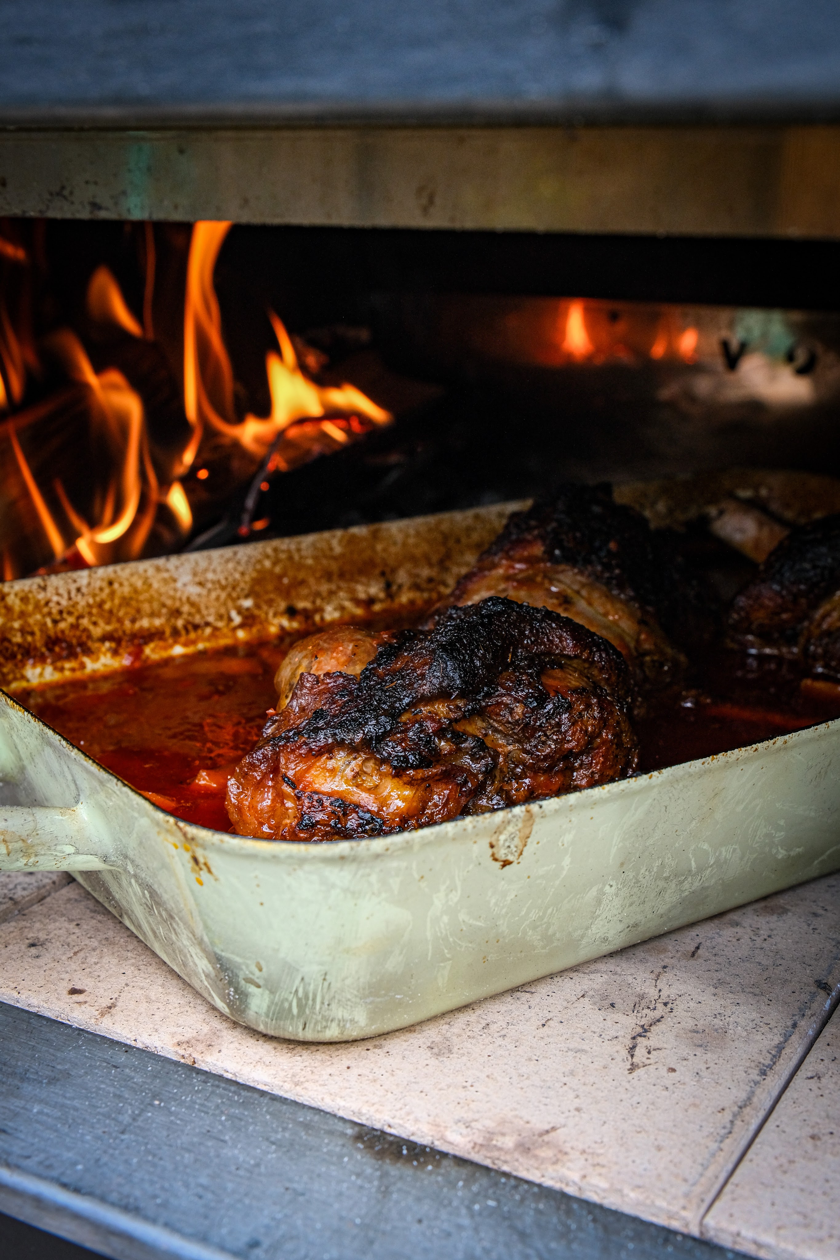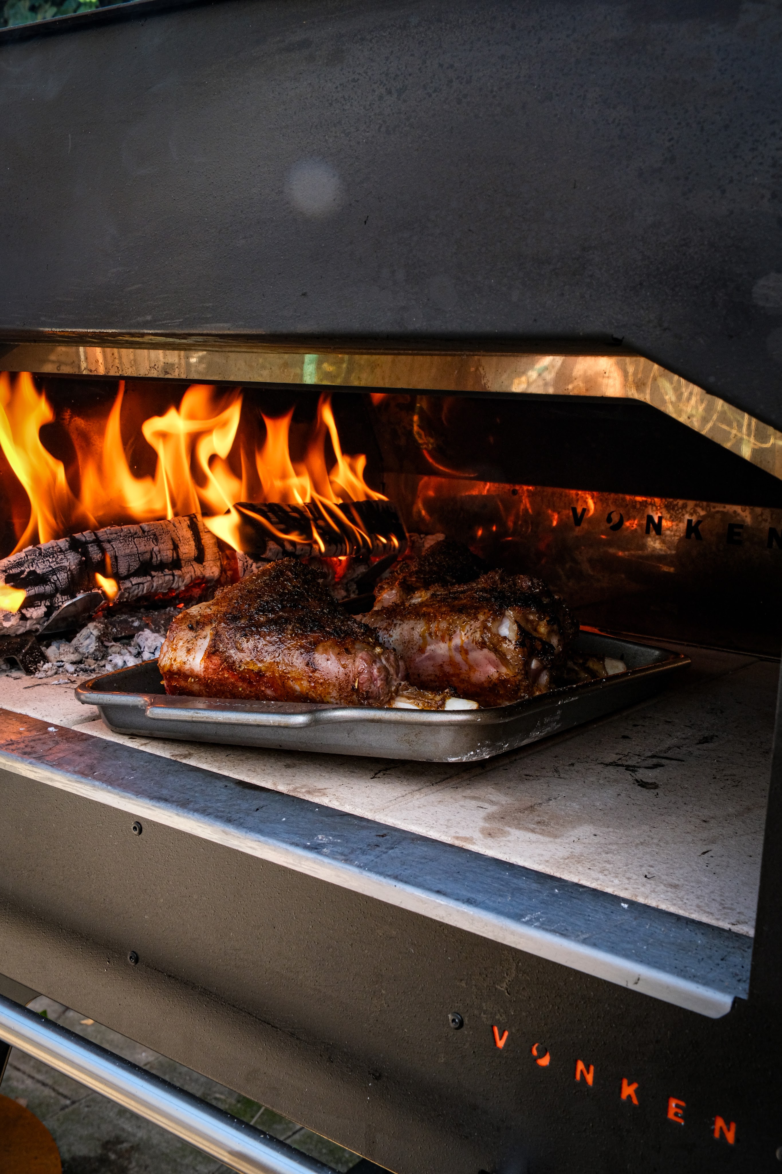 Lamschenkels zijn misschien wel een van de mooiste stukken vlees om langzaam te garen. In de houtoven krijgen ze alle tijd om rustig naast het vuur te stoven waardoor het vlees langzaam boterzacht wordt en bijna vanzelf van het bot valt.